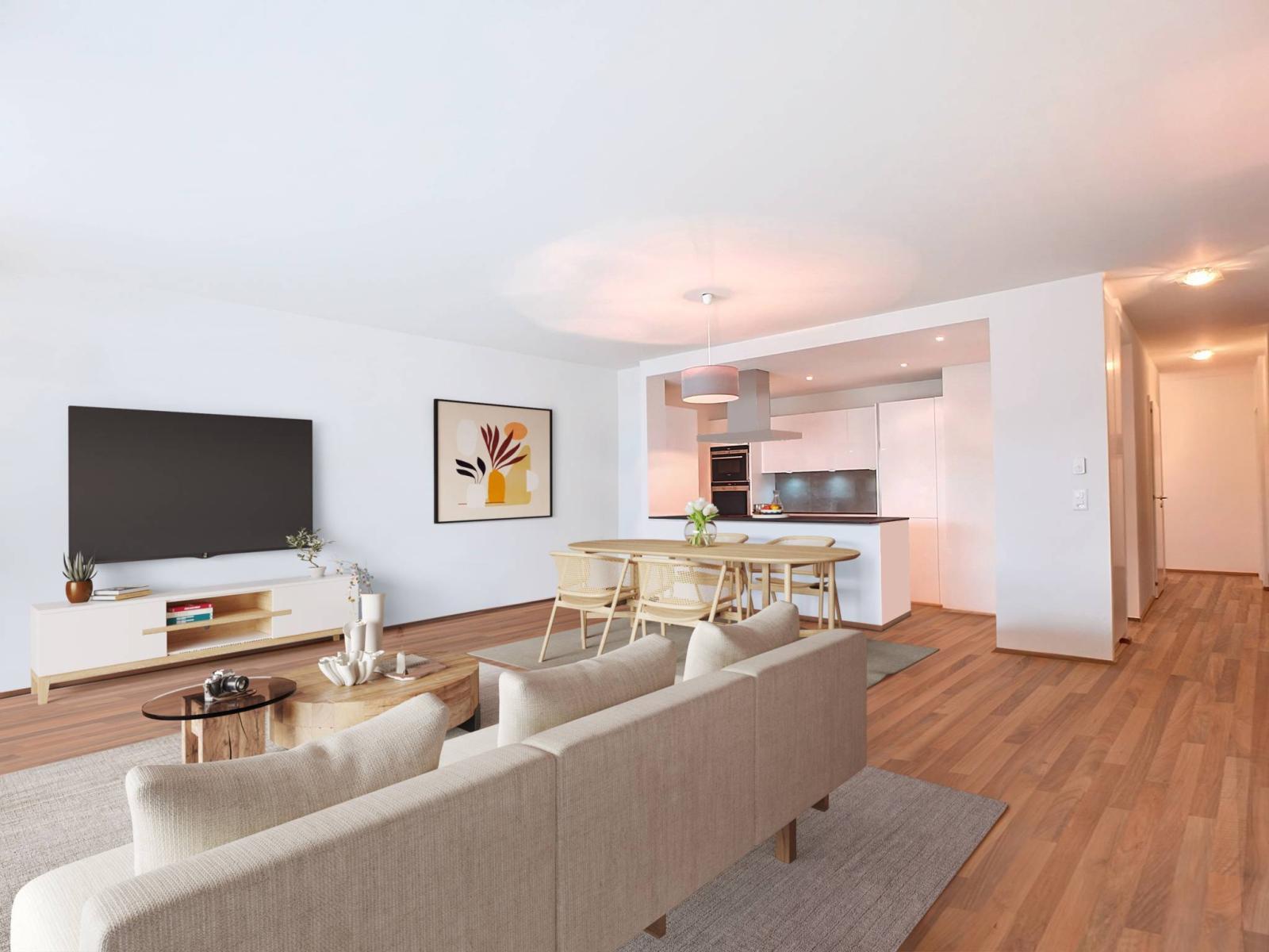 Schlicht und modern im Stil bietet diese 4,5-Zimmer-Wohnung eine Wohnfläche von ca. 117,5 m² und hohe Decken. Es verfügt über einen Eingangsbereich mit Wandschränken, der Zugang zur sehr gut ausgestatteten Küche, zum Wohn-/Esszimmer sowie zum großzügigen Balkon von ca. 27 m² bietet. Die Wohnung verfügt über eine Mastersuite mit angrenzendem Duschbad/WC, zwei Schlafzimmer, ein Duschbad/WC mit Waschsäule und ein Badezimmer/WC.