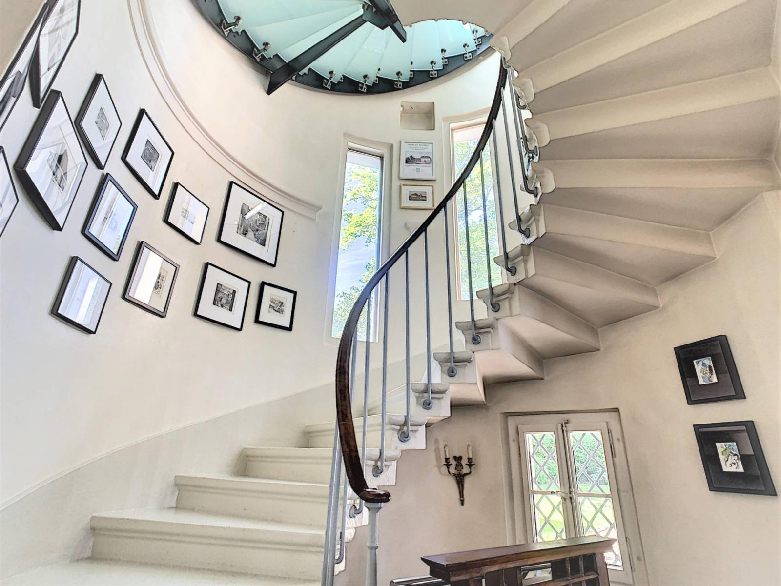 Die oberen Stockwerke sind über die Wendeltreppen des Turms erreichbar und bieten 5 Schlafzimmer, ein Büro und mehrere Badezimmer.