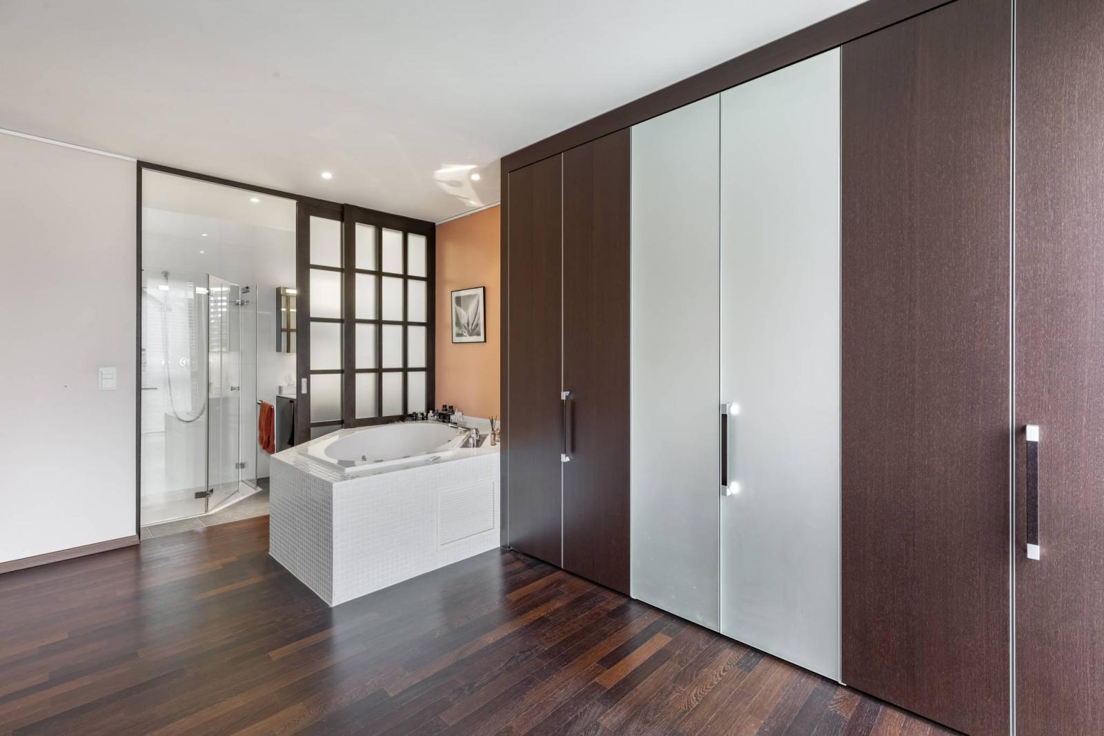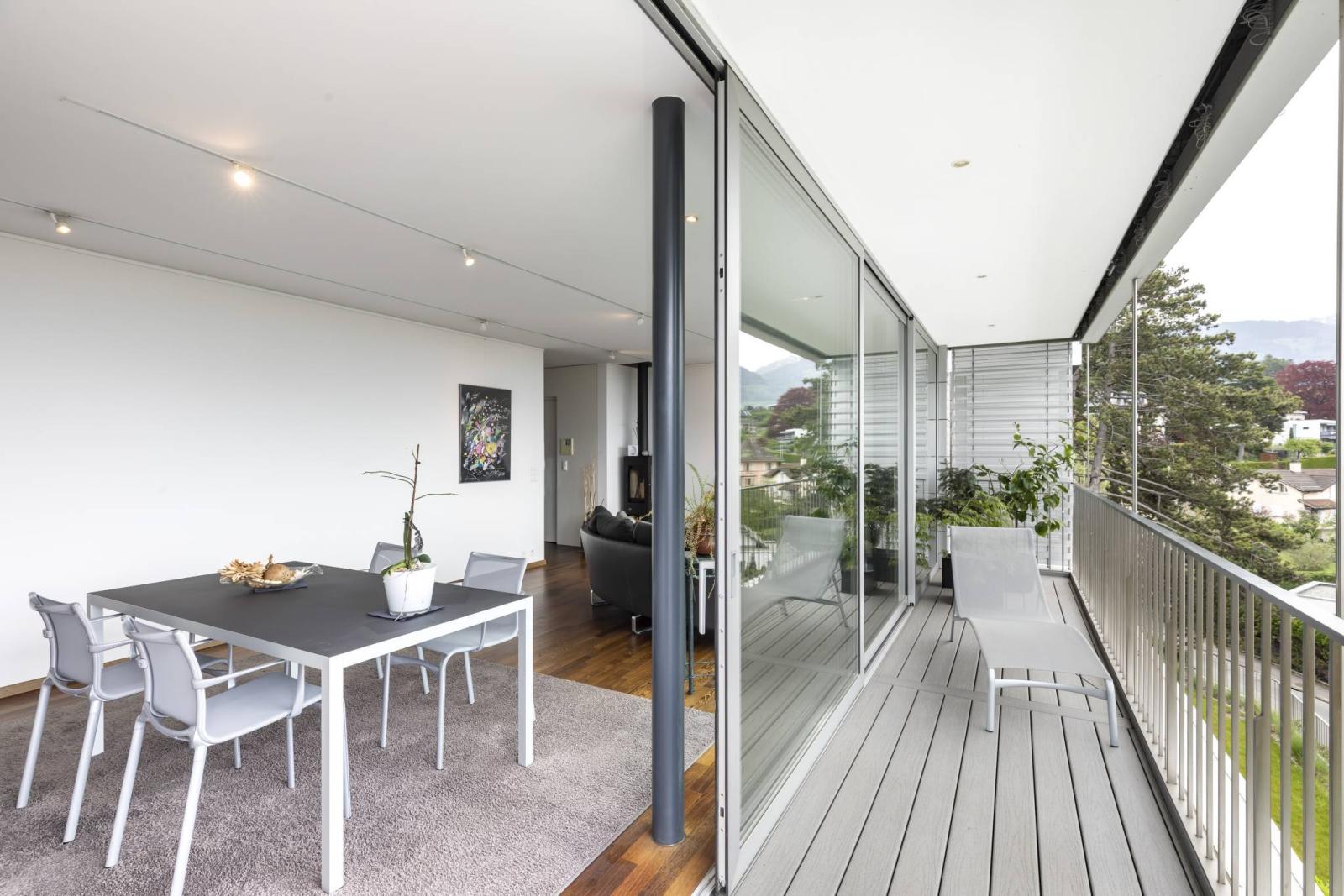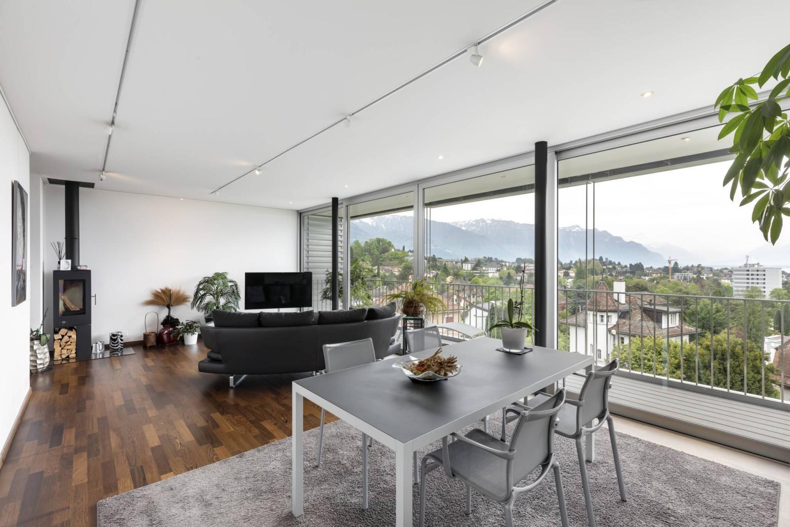 Dieses prächtige Penthouse mit zeitgenössischer Architektur befindet sich in Vevey und nimmt eine beherrschende Stellung ein, sodass Sie von einem herrlichen Blick auf den See und die Berge profitieren können.