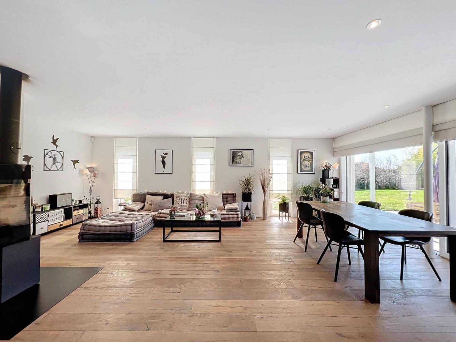Im Erdgeschoss empfängt Sie ein großes Wohn-/Esszimmer mit Kamin. Es kommuniziert mit einer sehr schönen offenen Einbauküche, erweitert um eine Speisekammer. Die Oberflächen sind gepflegt und von guter Qualität: Granitarbeitsplatte, der sehr schöne Holzparkettboden schafft eine warme Atmosphäre.