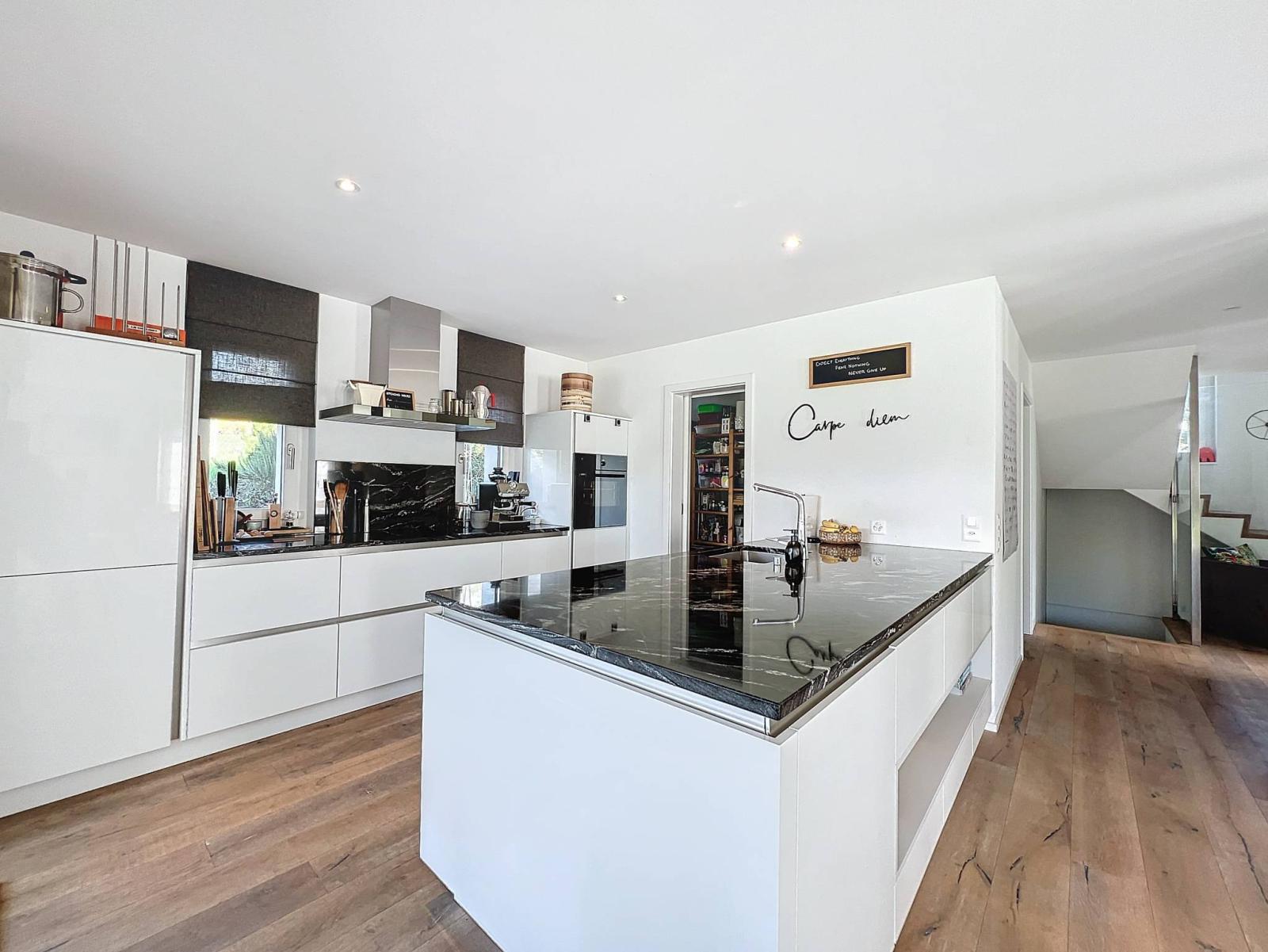 Das sehr schöne Grundstück und seine Terrasse schmücken das Haus angenehm. Eine Doppelgarage mit automatischem Tor und Ladestation für Elektroautos rundet diese sehr schöne freistehende Villa ab.