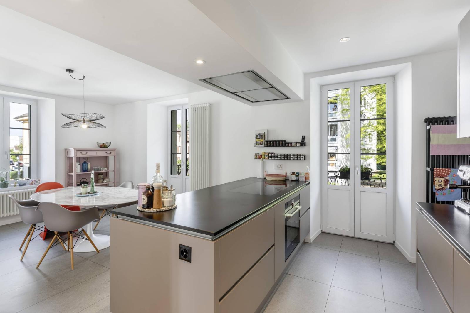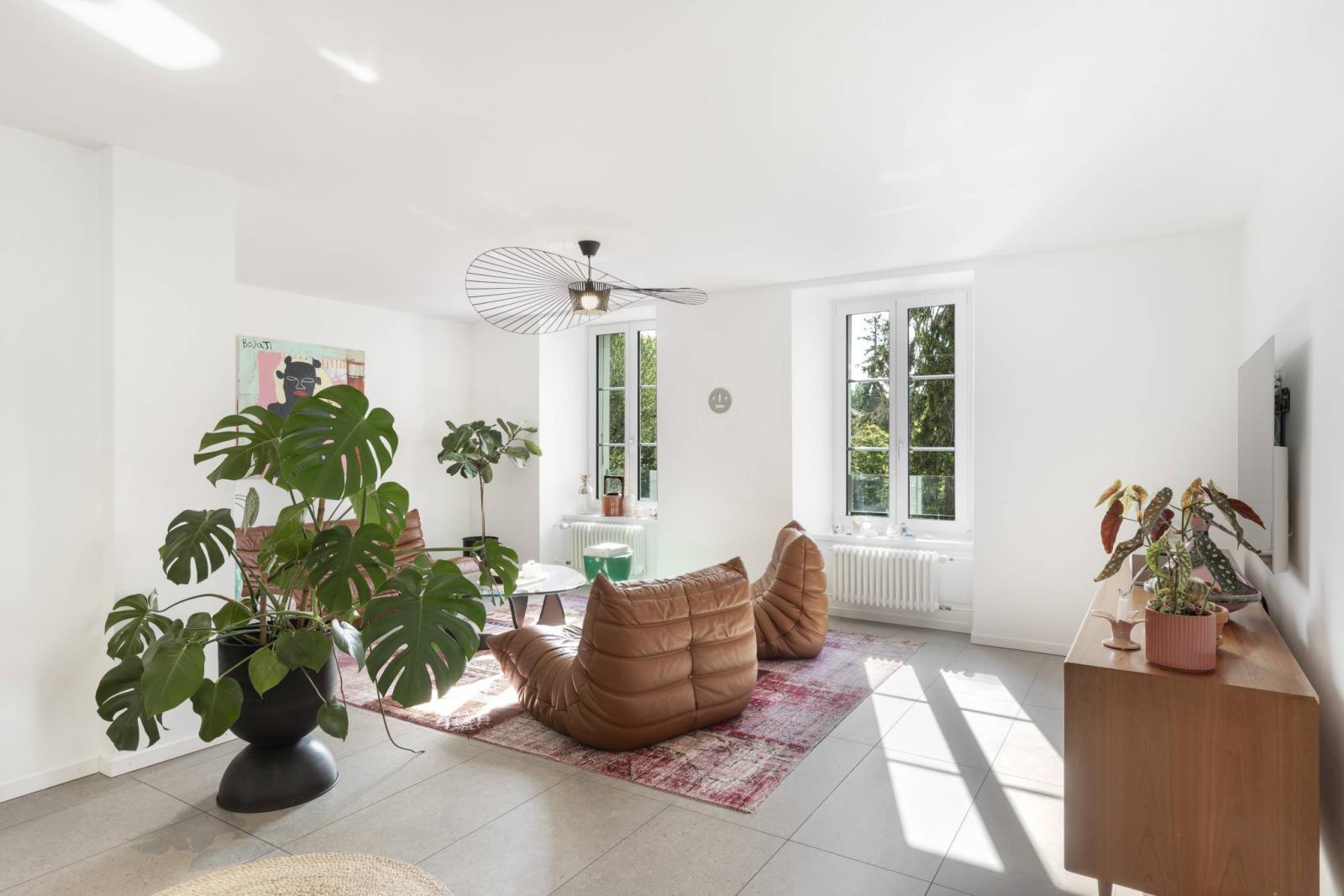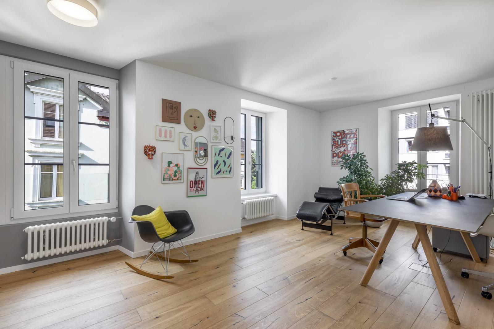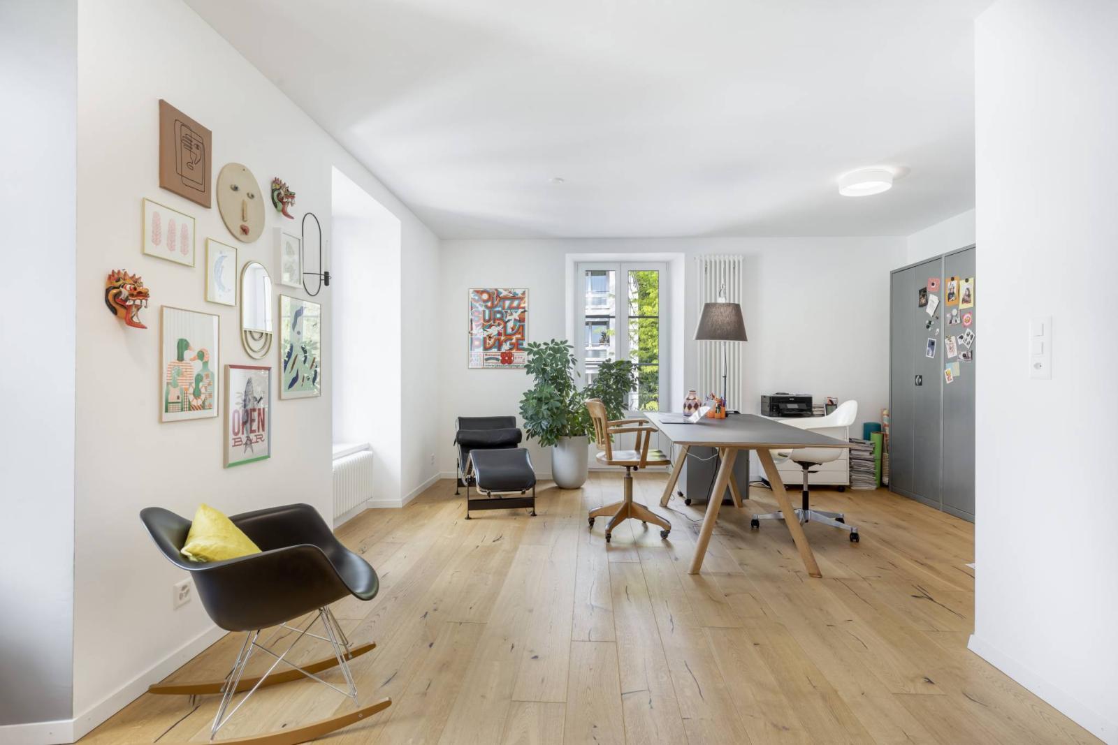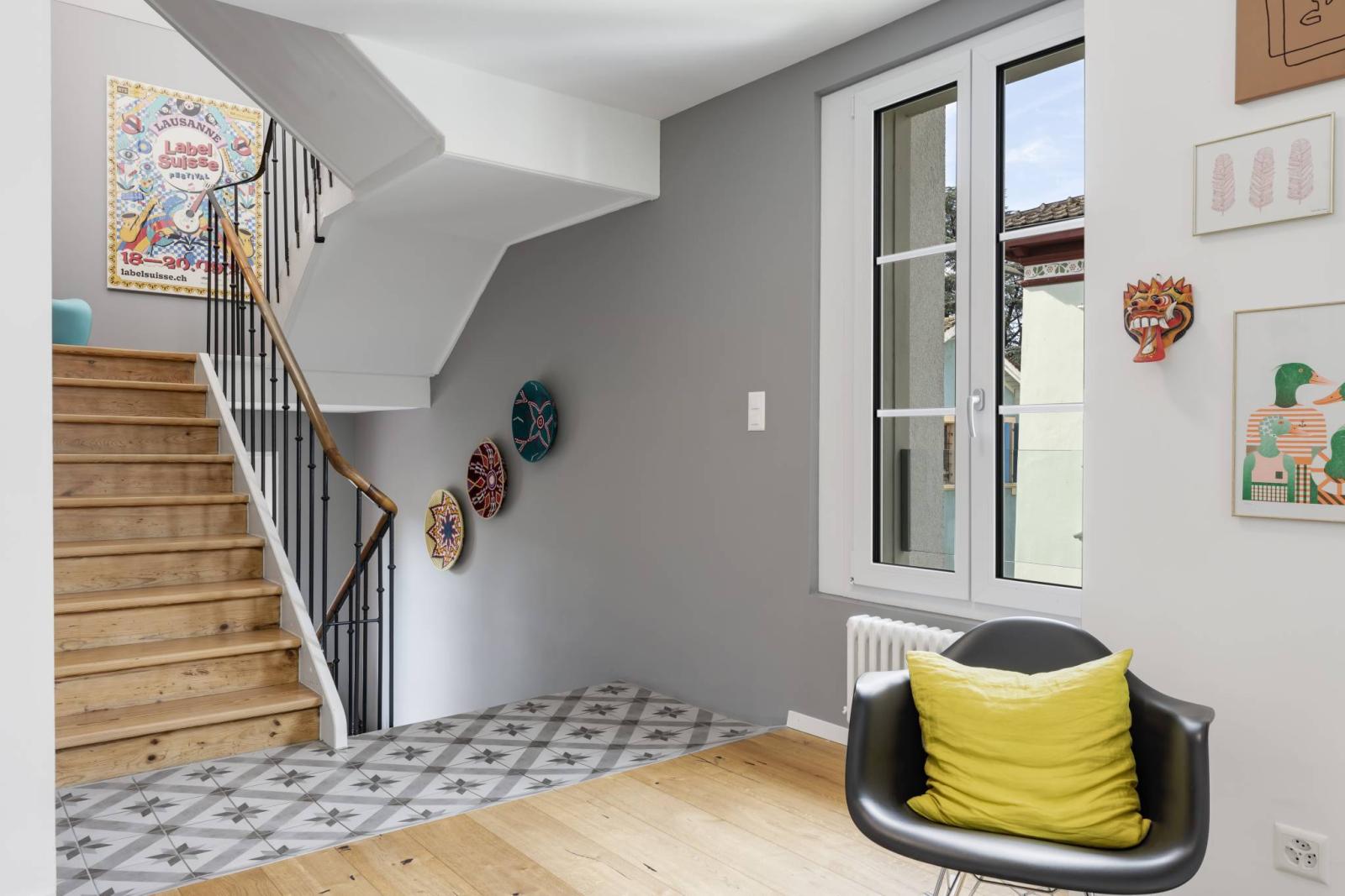 Das Gebäude, das sich über vier Etagen und ein Untergeschoss erstreckt, verfügt über eine elegante Architektur und einen unbestreitbaren Charakter. Im Erdgeschoss befindet sich eine derzeit vermietete 3,5-Zimmer-Wohnung, während in den drei Obergeschossen die Hauptwohnung mit fünf großzügigen und hellen Zimmern untergebracht ist.