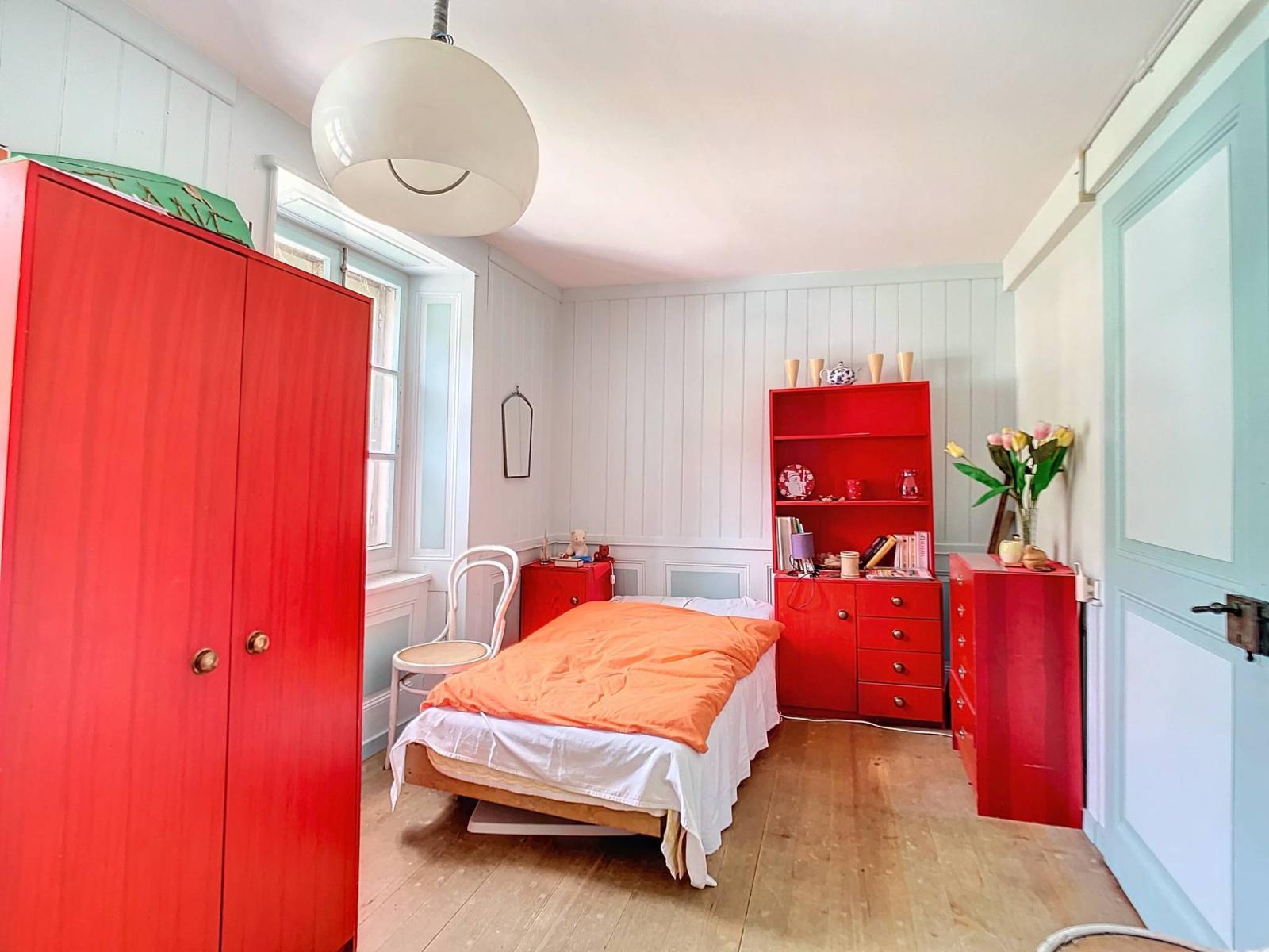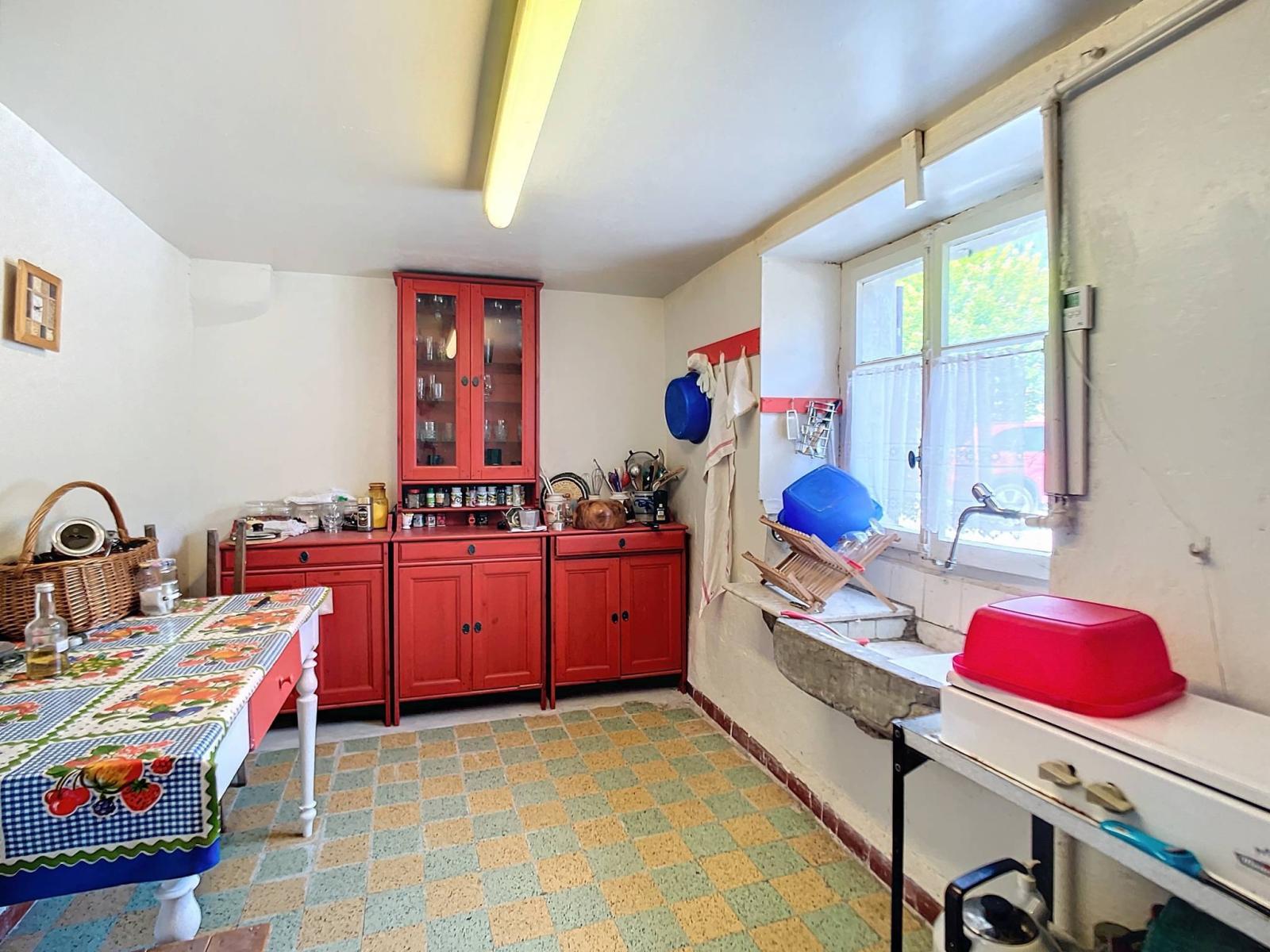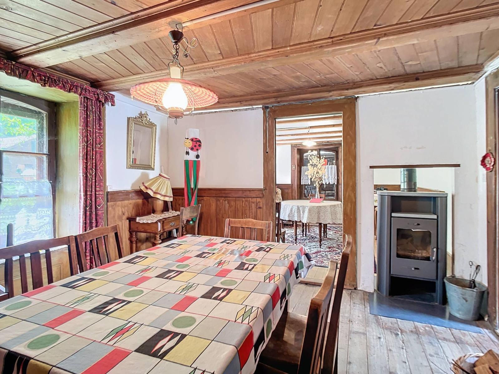 Das Erdgeschoss besteht aus einer Küche, einem Esszimmer, einem Wohnzimmer, einem Flur und einem Keller, die alle mit einem Holzofen beheizt werden.