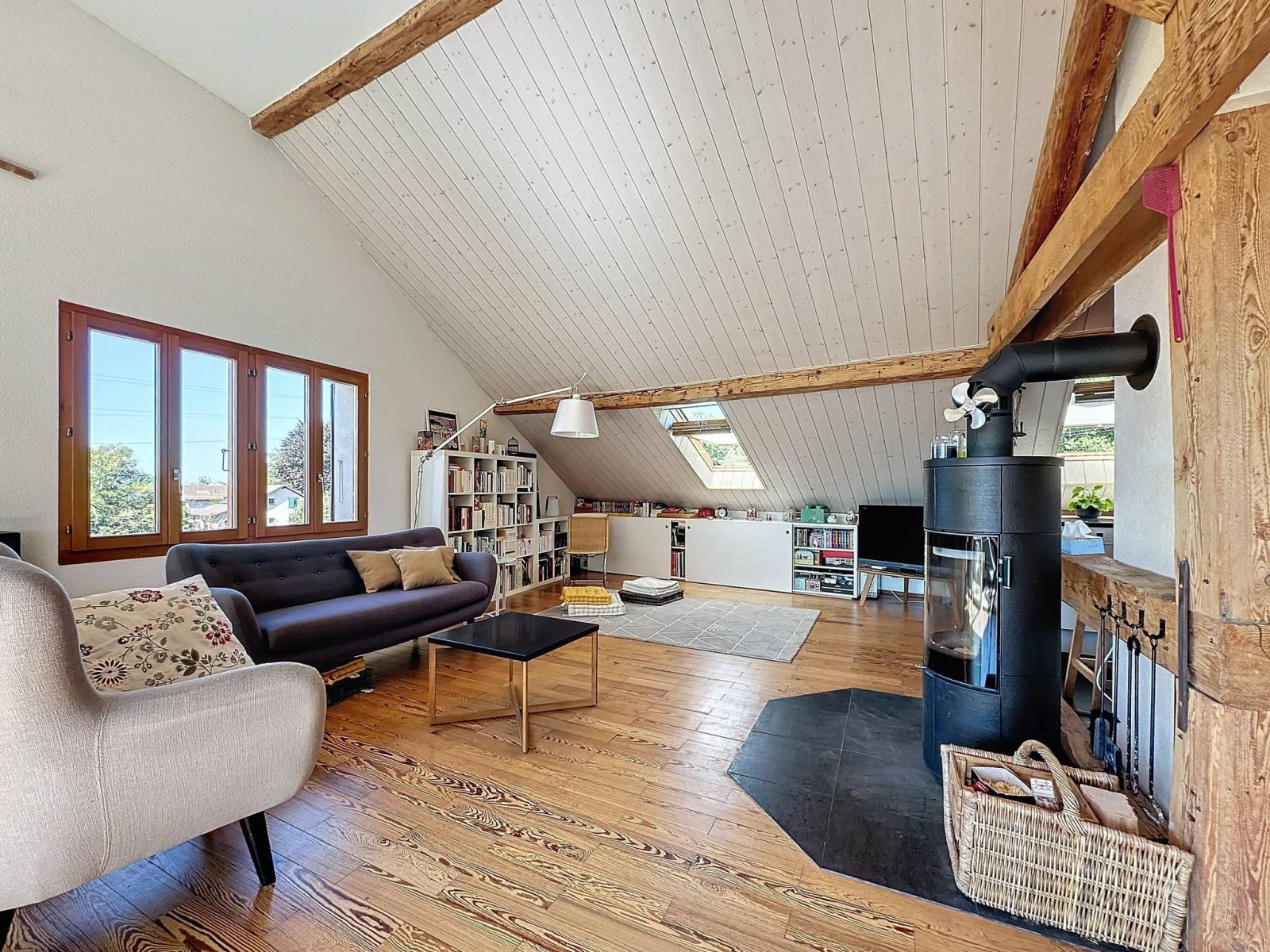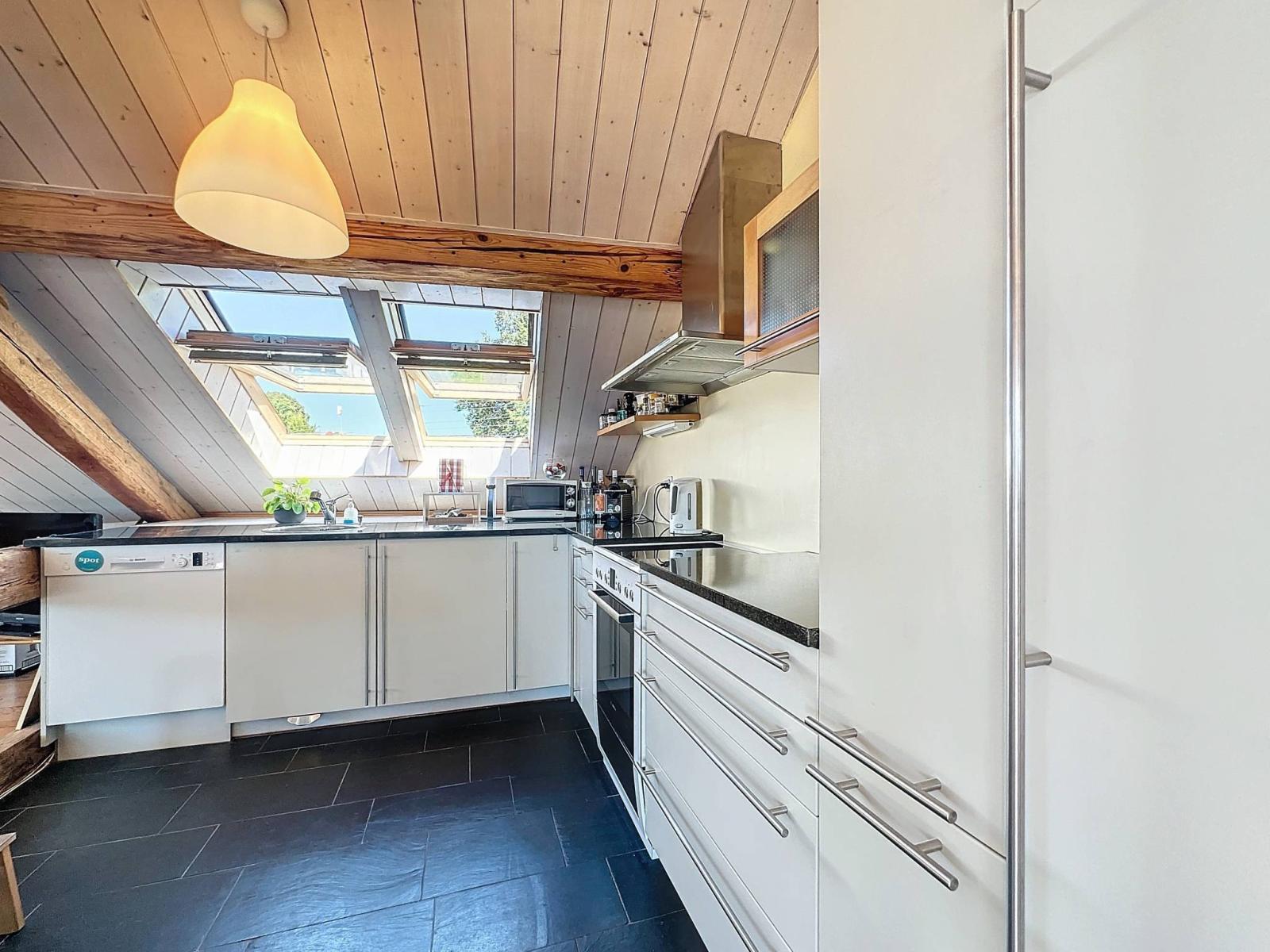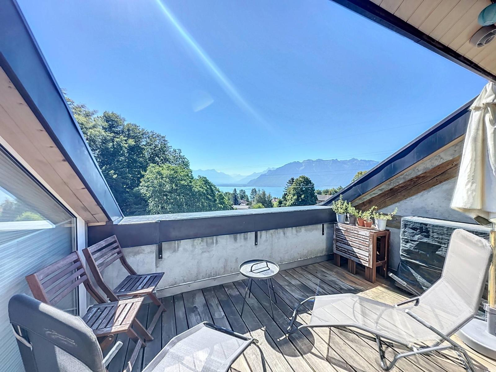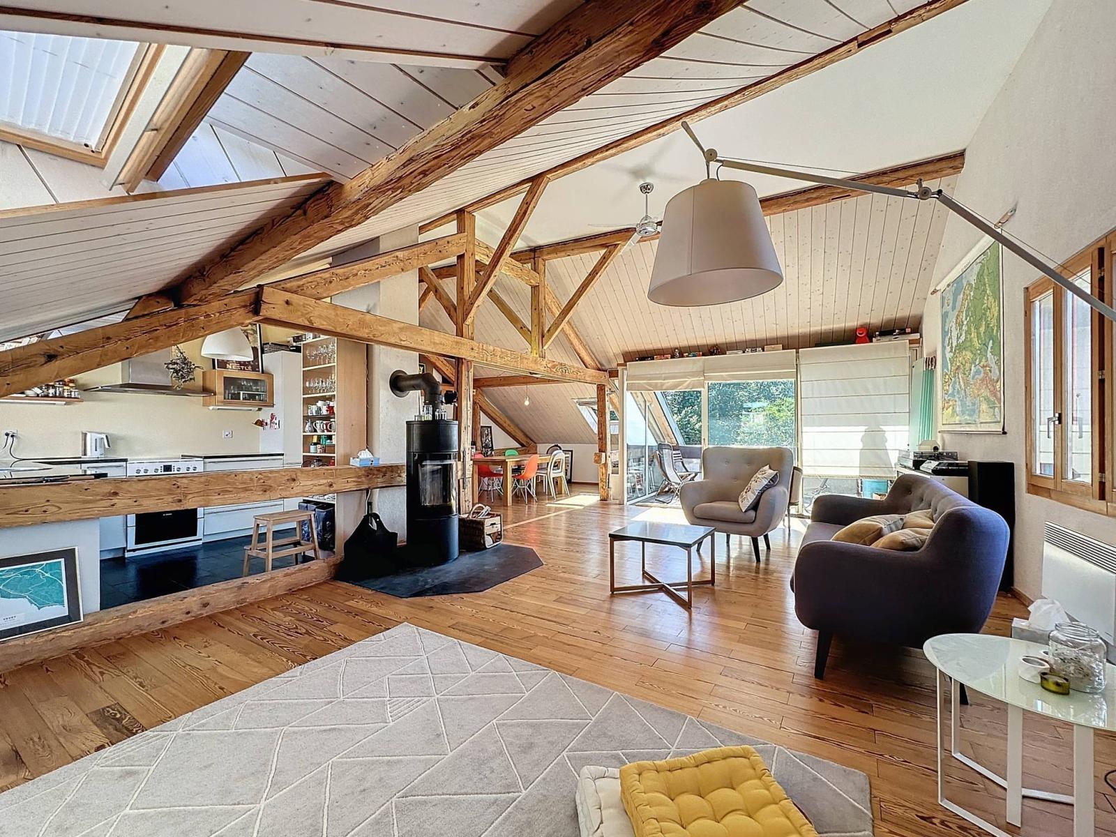 Dieses großzügige Penthouse mit einer Innenfläche von 95 m² nimmt die gesamte oberste Etage einer Eigentumswohnung mit vier Wohneinheiten ein. Es wurde 2010 mit hochwertigen Materialien erbaut und verfügt über ein Schlafzimmer, ein Zwischengeschoss, eine offene Küche und ein helles Wohnzimmer, das durch einen 10 m² großen Balkon mit Blick auf den See erweitert wird.
