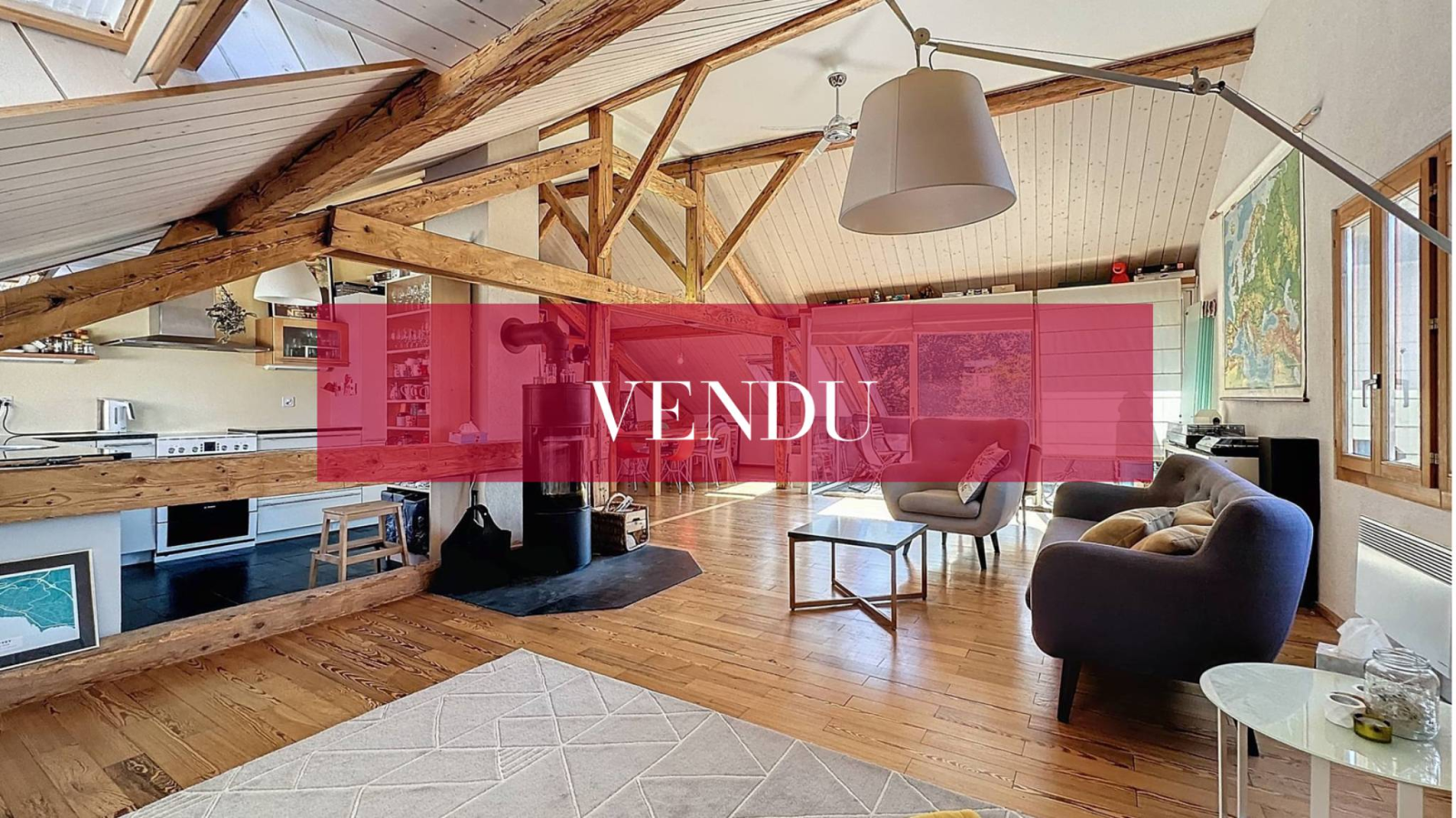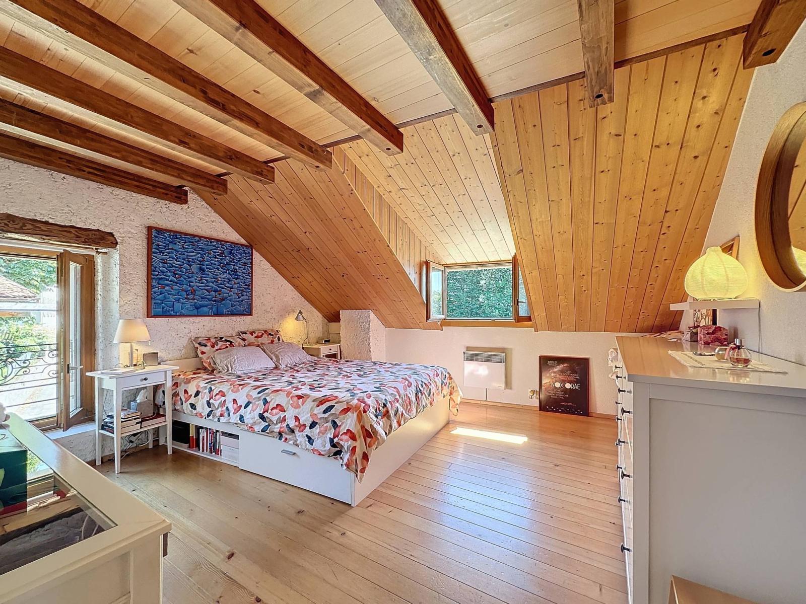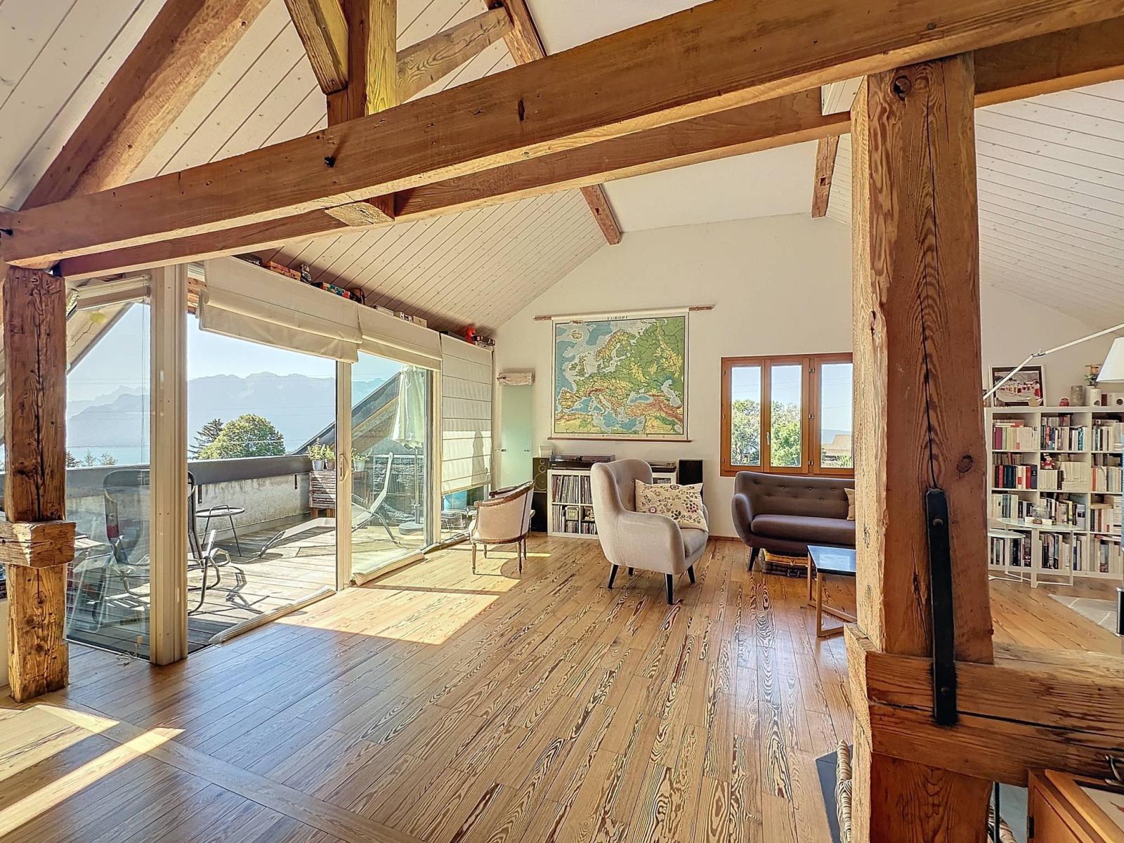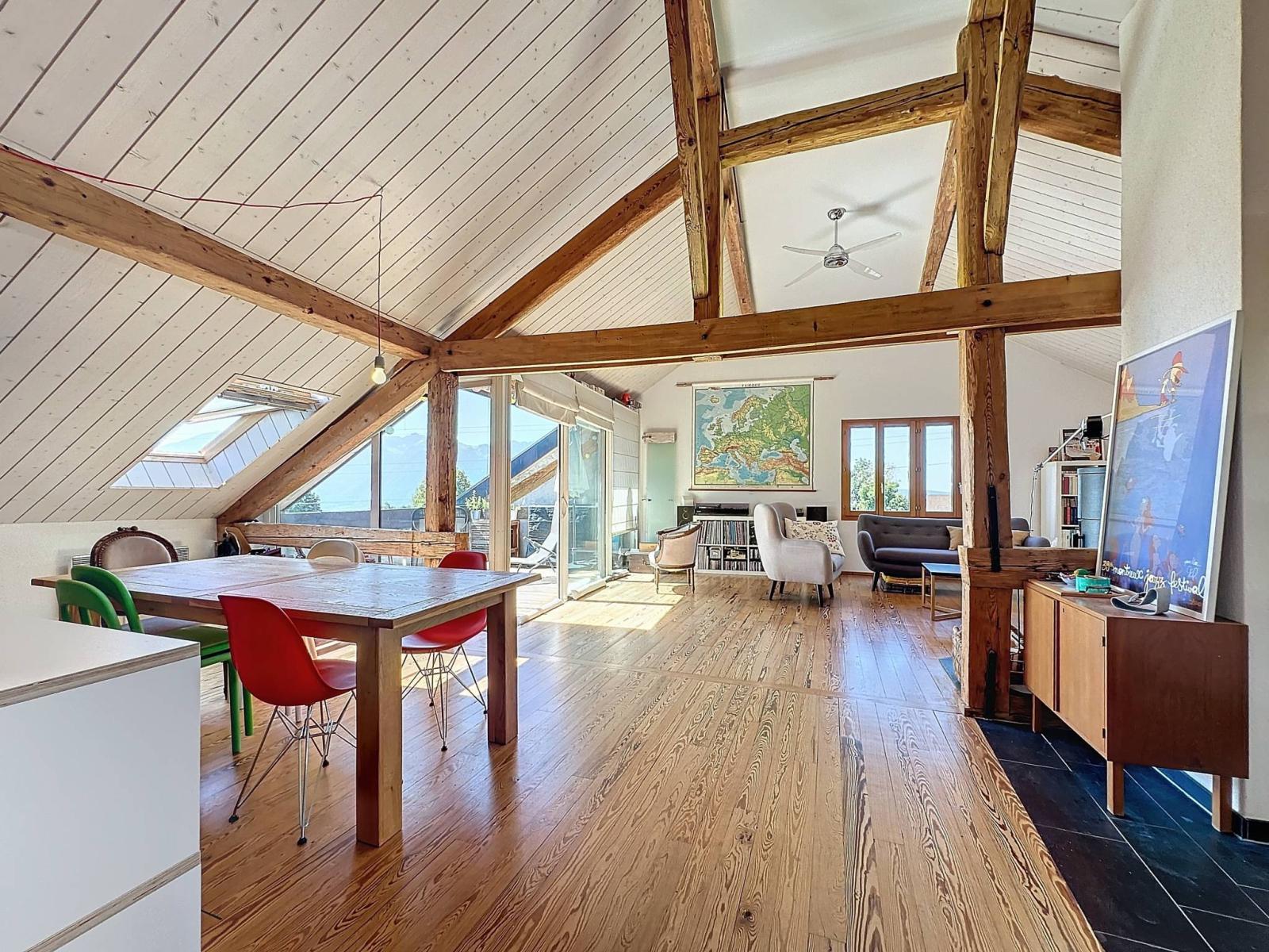 Dieses großzügige Penthouse mit einer Innenfläche von 95 m² nimmt die gesamte oberste Etage einer Eigentumswohnung mit vier Wohneinheiten ein. Es wurde 2010 mit hochwertigen Materialien erbaut und verfügt über ein Schlafzimmer, ein Zwischengeschoss, eine offene Küche und ein helles Wohnzimmer, das durch einen 10 m² großen Balkon mit Blick auf den See erweitert wird.