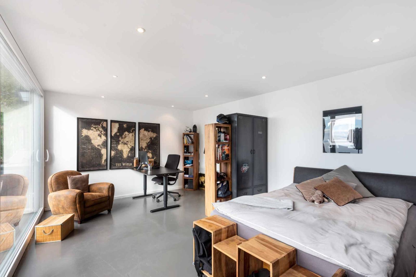 - Ein großes Schlafzimmer mit direktem Zugang zur Terrasse;