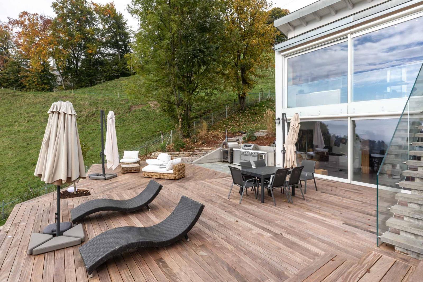 - Eine große möblierte Terrasse mit Loungebereich, Außenküche und Whirlpool.