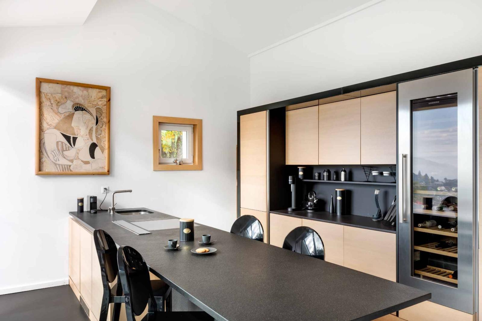 - Eine wunderschön eingerichtete Küche mit einem echten Holzkamin und Zugang zur unteren Terrasse;