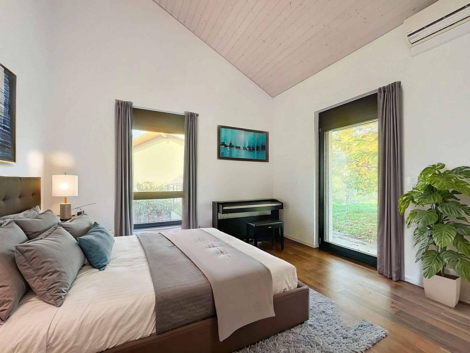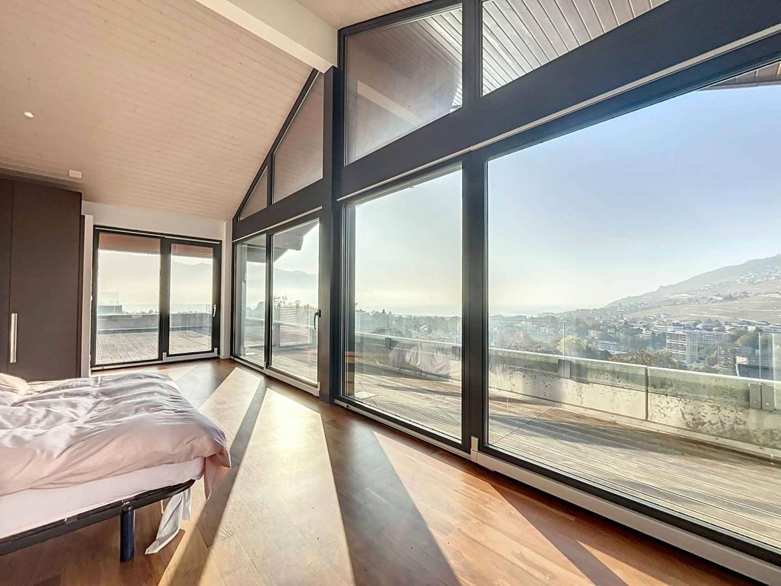 Dank seiner Südwestausrichtung genießt es den ganzen Tag über Licht und bietet einen Panoramablick auf den See und die Berge.