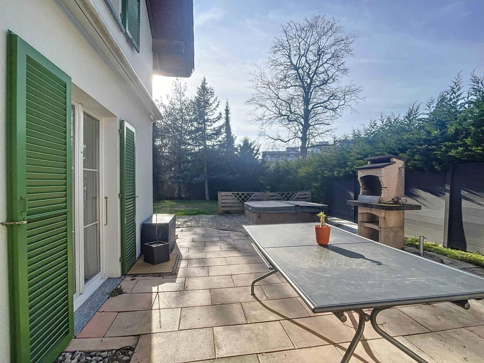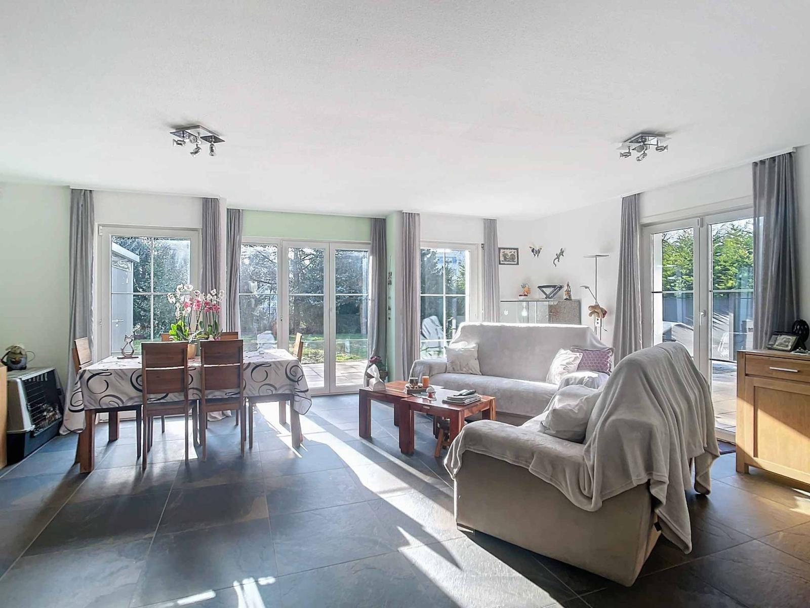 In einer grünen und ruhigen Umgebung gelegen, bietet diese prächtige Doppelhaushälfte mit 5,5 Zimmern ein privilegiertes Wohnumfeld. Seine Südwestausrichtung garantiert optimale Helligkeit den ganzen Tag über, während seine großzügigen und gut aufgeteilten Räume absoluten Komfort ermöglichen.