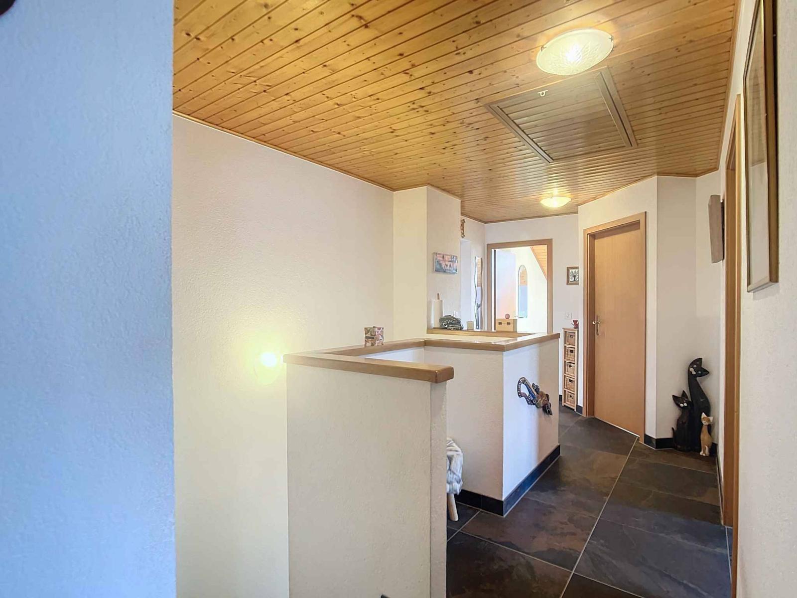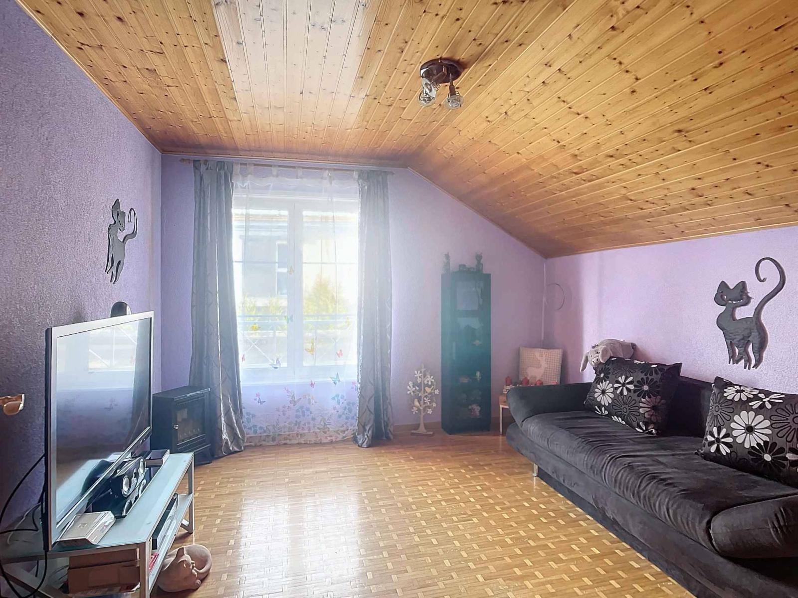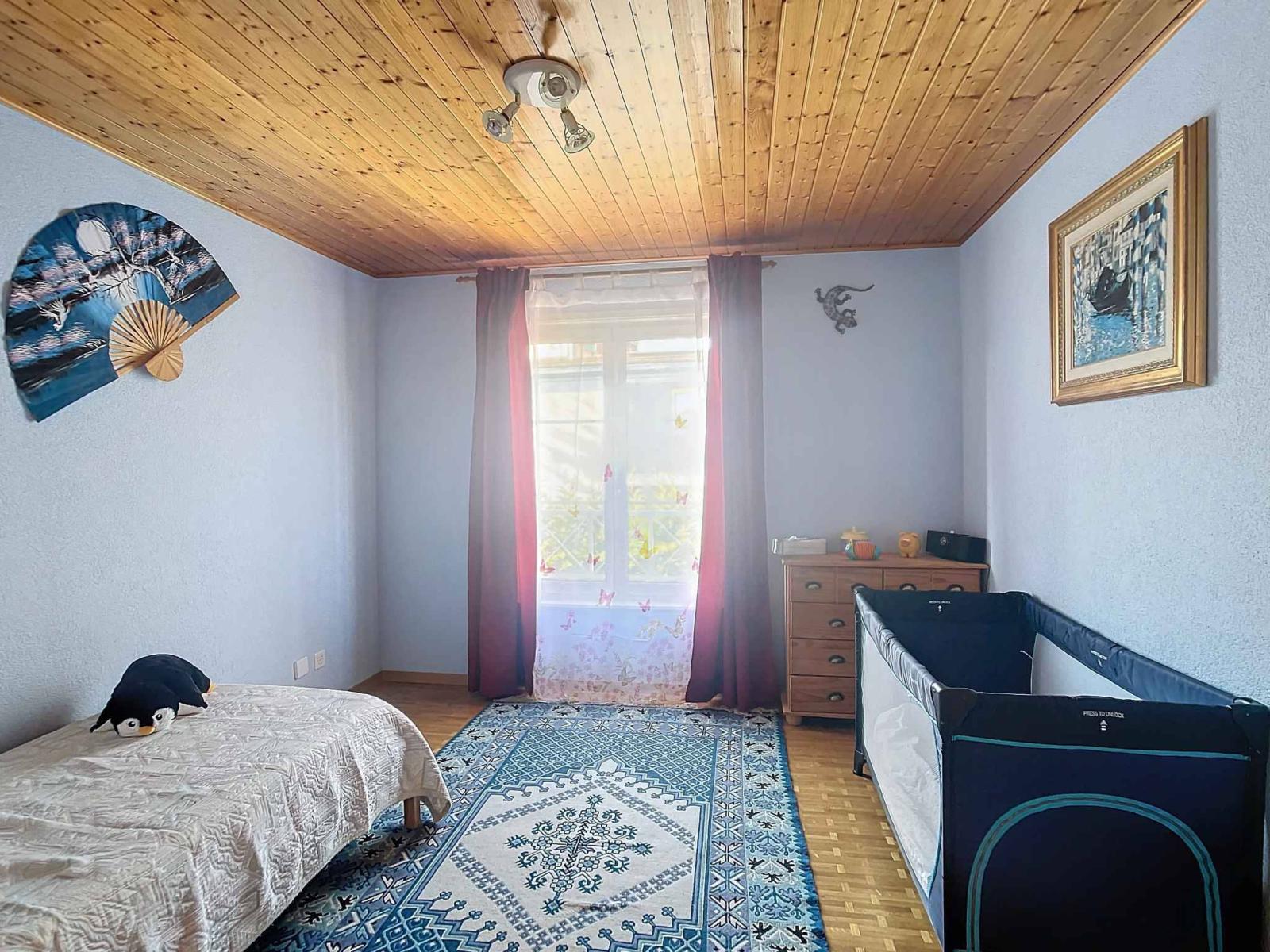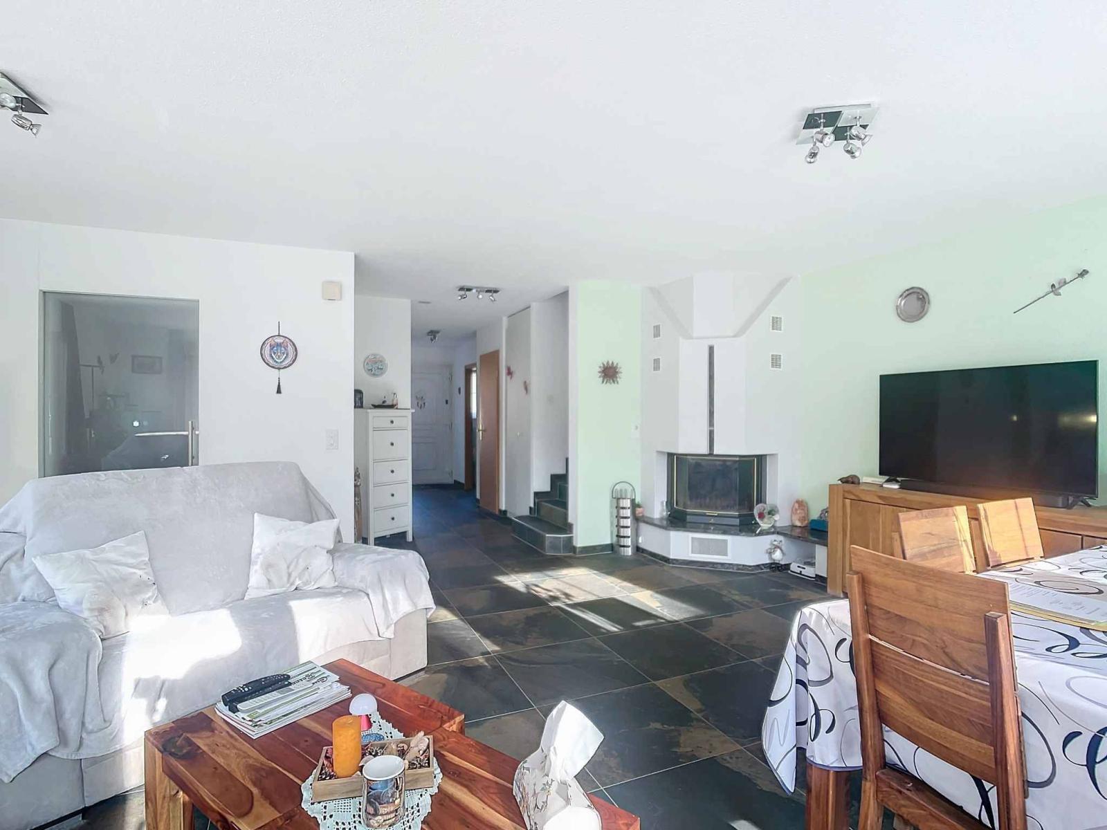 Mit einer Wohnfläche von ca. 135 m² inklusive einer Nutzfläche von 200 m² (ohne Garage) verteilt sich das Haus auf drei Ebenen. Im Erdgeschoss befinden sich ein großes Wohnzimmer mit Esszimmer, eine komplett ausgestattete geschlossene Küche und ein Duschbad mit WC. Das Obergeschoss besteht aus vier Schlafzimmern, darunter eine Master-Suite mit Ankleidezimmer, sowie einem großen Badezimmer mit Dusche und WC. Das Untergeschoss, ebenfalls mit Fußbodenheizung, bietet ein Büro- und Duschbad mit WC, ein großes Spielzimmer, einen Keller, eine Waschküche und somit vielfältige Entwicklungsmöglichkeiten. Die Fernheizung erfolgt durch Pierre-de-Plan, Lausanne.