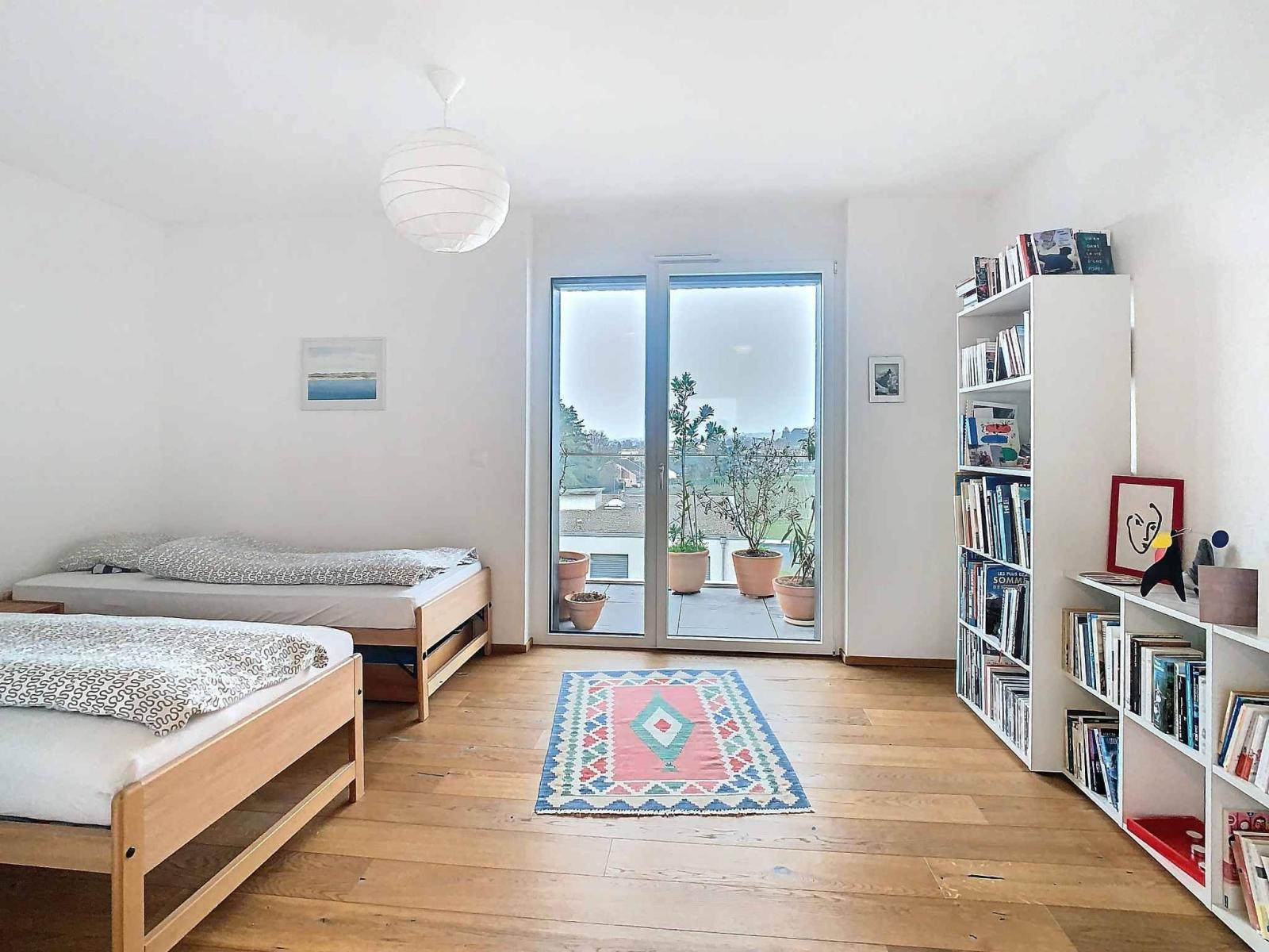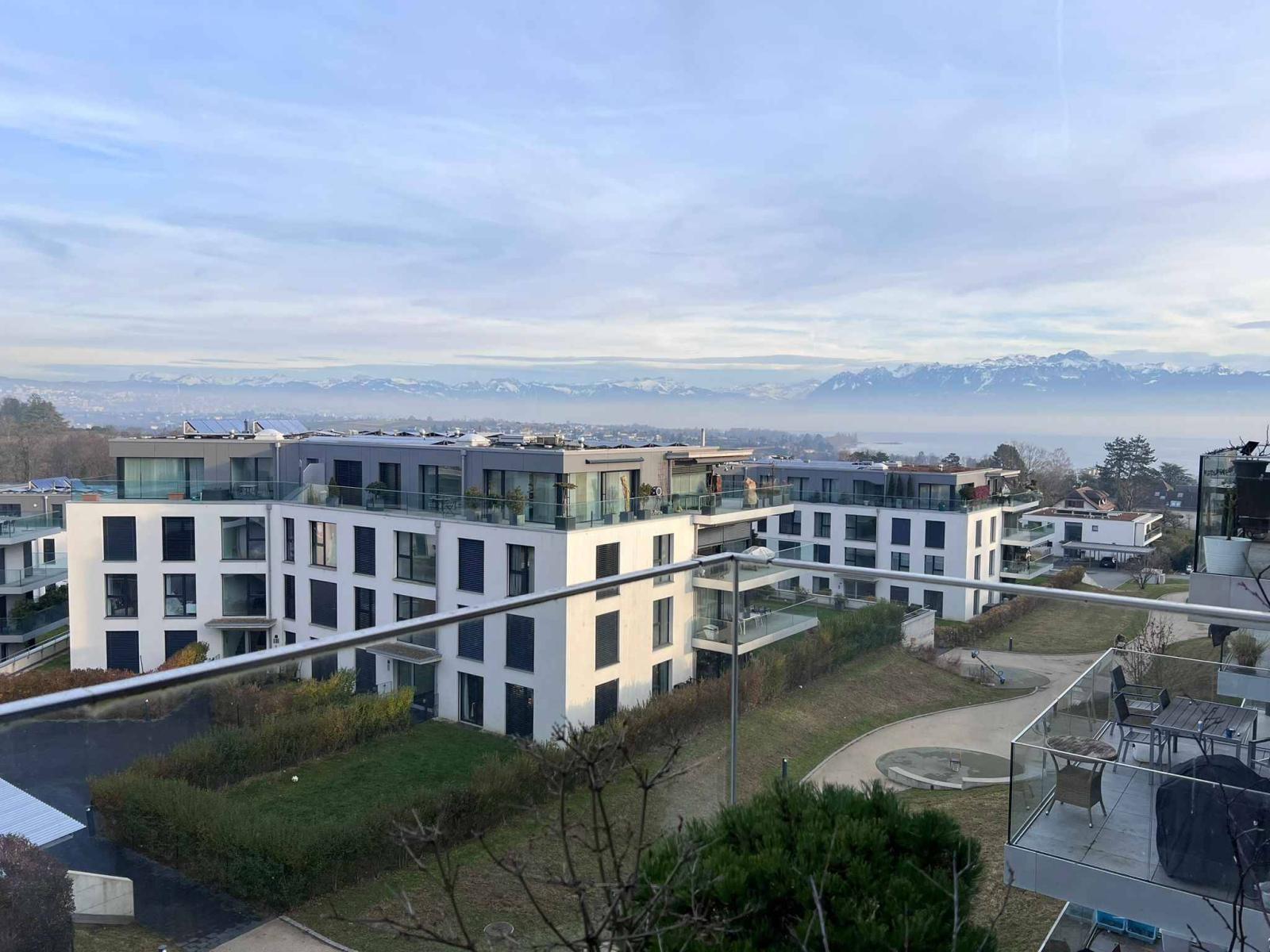 Dieses Anwesen befindet sich im 3. und letzten Stock, hat zwei Fenster und profitiert von einer wunderschönen, unverbauten Aussicht auf den See und die Berge von den beiden Balkonen (24,5 m²), die es besitzt.