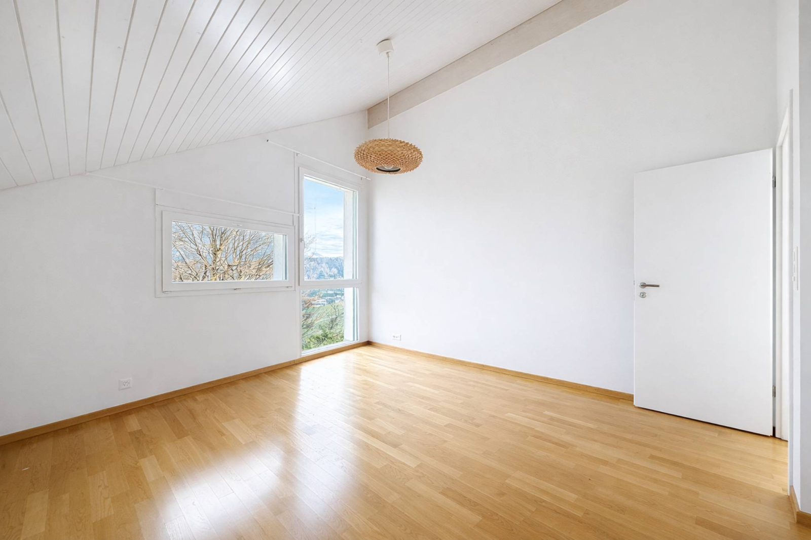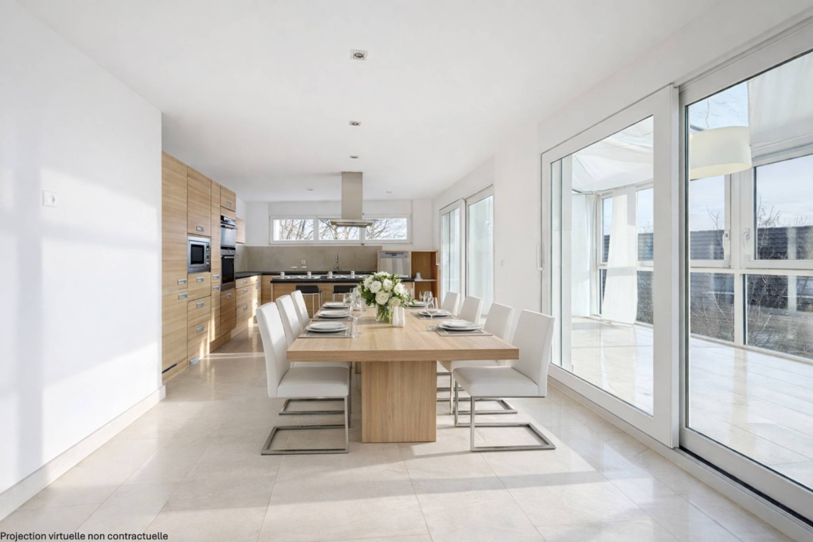 Der Wohnraum besteht aus einem großzügigen, 54 m² großen Wohnzimmer, das dank seiner großen Erkerfenster lichtdurchflutet ist. Die Veranda und die offene Küche mit Essbereich bieten den idealen Rahmen für gesellige Momente mit der Familie oder Freunden.