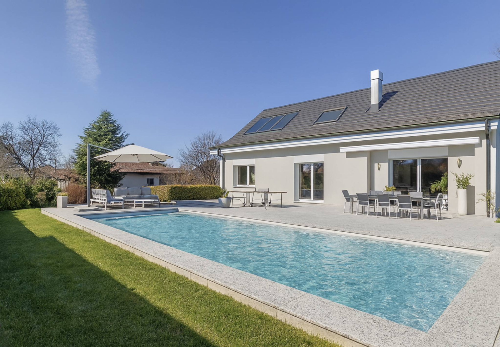 Die Außenbereiche wurden genutzt, um die Frühlings- und Sommertage optimal zu nutzen. Seine zahlreichen Terrassen und der Swimmingpool bilden einen idyllischen Ort, der Momente bietet, in denen die Zeit stillzustehen scheint.