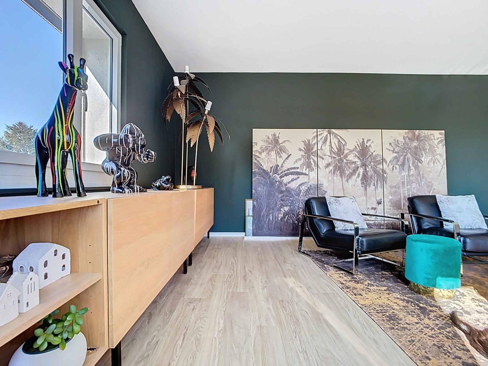Die Einrichtung basiert auf modernen und schlichten Möbeln und Farbschemata, die eine warme und luftige Atmosphäre schaffen und gleichzeitig die umgebenden Perspektiven hervorheben.