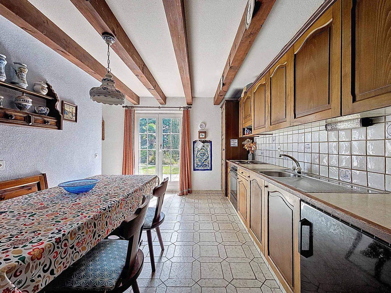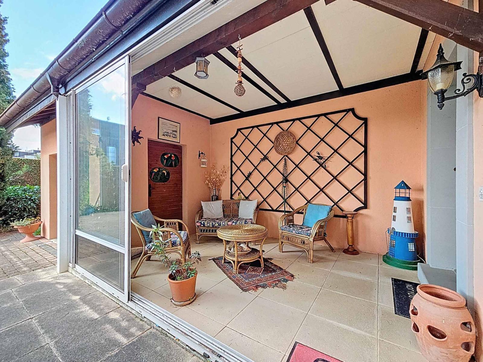 Im Erdgeschoss finden Sie ein geräumiges Doppelwohnzimmer mit Kamin, eine separate Küche sowie eine Veranda (auf Eingangsebene) und eine separate Toilette. Vom Wohnzimmer aus hat man direkten Zugang zur Terrasse und einen Blick auf den Garten mit seiner vielfältigen Bepflanzung.