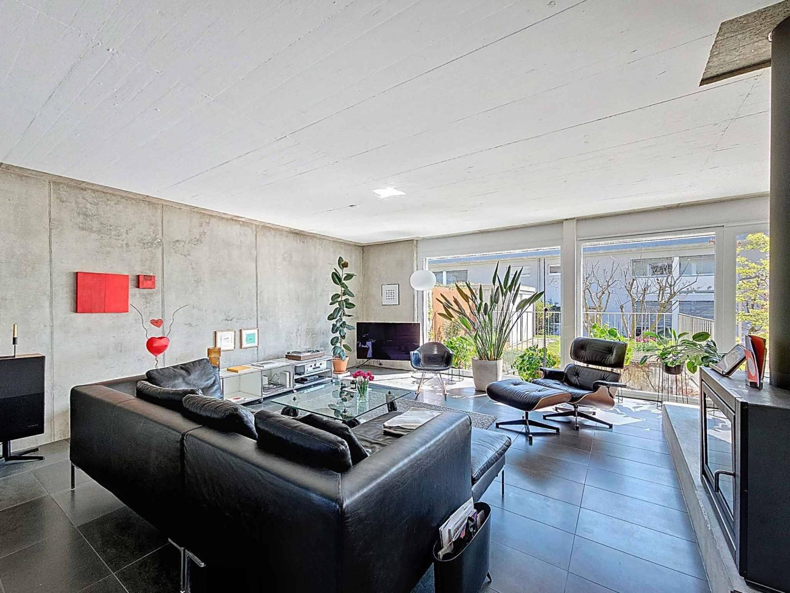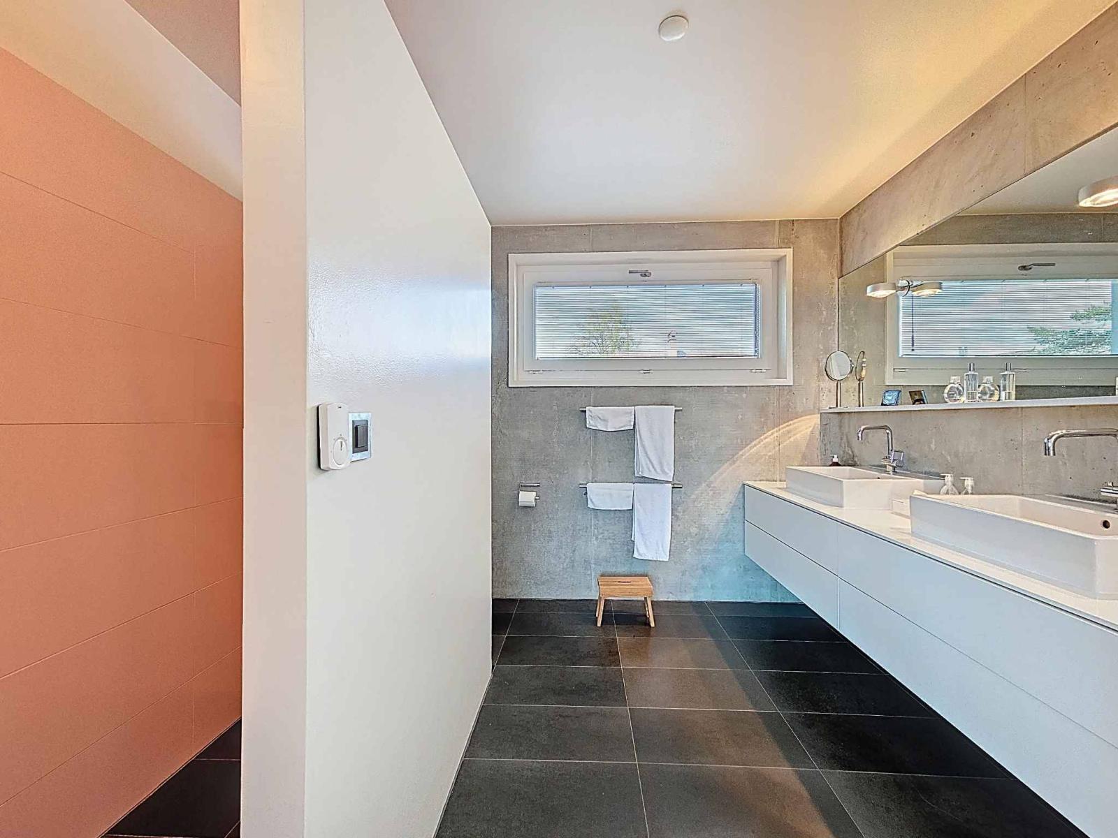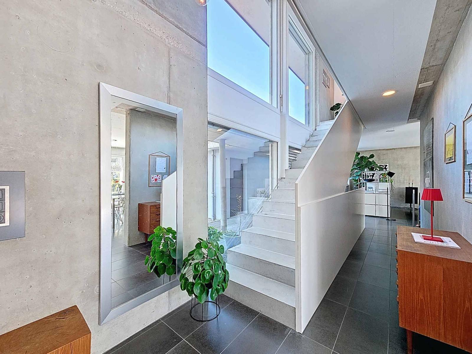 Diese 2010 erbaute Villa bietet einen sehr modernen Stil mit großen Räumen (Küche/Wohnzimmer von fast 75 m²), die dank der großen Erkerfenster mit Blick auf den Garten sehr hell sind, und kombiniert gleichzeitig einen „schick-industriellen“ Aspekt, der durch die Wände aus Rohbeton hervorgehoben wird.