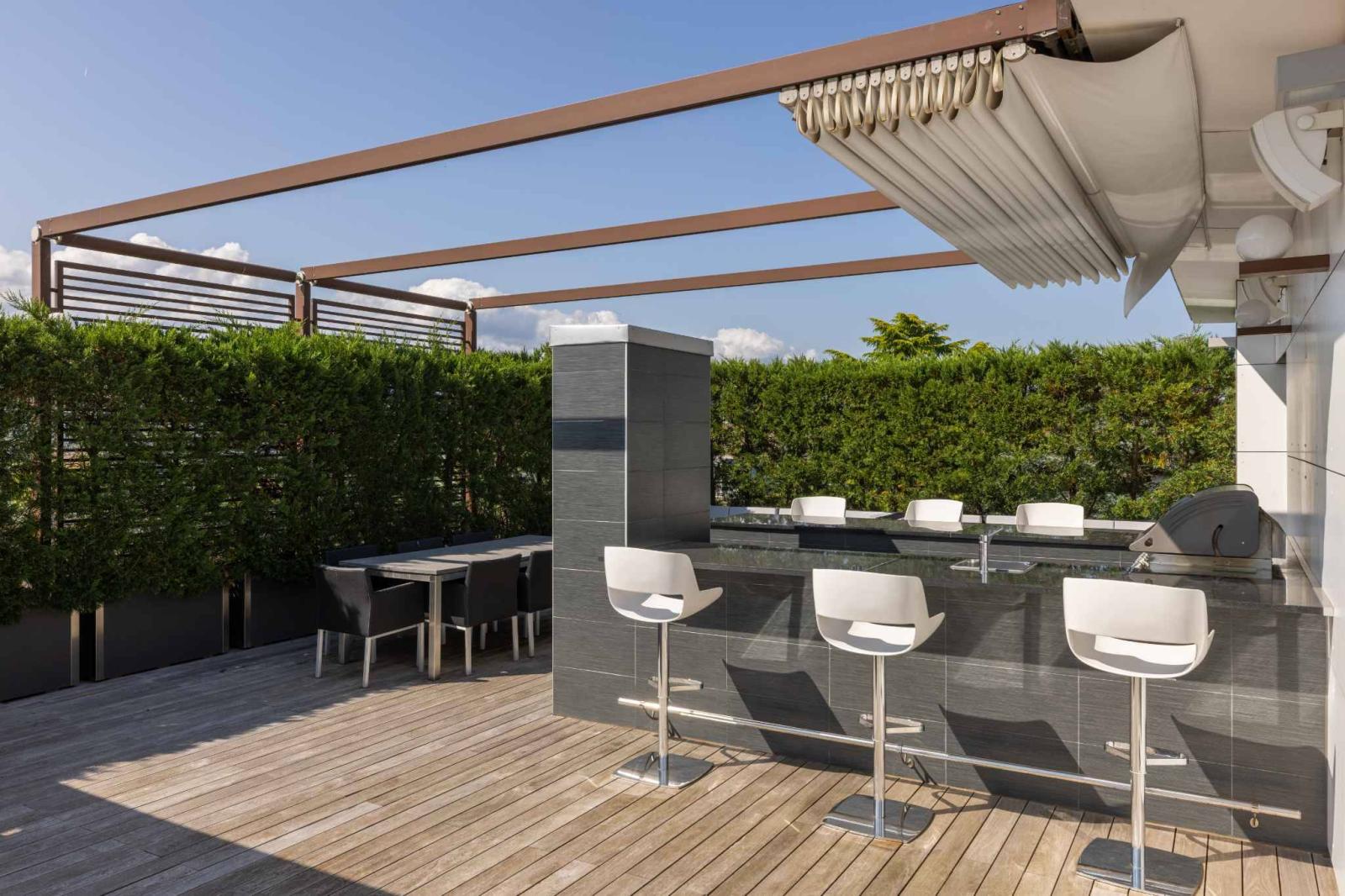 Die Dachterrasse verfügt über einen Whirlpool, eine bioklimatische Pergola, eine Sommerküche und einen herrlichen Grill.