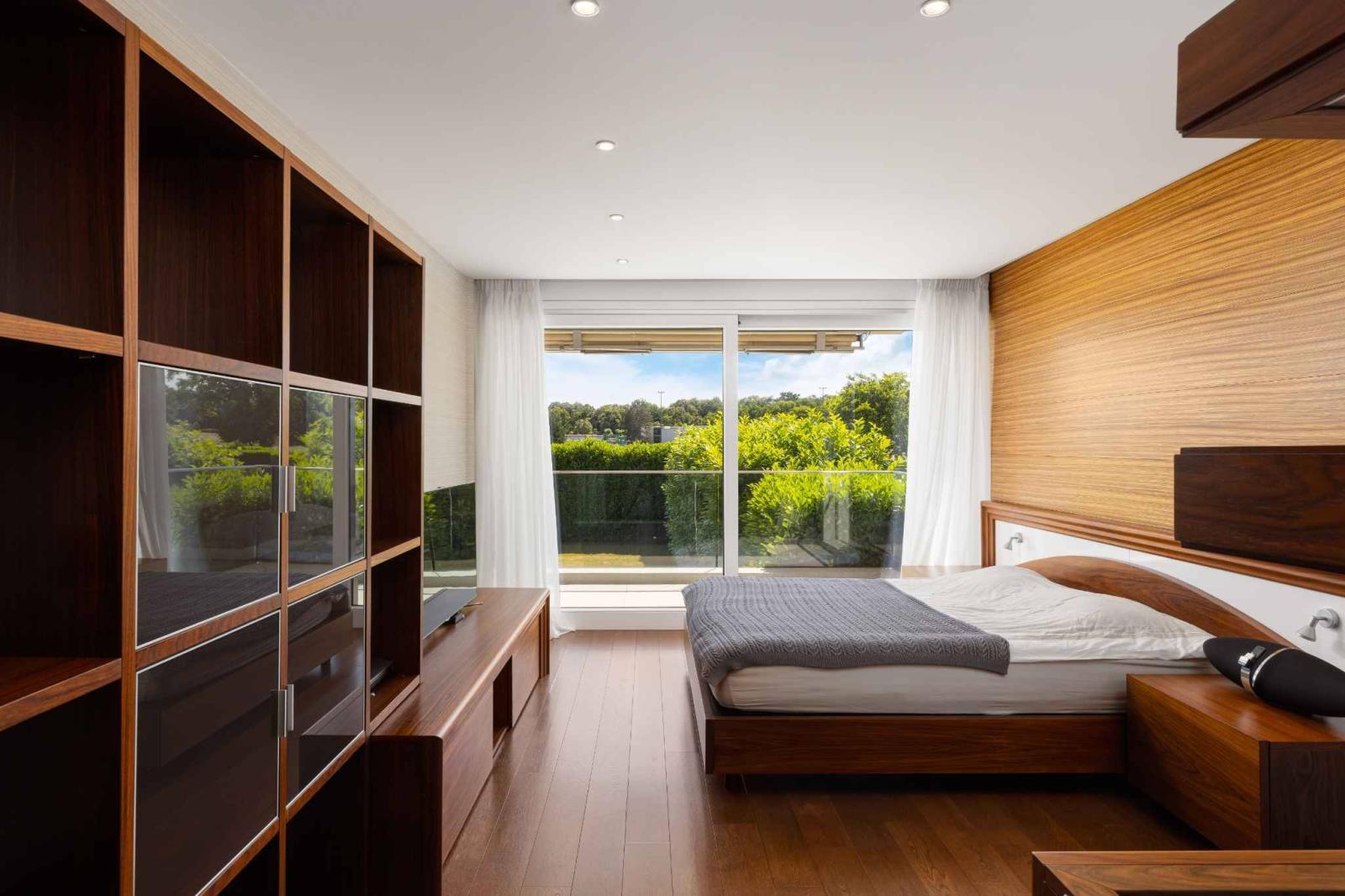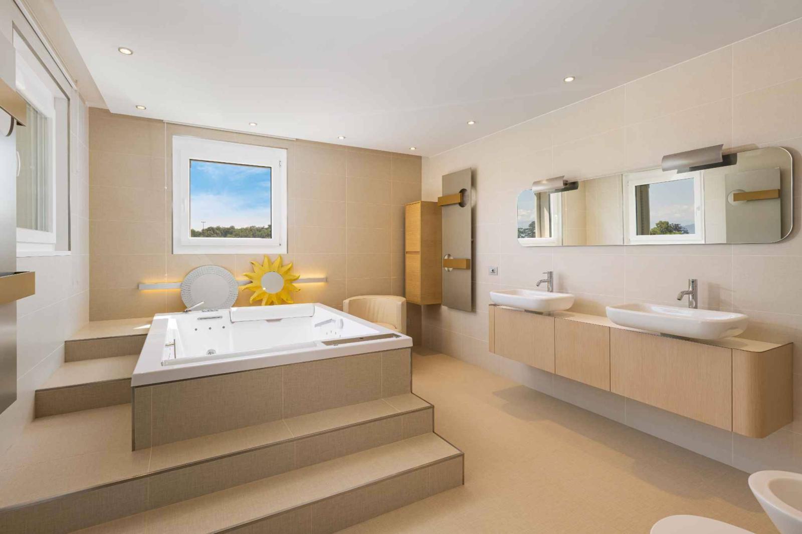 Im Obergeschoss bietet der Schlafbereich 2 Suiten mit eigenem Bad und Balkon, 1 Suite mit eigenem Bad, ein Hauptschlafzimmer mit fast 64 m2, Duschraum, Whirlpool und Ankleidezimmer.