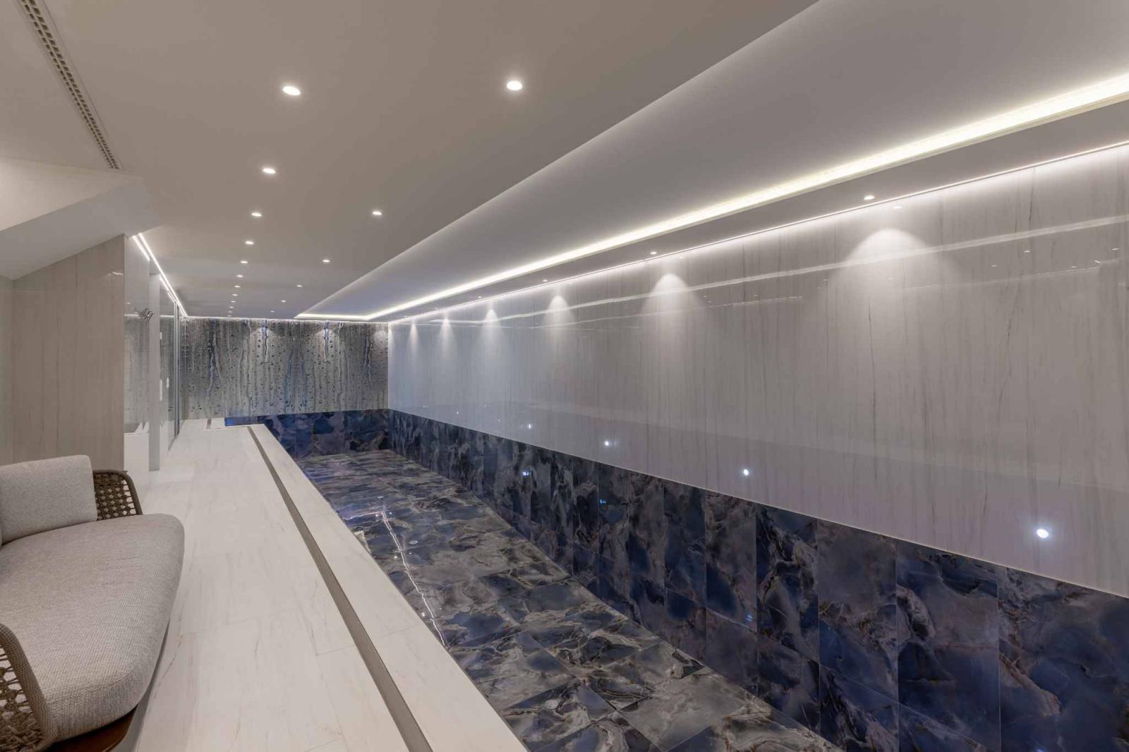 Im Untergeschoss befindet sich ein kompletter Wellnessbereich, ein Eingang mit Umkleideraum, ein Hamam/Sauna, ein Fitnessstudio und ein Innenpool, ideal zum Entspannen nach dem Training.