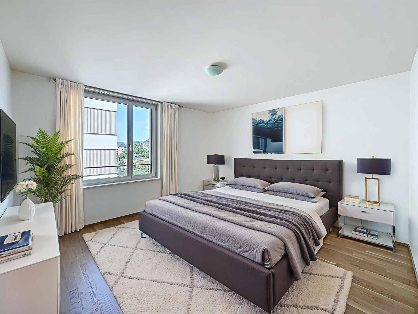 Die Wohnung bietet einen schönen Blick auf den See und die Berge und ist dank ihrer Südausrichtung und der großen Erkerfenster sehr lichtdurchflutet. Alle Jalousien der Wohnung sind elektrisch.