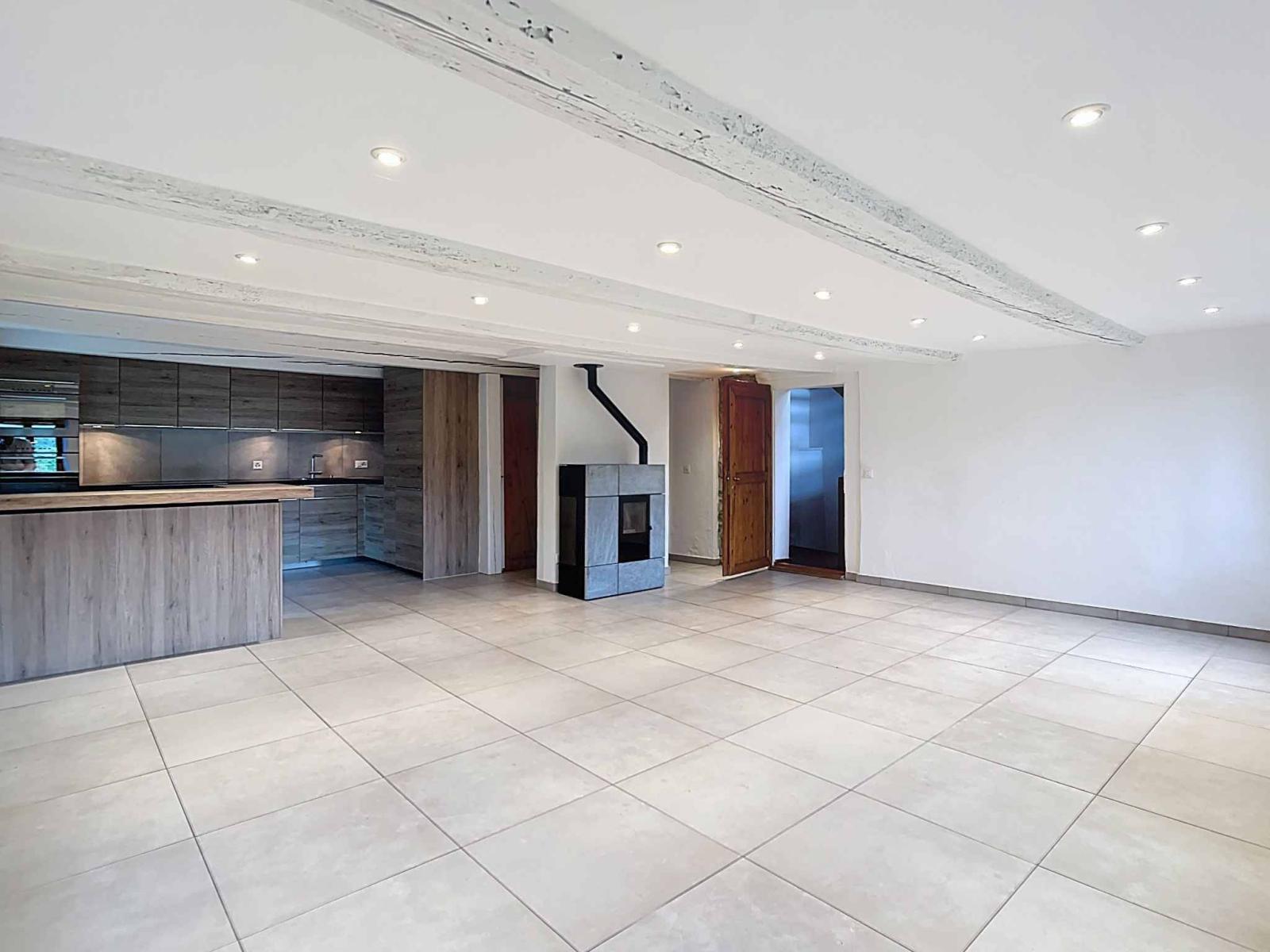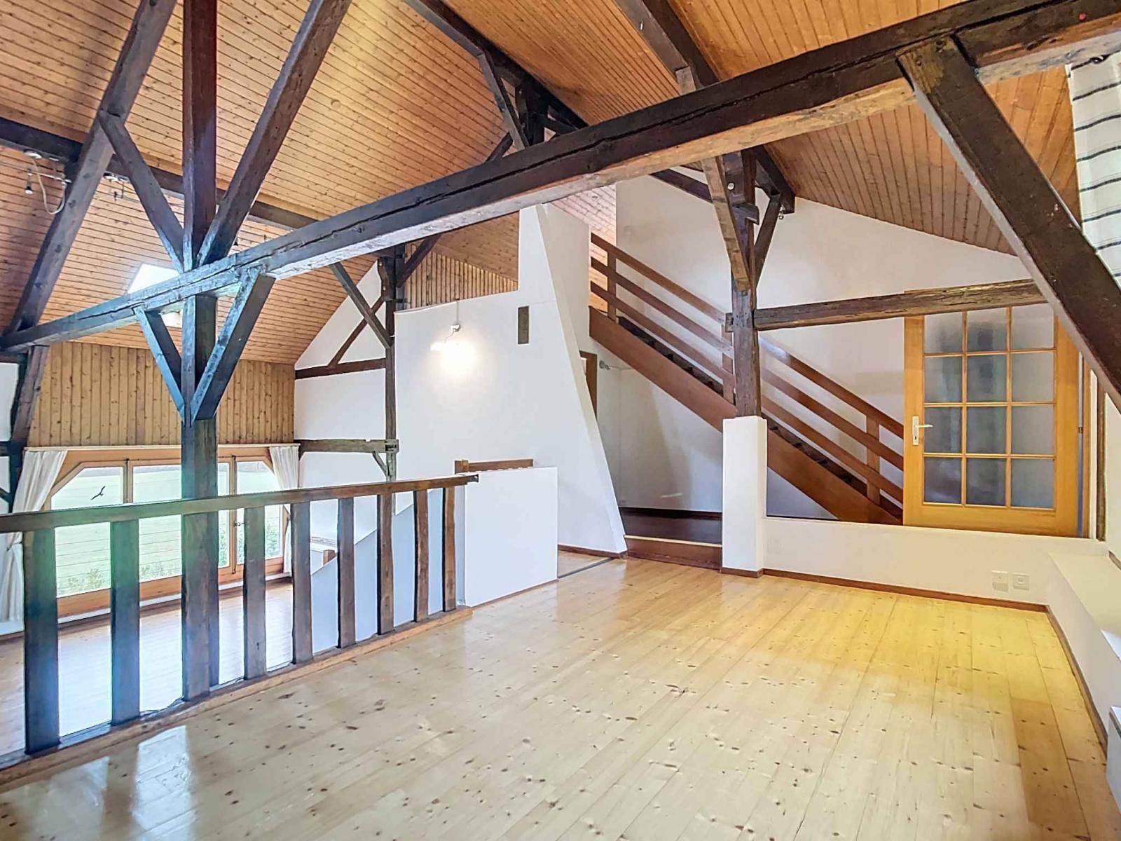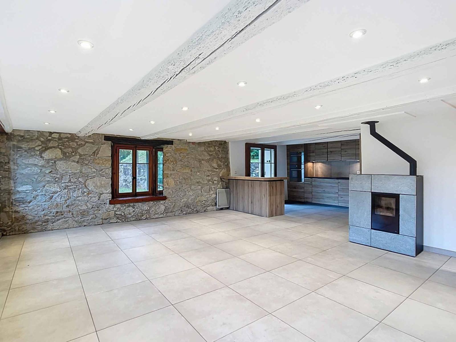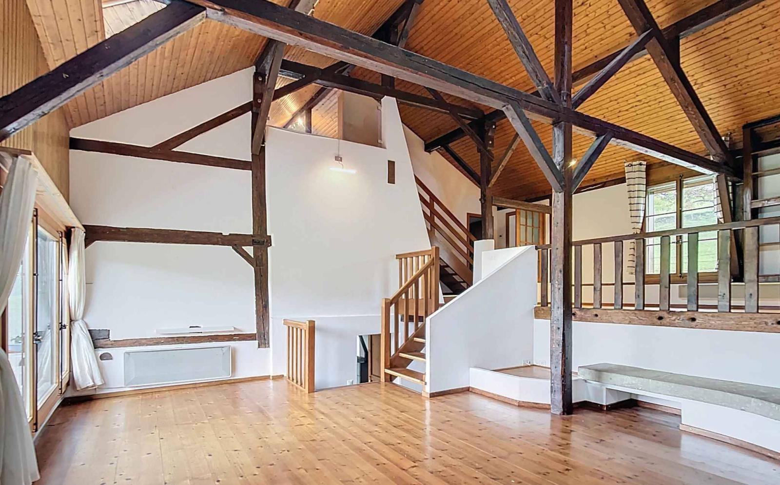 Der Wohnbereich ist auf zwei Ebenen aufgeteilt und profitiert von einem schönen Volumen mit freiliegenden Balken, einer maßgefertigten Bibliothek und einem zweiten Pelletofen, die für eine warme, charaktervolle Atmosphäre sorgen.