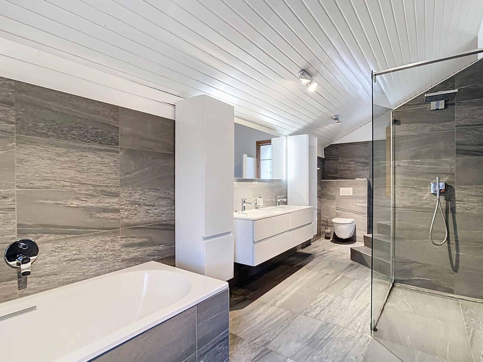 Der Schlafbereich umfasst drei Schlafzimmer, eines davon im Zwischengeschoss mit Blick auf das Wohnzimmer, sowie ein Badezimmer mit Badewanne, Dusche und Doppelwaschbecken. Eine Waschküche, ein Keller und Technikräume runden das Angebot ab.