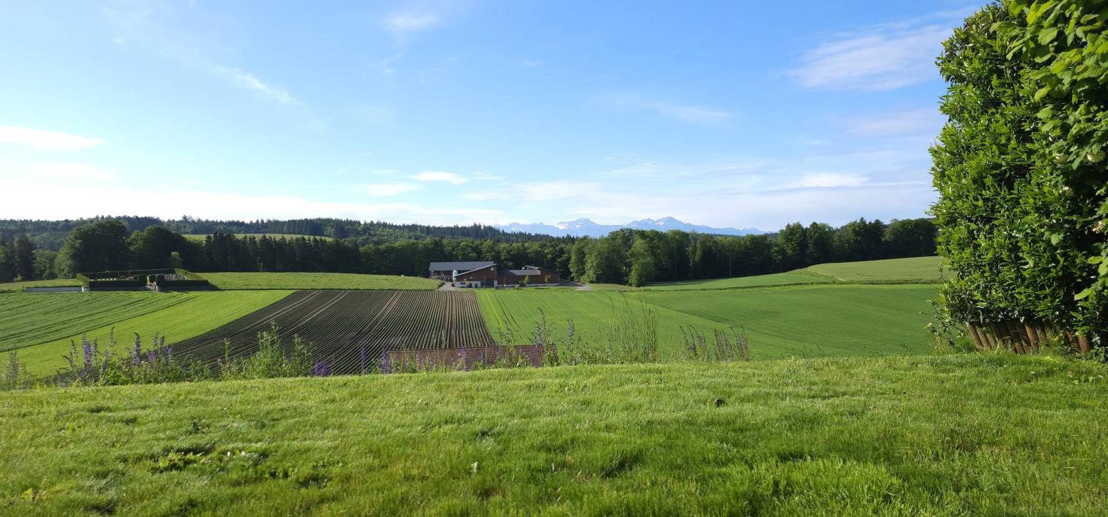 Diese geräumige Wohnung verfügt über eine Wohnfläche von ca. 130 m² und öffnet sich zu einer Terrasse und einem 604,6 m² großen Garten. Diese stehen zur alleinigen Nutzung zur Verfügung und bieten einen weiten Blick über die Felder und Berge.