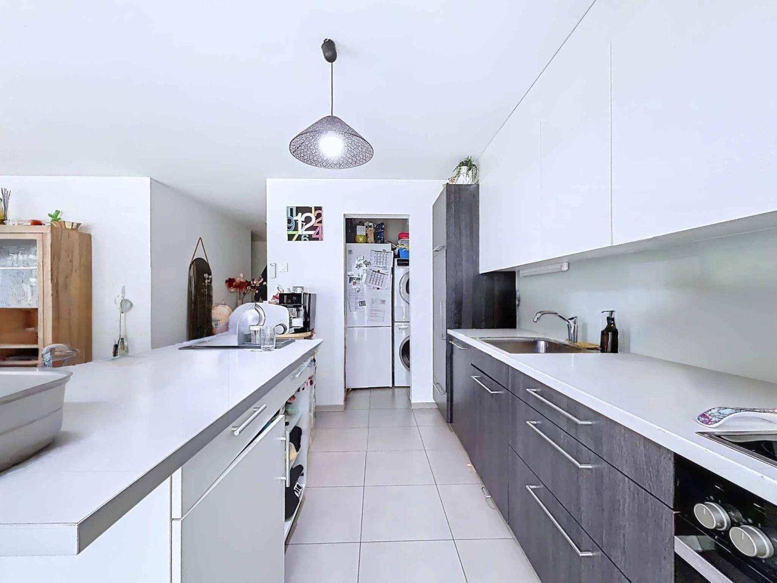 Beim Betreten des Hauses gelangen Sie in eine Eingangshalle, von der aus Sie ein Gäste-WC, den Schlafbereich und das Wohnzimmer erreichen. Das Wohnzimmer besticht durch eine einladende Lounge, einen komfortablen Essbereich und eine voll ausgestattete offene Küche, die mit ihrer Helligkeit und dem direkten Zugang zum Balkon beeindruckt. Dank der Südausrichtung und des unverbauten Ausblicks ist dieser großzügige, 16 m² große Außenbereich ideal zum Sonnenbaden und Entspannen im Freien. Angrenzend an die Küche befindet sich ein Abstellraum, der sich perfekt für zusätzlichen Stauraum oder die Aufstellung von Waschmaschine und Trockner eignet.
