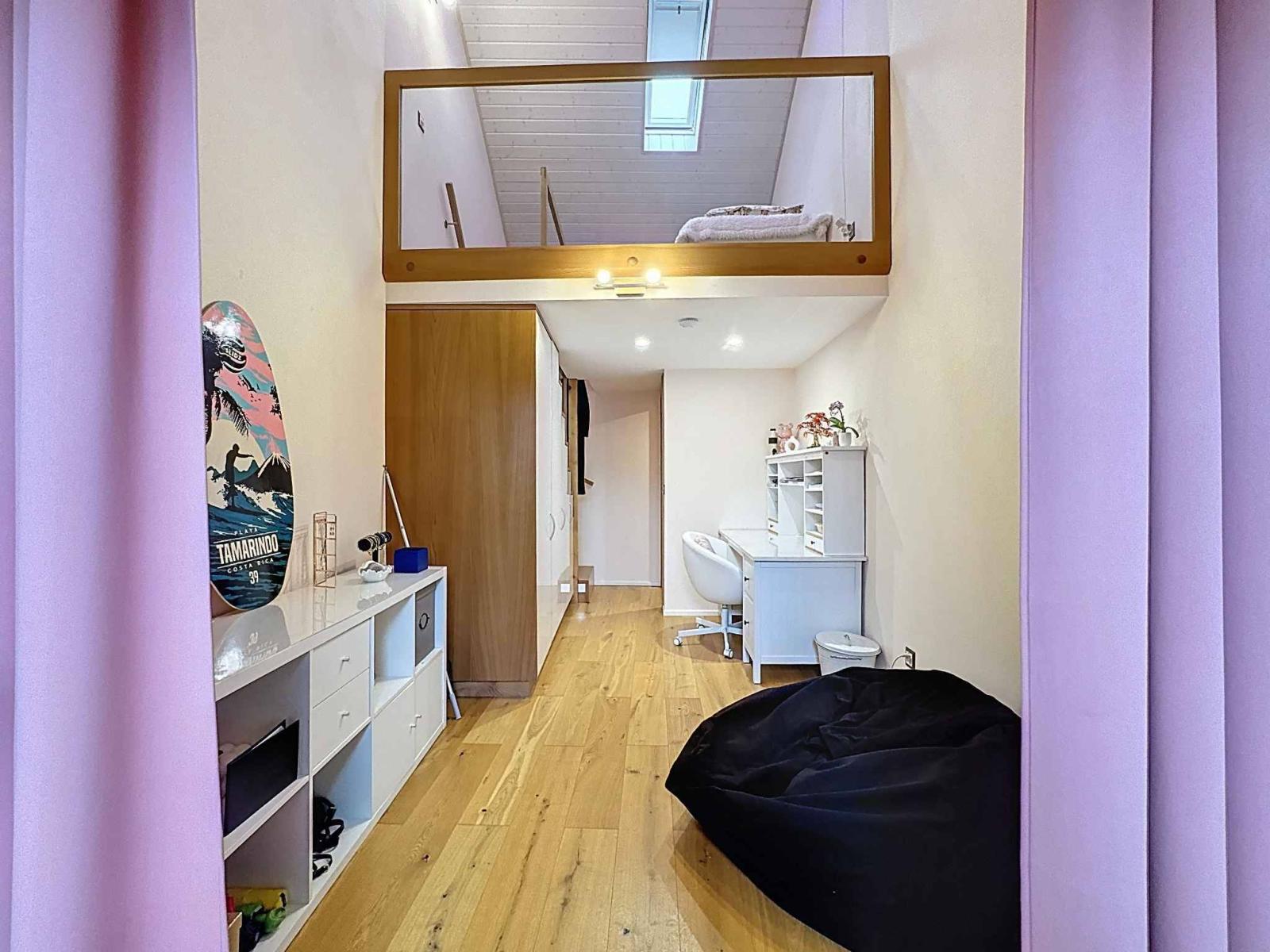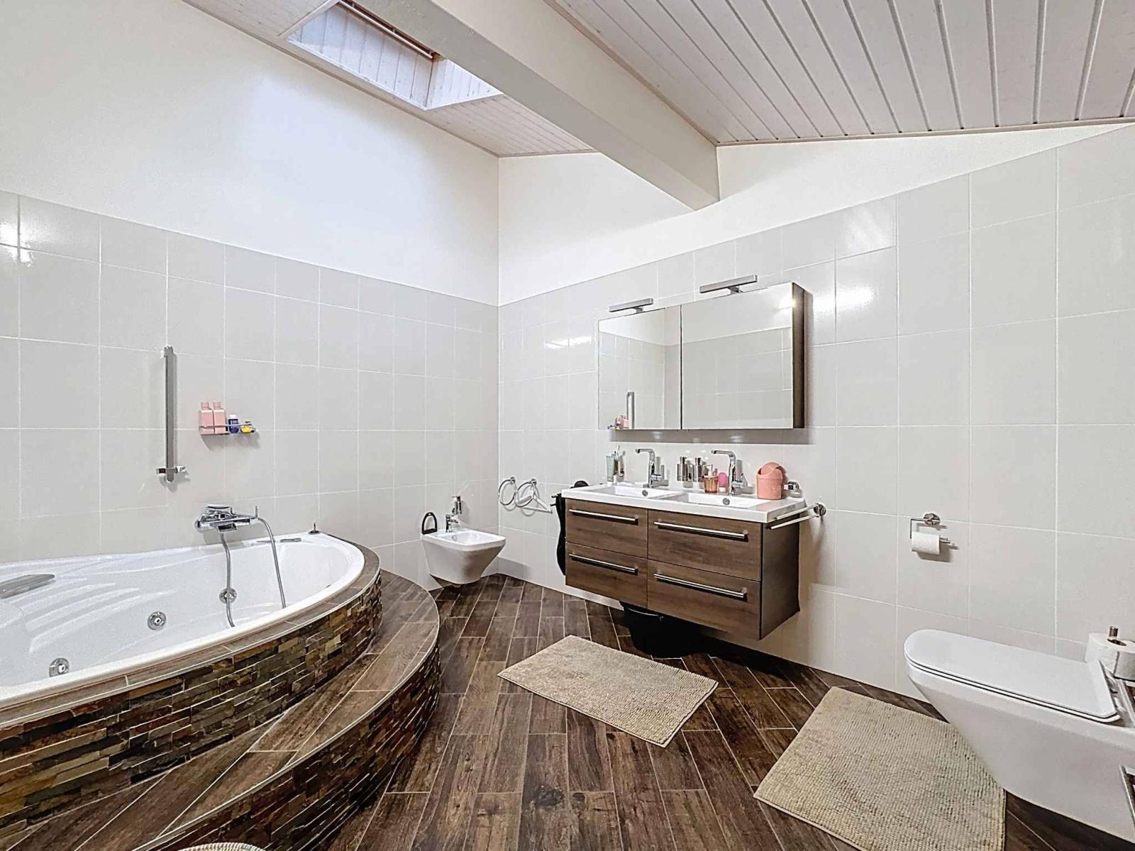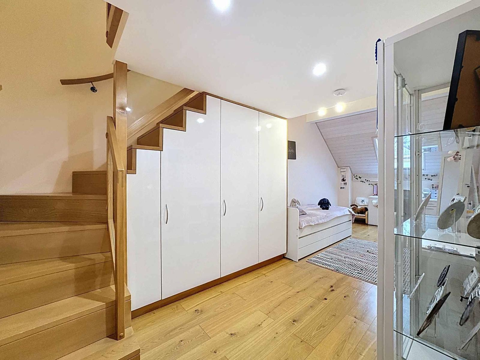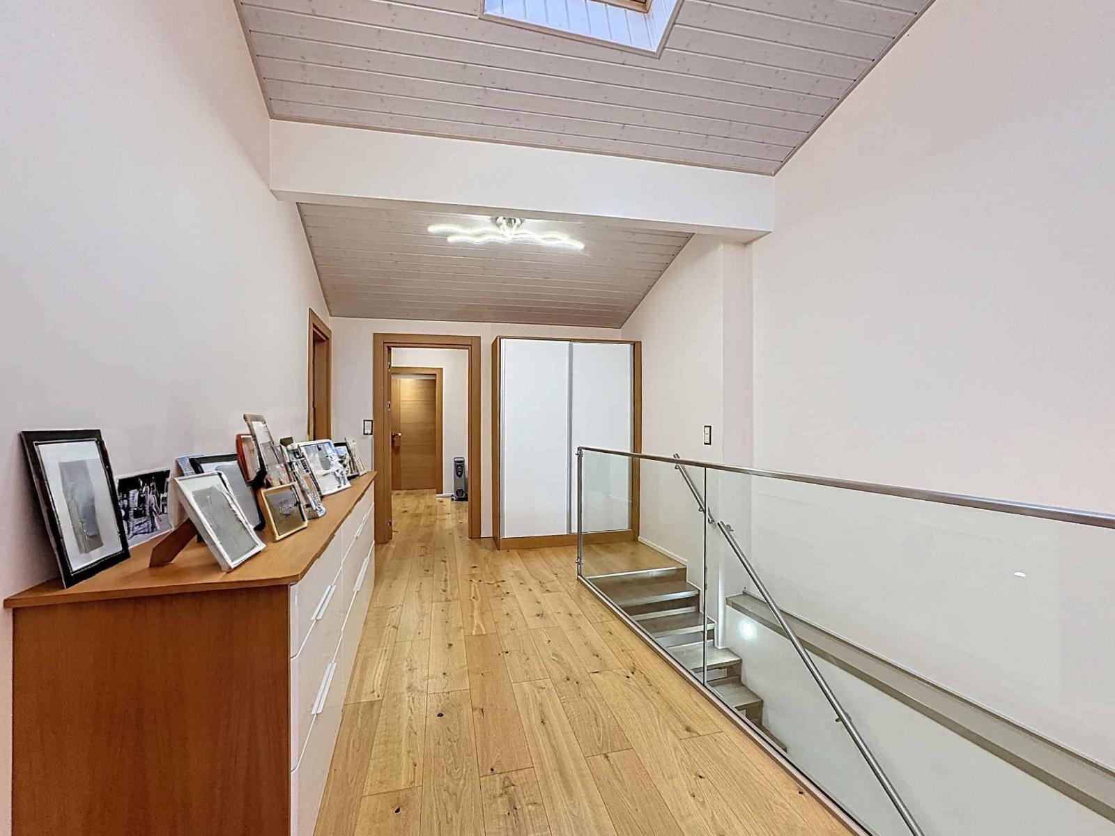 Im ersten Stock befinden sich zwei Schlafzimmer mit Zwischengeschoss, ein Büro, ein großes Gästezimmer, ein Duschbad sowie ein Wellnessbereich bestehend aus einem großen Badezimmer mit Whirlpool und einem großzügigen Ankleidezimmer.