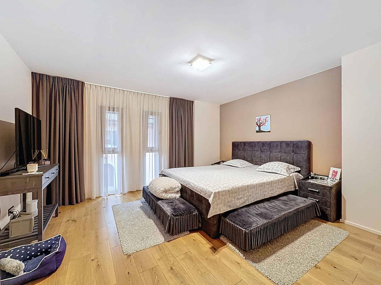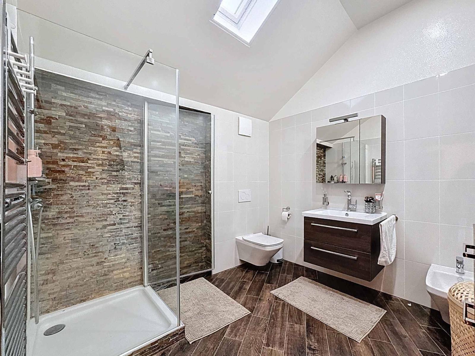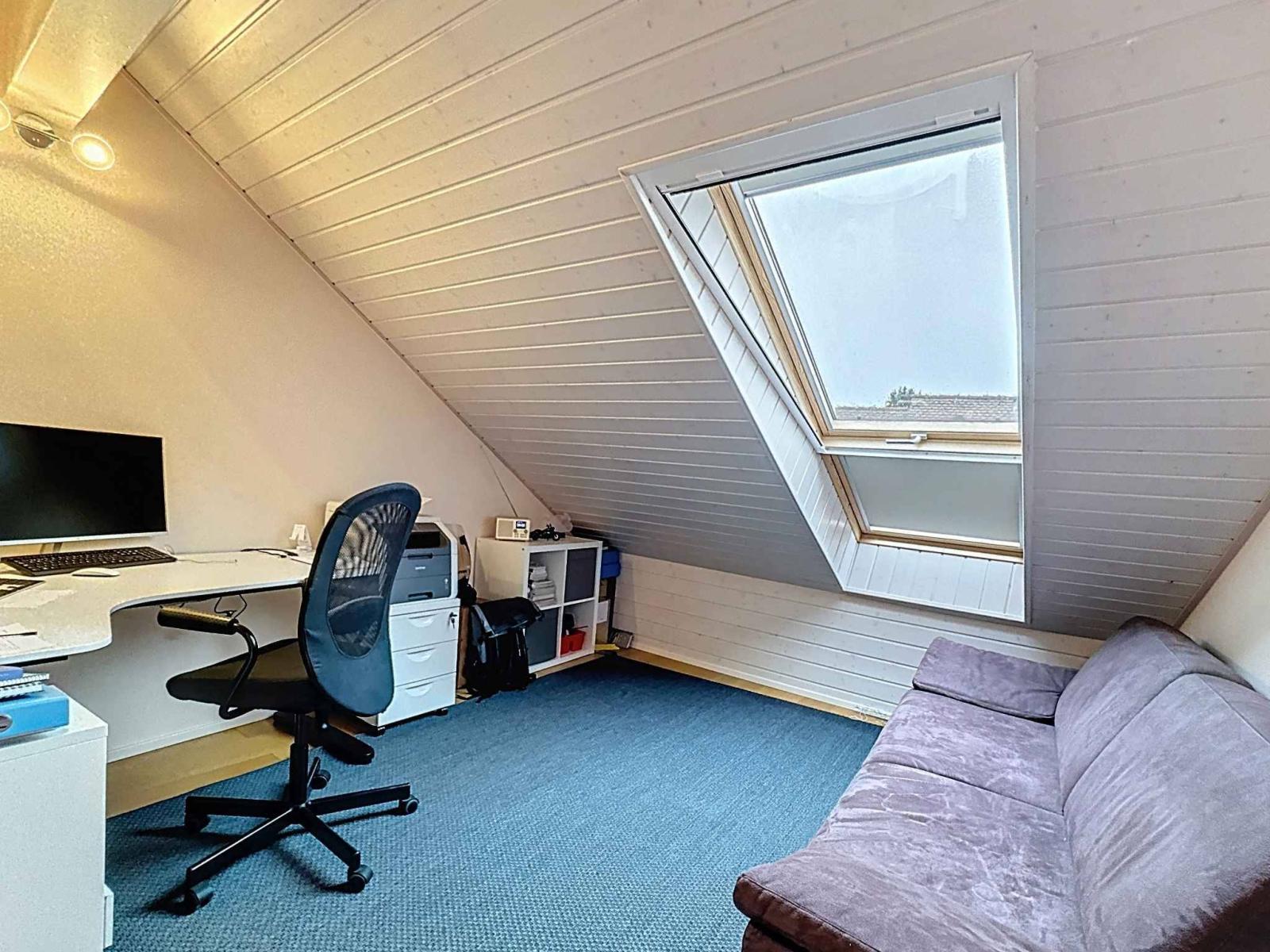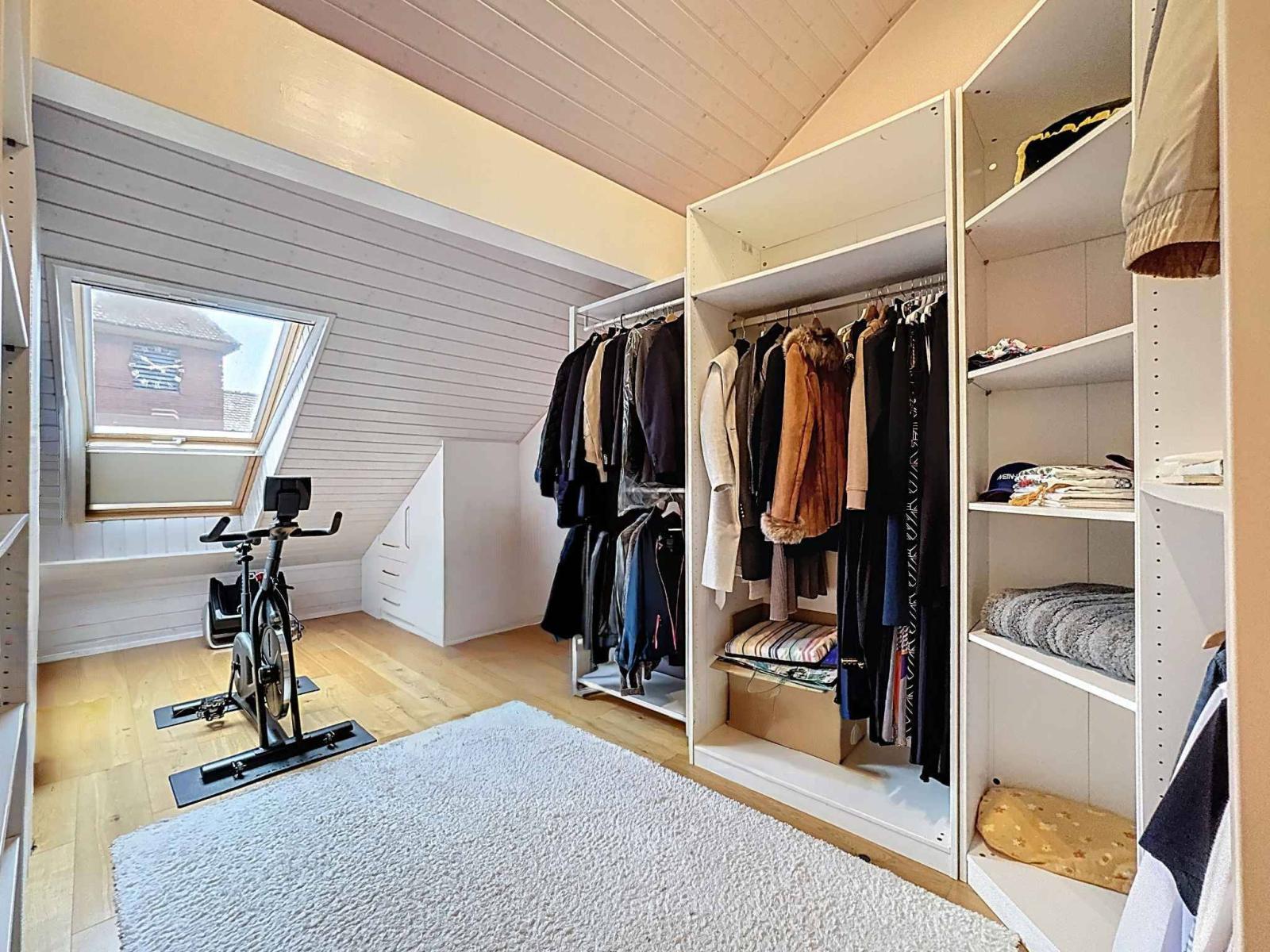 Im ersten Stock befinden sich zwei Schlafzimmer mit Zwischengeschoss, ein Büro, ein großes Gästezimmer, ein Duschbad sowie ein Wellnessbereich bestehend aus einem großen Badezimmer mit Whirlpool und einem großzügigen Ankleidezimmer.