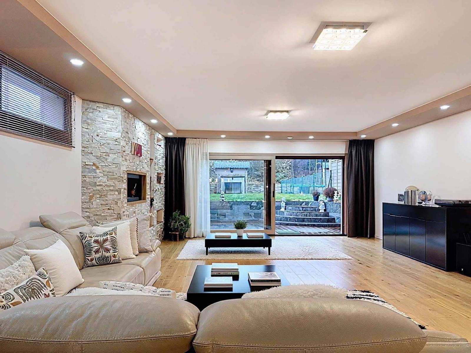 Die sorgfältig ausgewählten Ausbaumaterialien und das prächtige Treppenhaus mit Glasgeländer unterstreichen die zeitgenössische Eleganz dieser Villa.