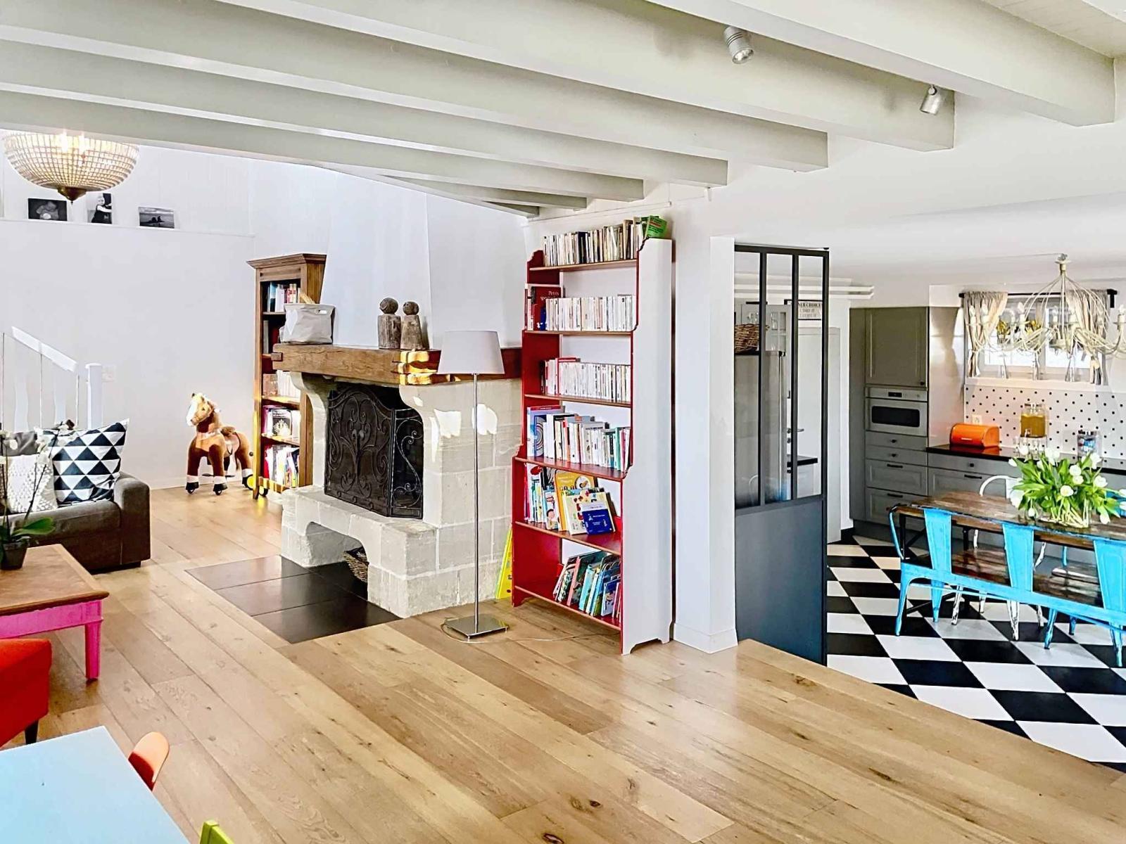 Der Eingang erfolgt durch die Küche, die in ein geräumiges Wohnzimmer mit Kathedraldecke und einem zentralen Kamin übergeht, der dem Raum zusätzlichen Charme verleiht. Auf dieser Ebene befinden sich außerdem ein Büro, ein Hauswirtschaftsraum und ein Gäste-WC.