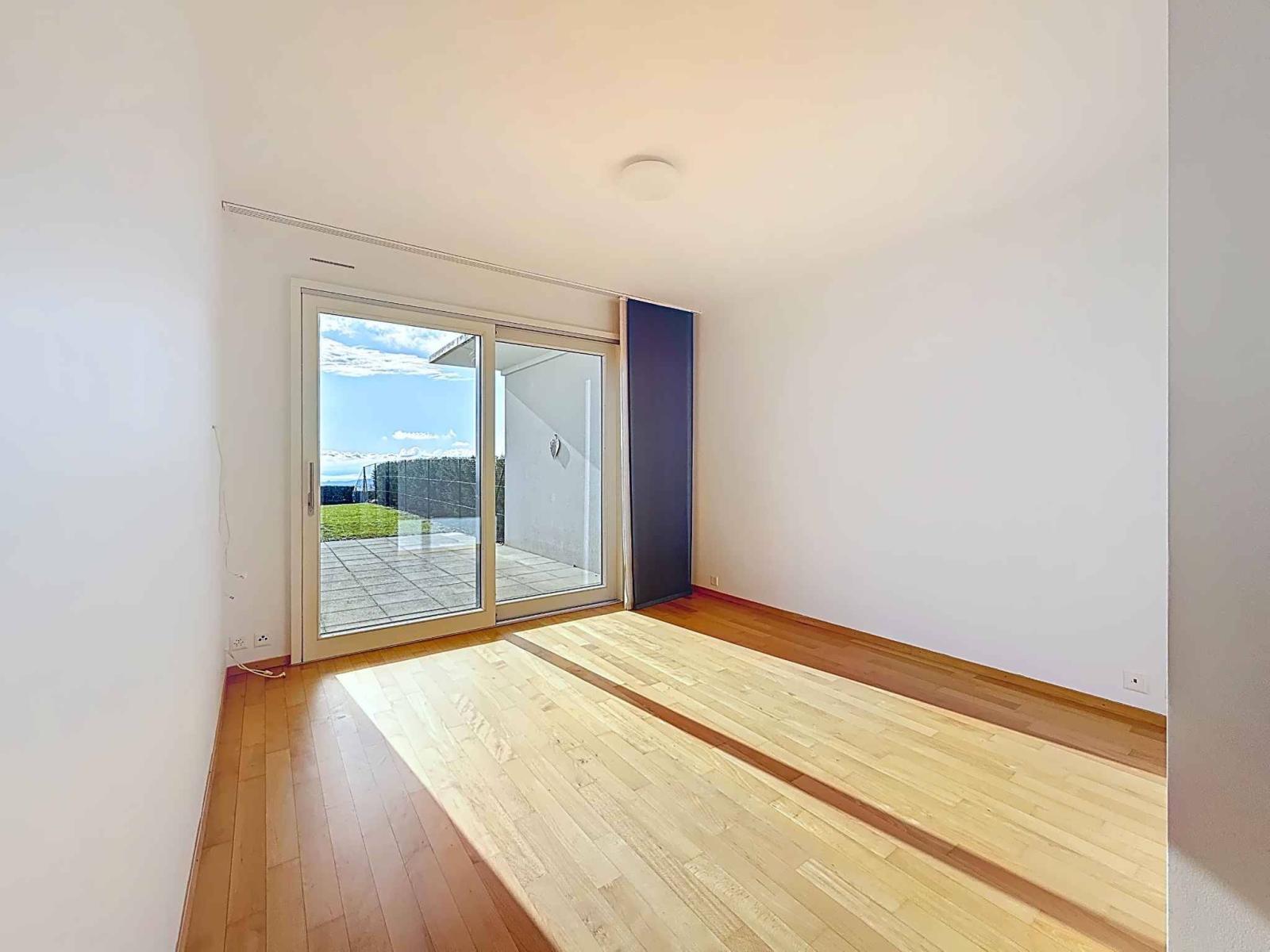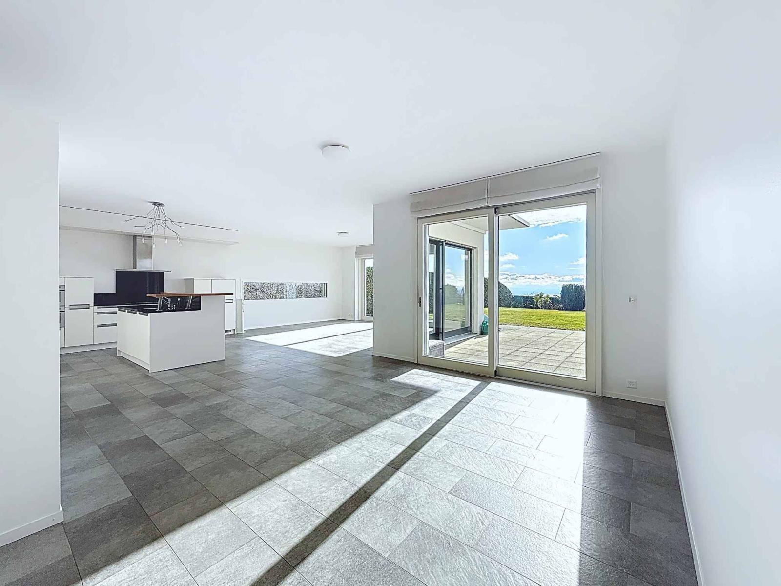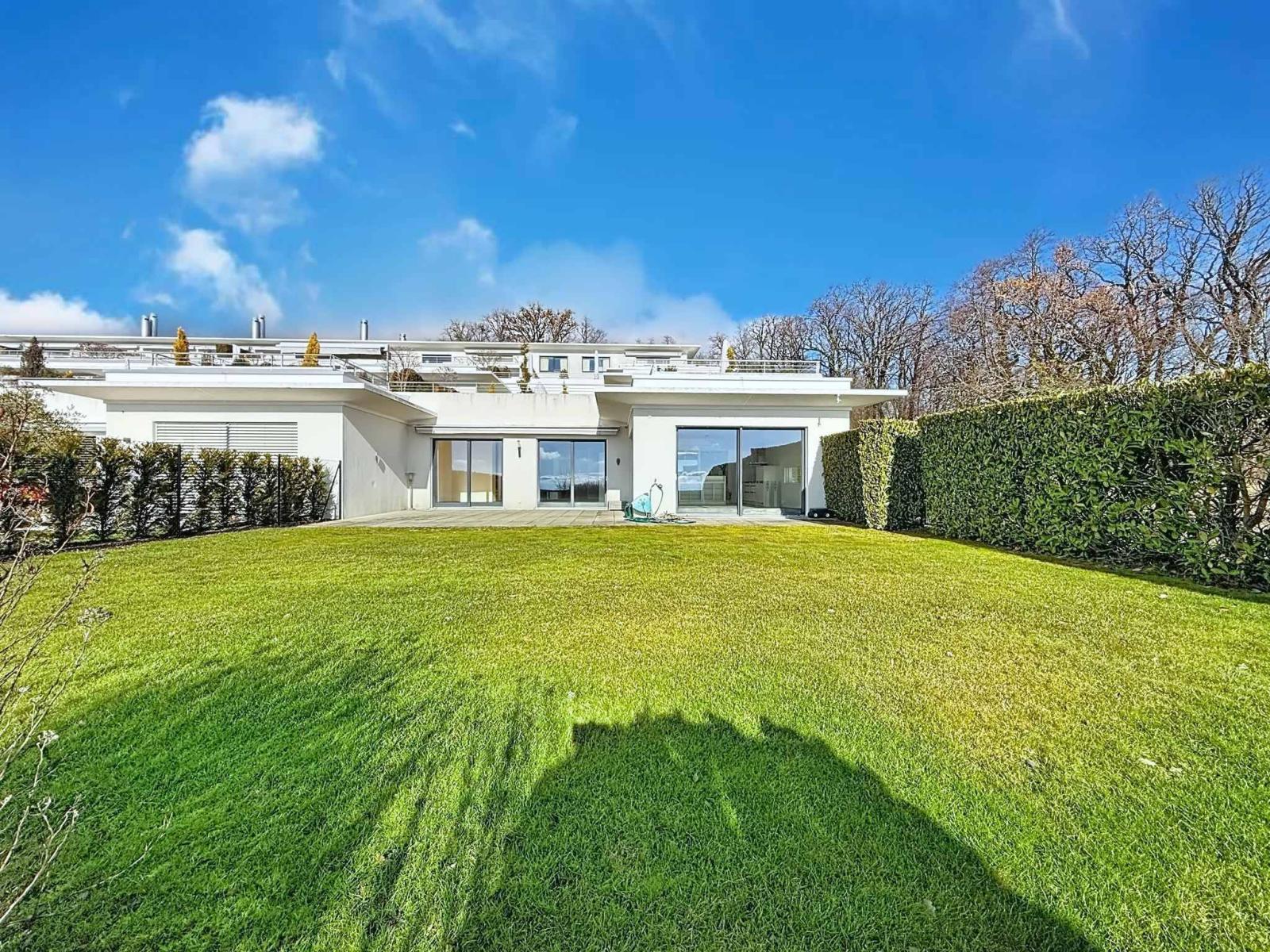 Die nach Süden ausgerichtete Wohnung ist den ganzen Tag über lichtdurchflutet. Terrasse und privater Garten bieten einen atemberaubenden Panoramablick auf den Genfersee und die Alpen in ruhiger Lage am Waldrand. Die großzügige Deckenhöhe und der Innenhof verstärken das Gefühl von Weite und Wohlbefinden.