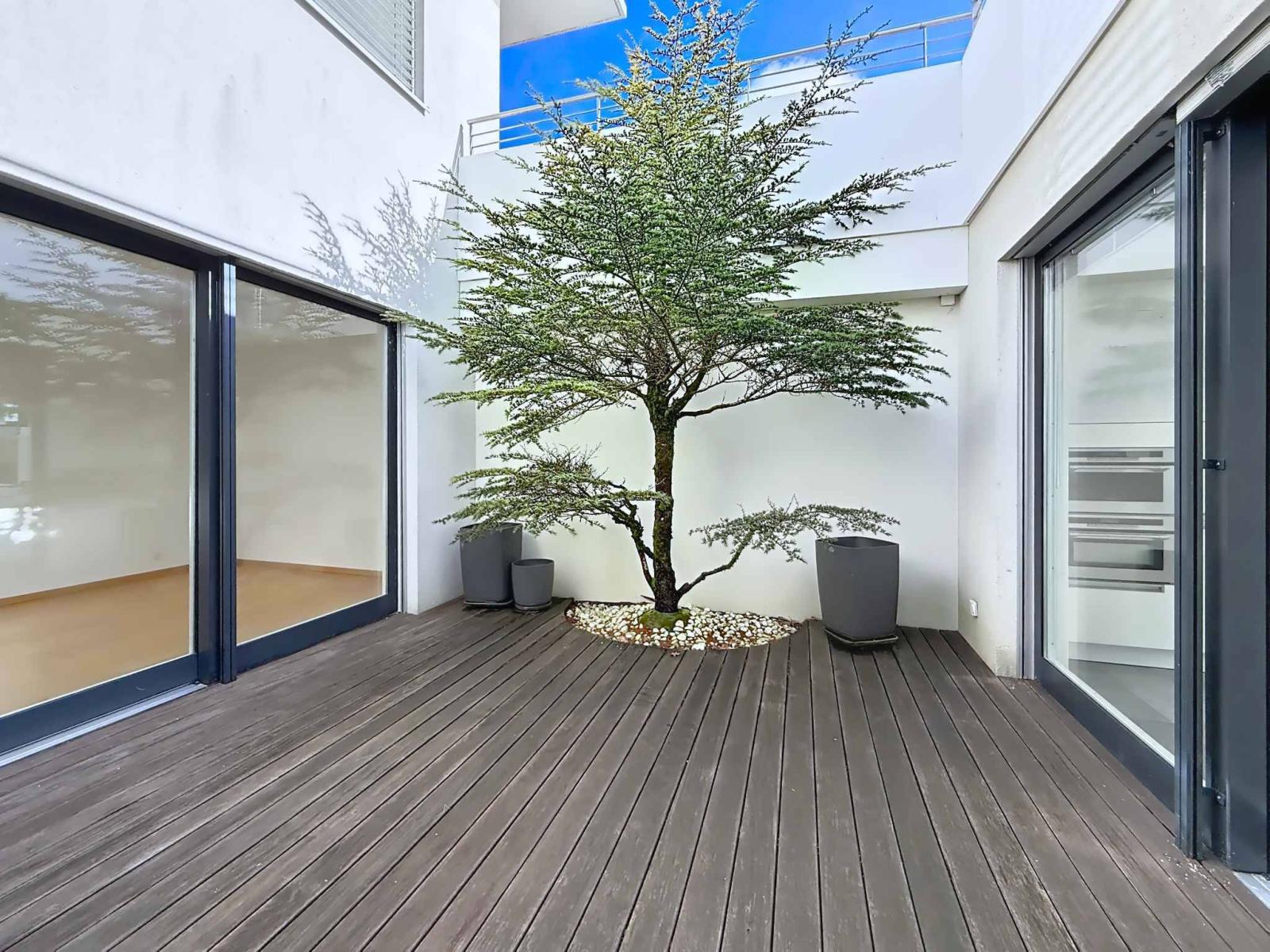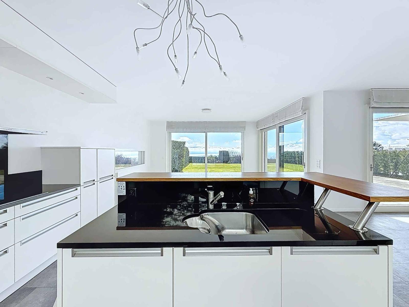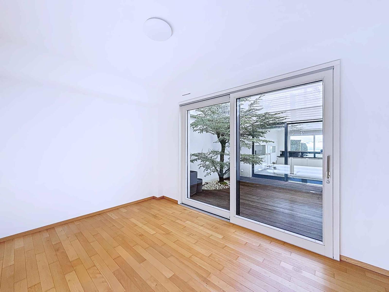 Die nach Süden ausgerichtete Wohnung ist den ganzen Tag über lichtdurchflutet. Terrasse und privater Garten bieten einen atemberaubenden Panoramablick auf den Genfersee und die Alpen in ruhiger Lage am Waldrand. Die großzügige Deckenhöhe und der Innenhof verstärken das Gefühl von Weite und Wohlbefinden.