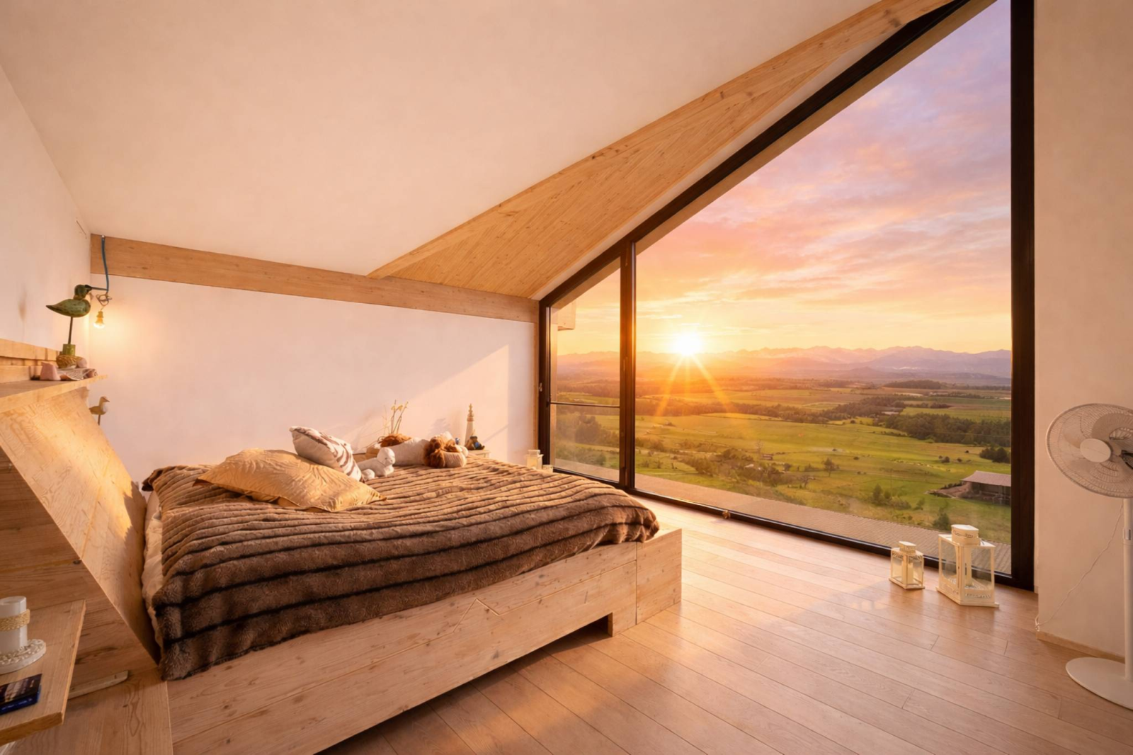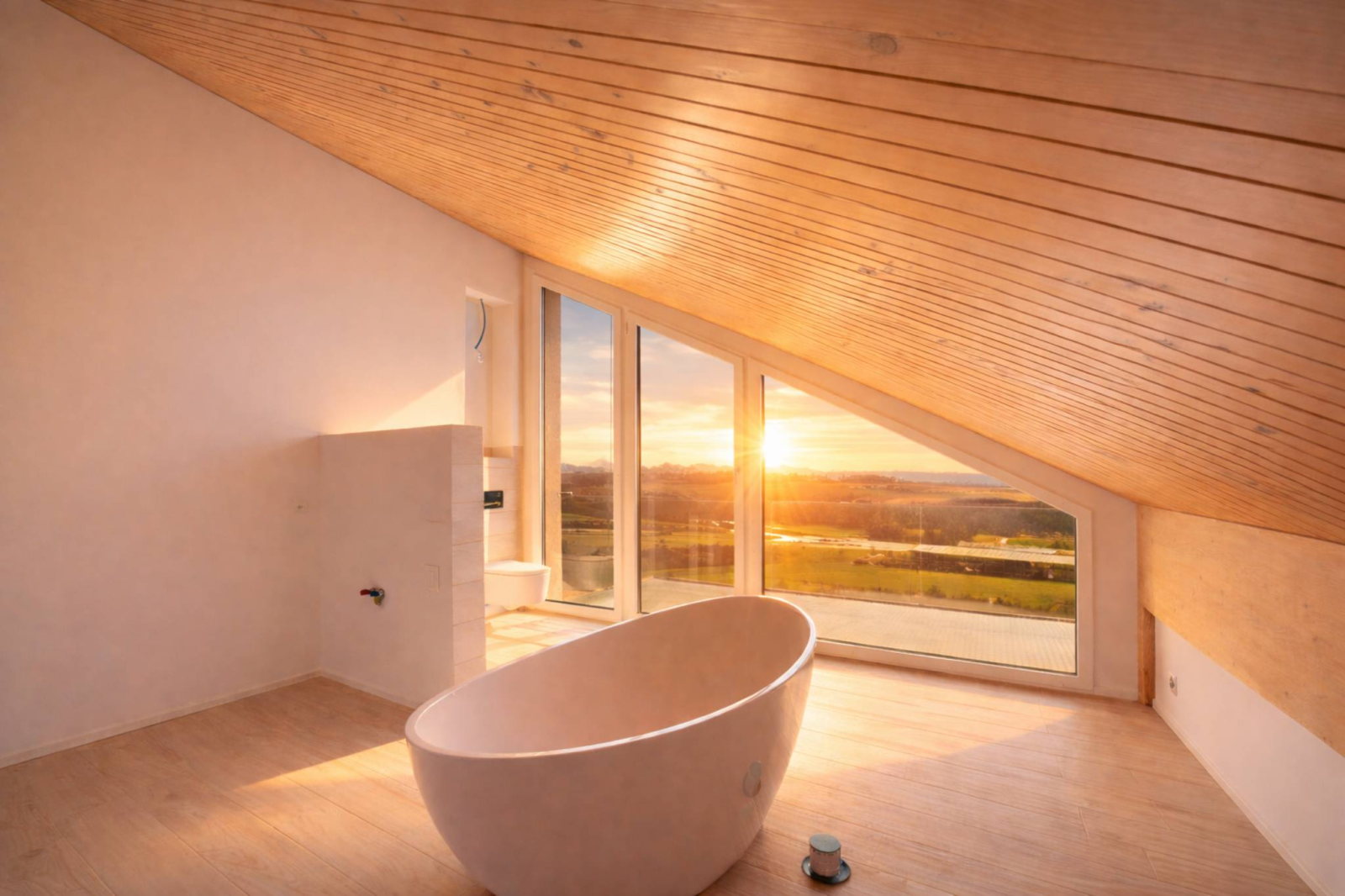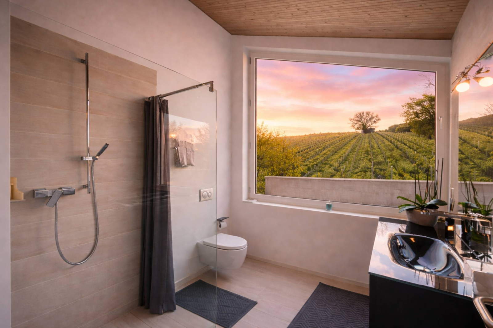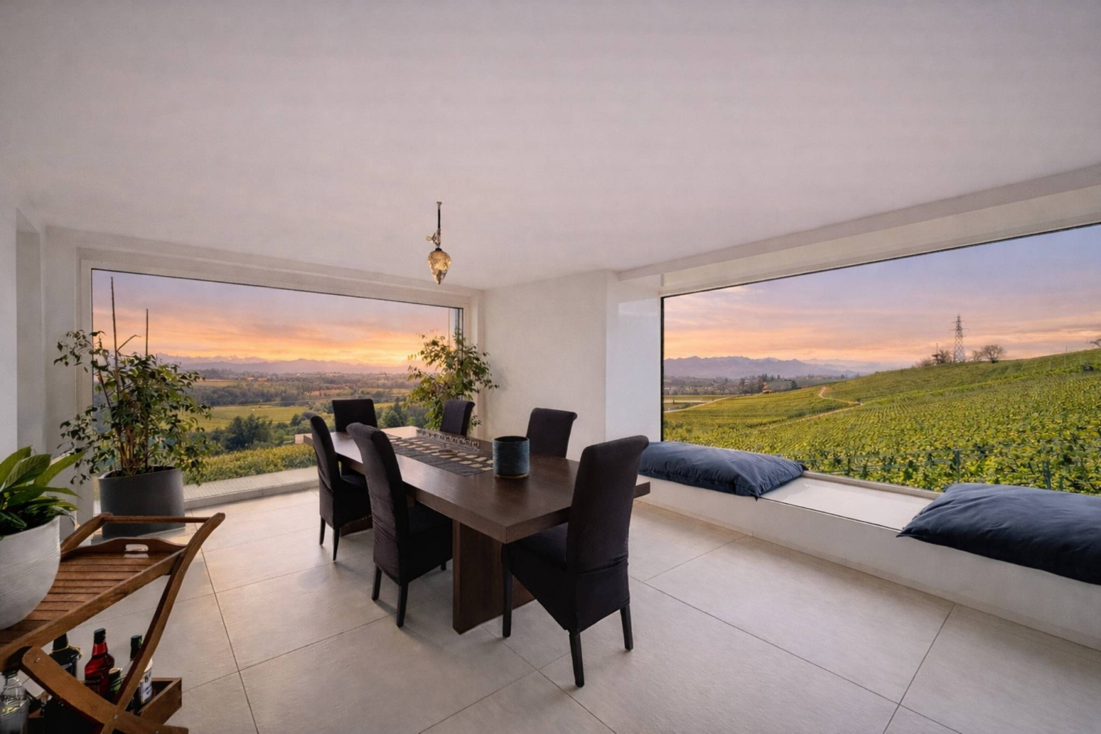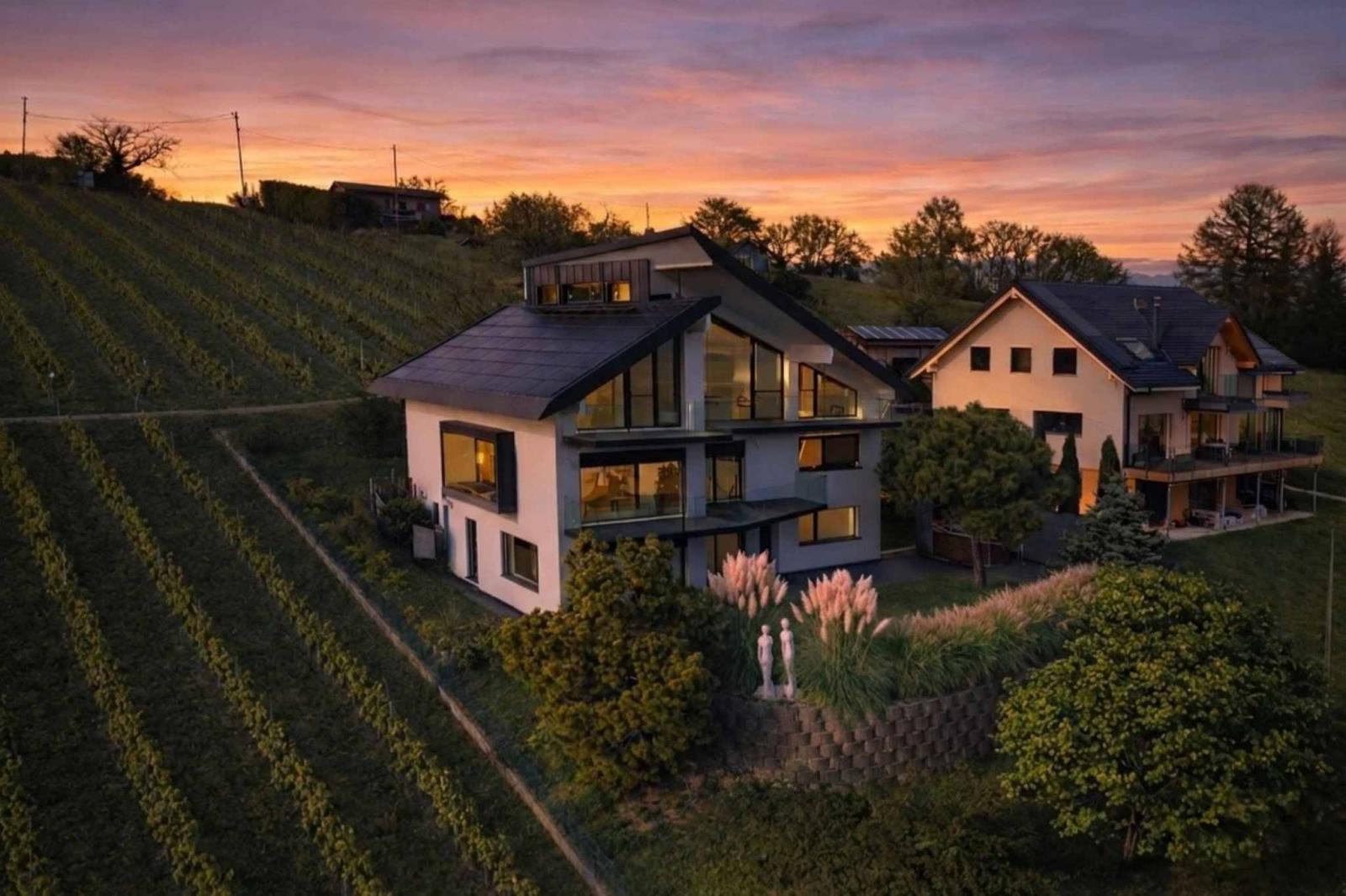 Im Osten fangen die Schlafzimmer die ersten Sonnenstrahlen ein. Man erwacht mit Blick auf die Alpengipfel in einer sanften, stillen Atmosphäre. Im Süden öffnet sich das Wohnzimmer durch raumhohe Fenster, die über den Weinreben zu schweben scheinen. Der Ausblick ist atemberaubend. Der Blick schweift über den Genfersee von Villeneuve nach Genf, gleitet über die Alpen und verweilt auf der Silhouette des Mont Blanc. Ein lebendiges, sich ständig wandelndes, fast surreales Panorama.