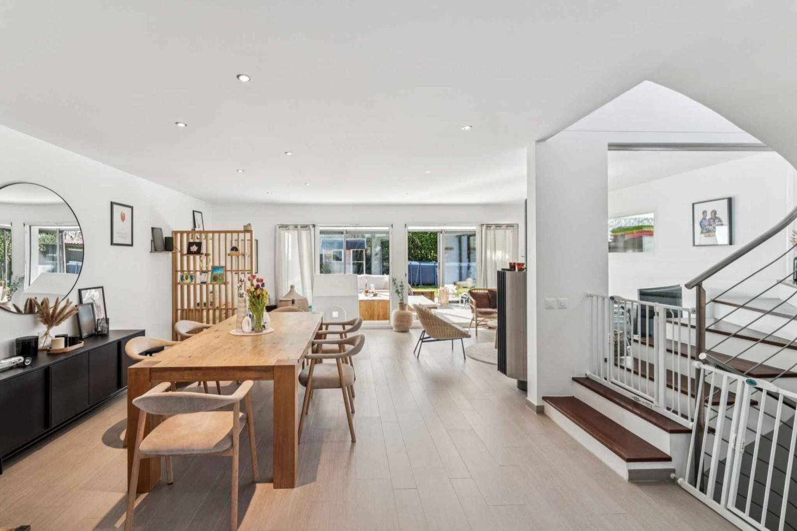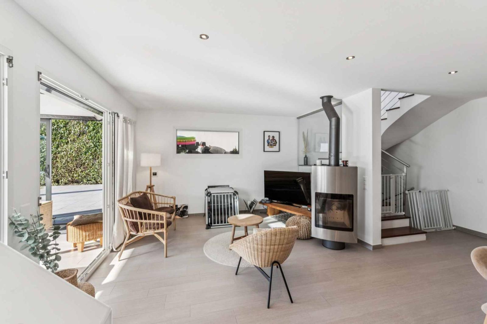 Das Erdgeschoss umfasst eine Eingangshalle, ein Gäste-WC mit Einbauschränken und ein großzügiges Wohnzimmer mit offener Küche und Essbereich. Vom Wohnzimmer mit Kaminofen gelangt man in einen wunderschönen Wintergarten mit Oberlicht und Blick auf die Terrasse.