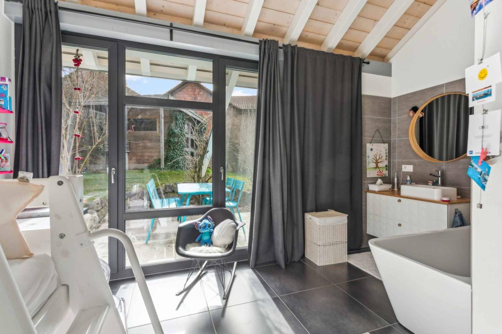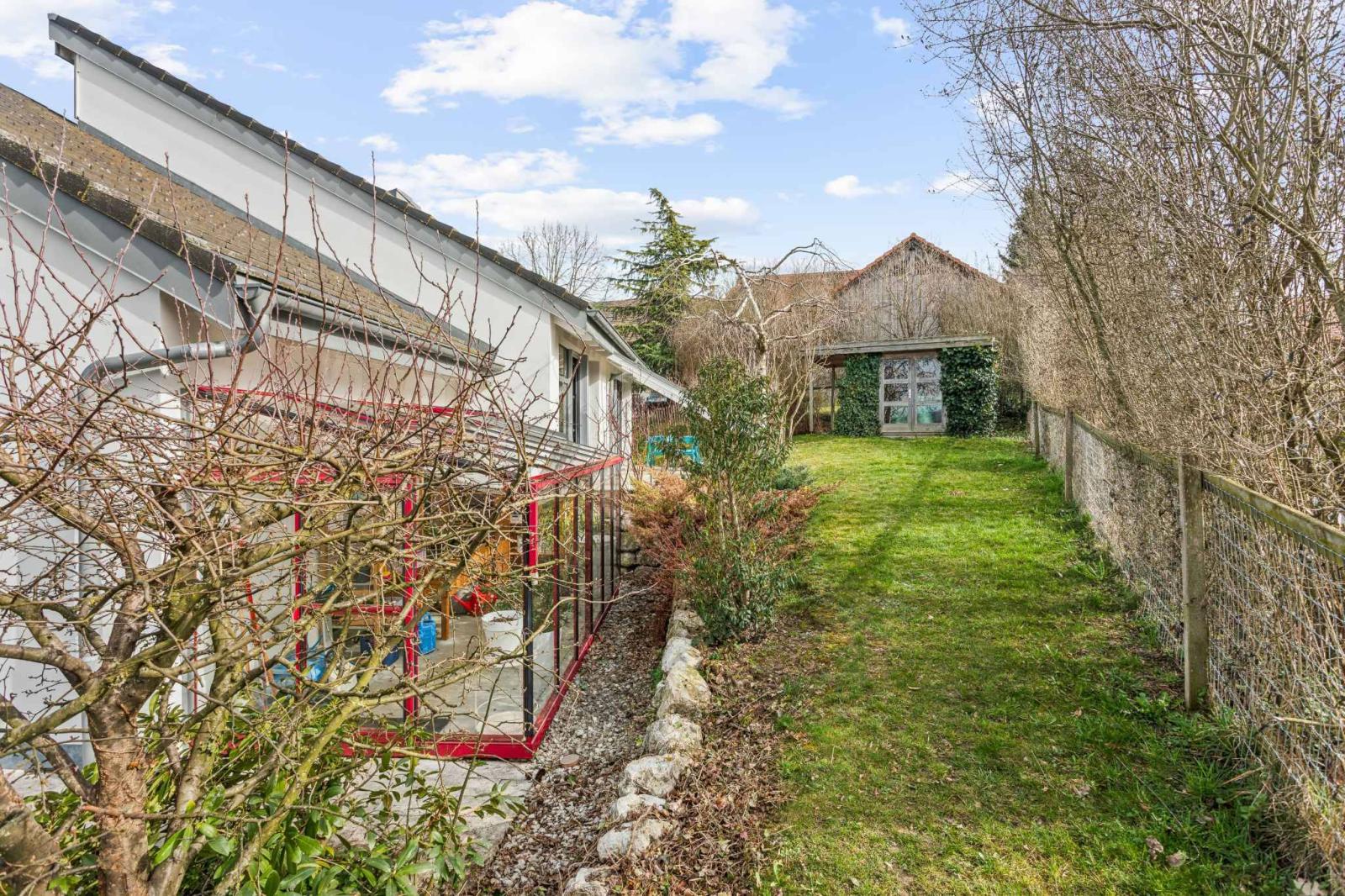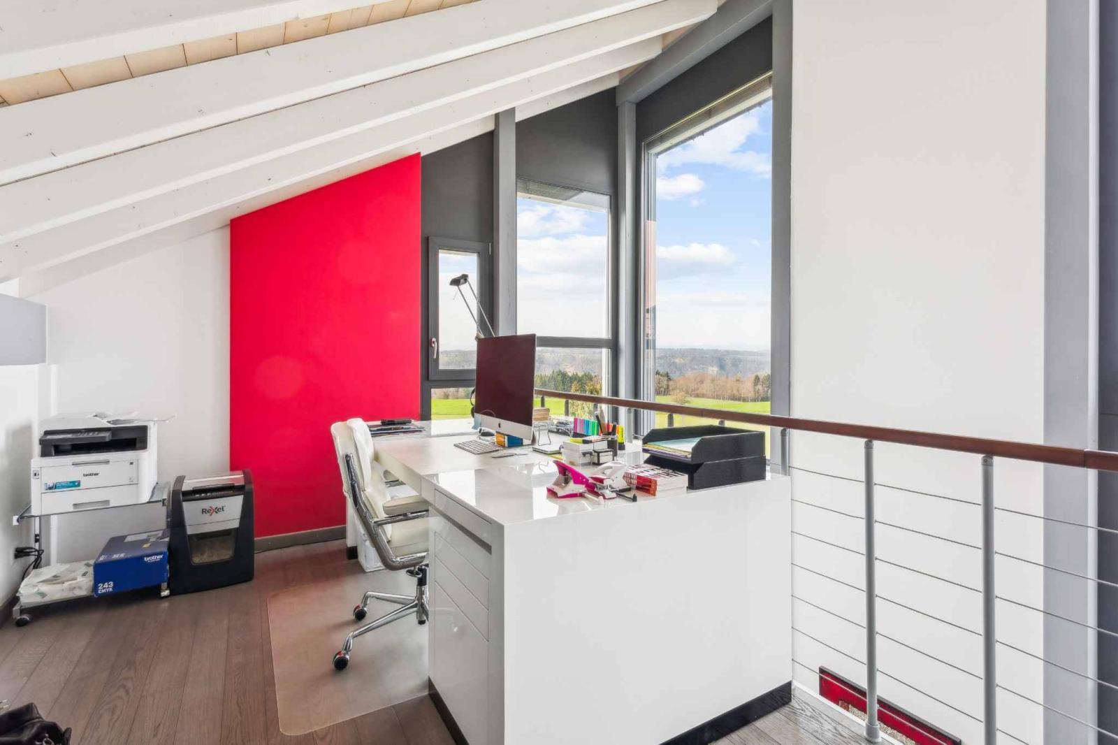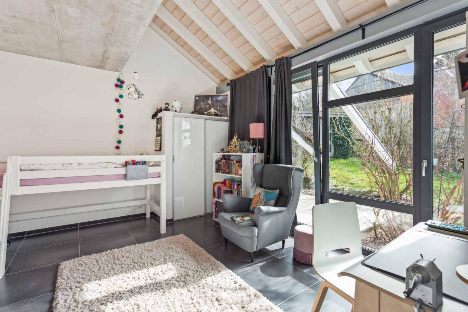 Die Wohnräume umfassen ein geräumiges Wohnzimmer mit Essbereich und eine moderne offene Küche mit direktem Zugang zu Terrasse und Garten. Hohe Decken und ein fließender Übergang zwischen den Ebenen zeichnen die Räume aus. Neben vier komfortablen Schlafzimmern bietet das Haus vielseitig nutzbare Räume wie ein Büro oder eine Werkstatt, die sich flexibel an die Bedürfnisse einer Familie oder eines Homeoffice anpassen lassen.