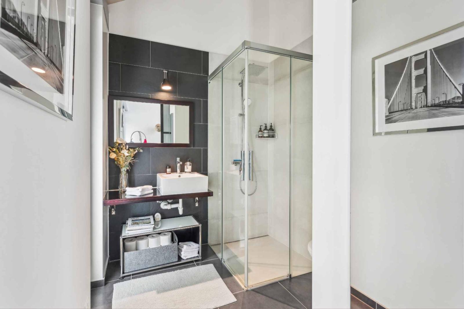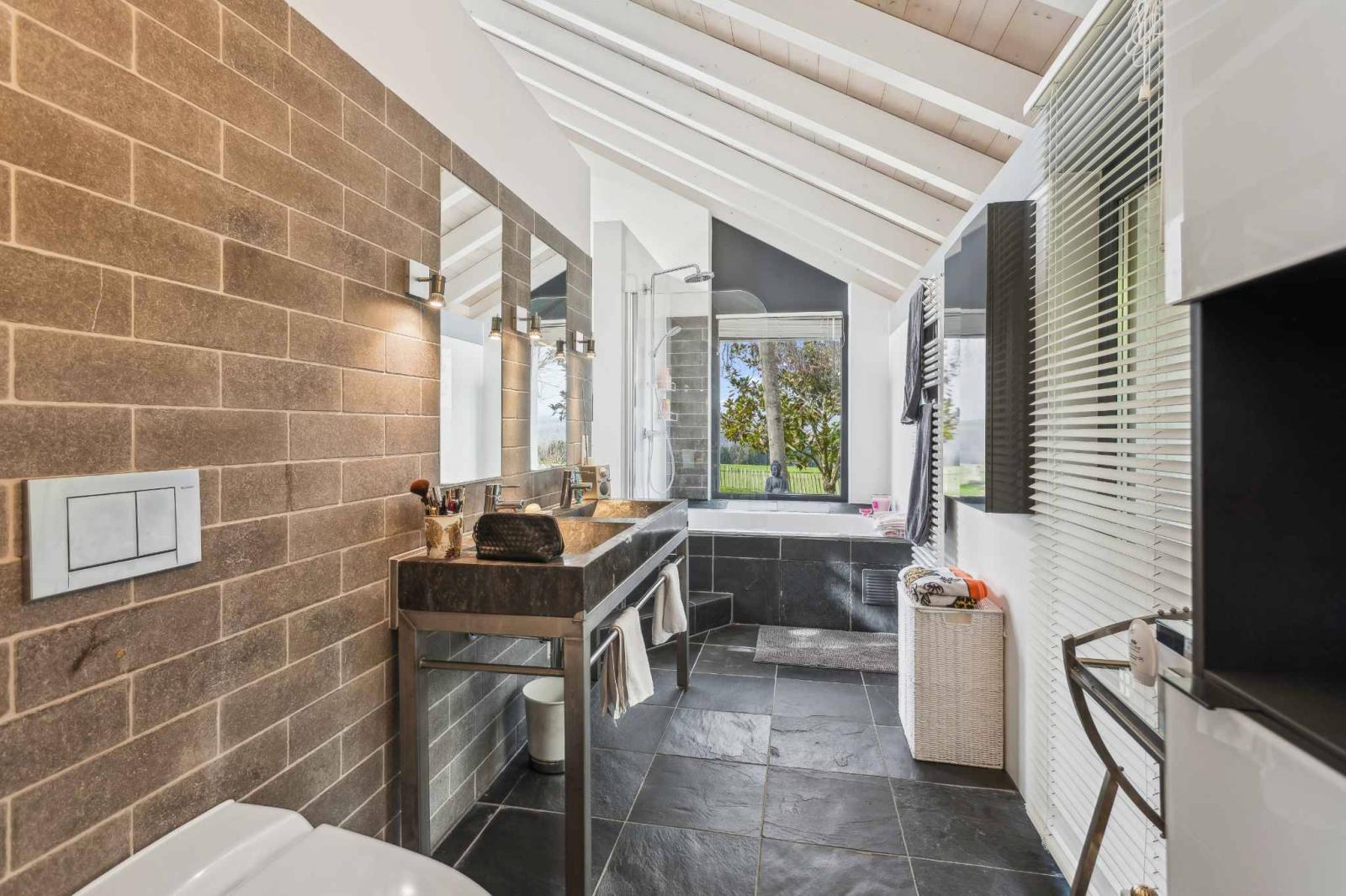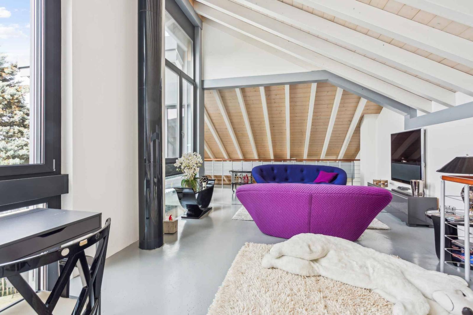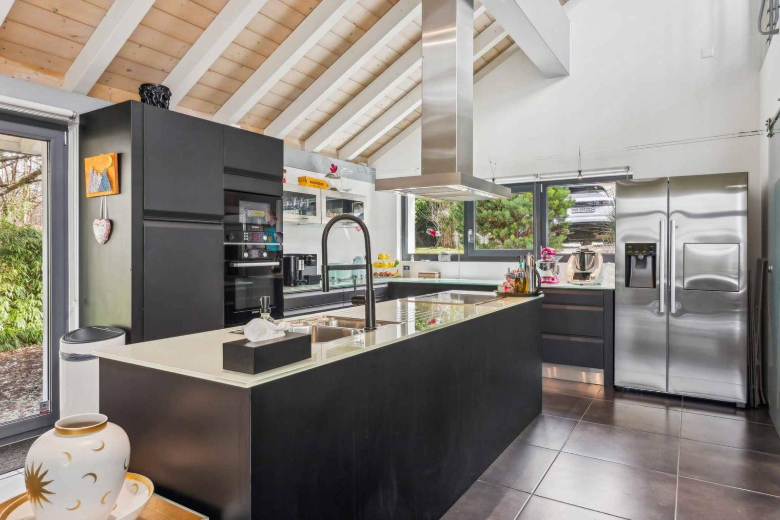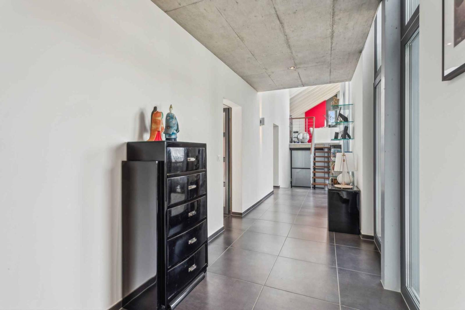 Die Wohnräume umfassen ein geräumiges Wohnzimmer mit Essbereich und eine moderne offene Küche mit direktem Zugang zu Terrasse und Garten. Hohe Decken und ein fließender Übergang zwischen den Ebenen zeichnen die Räume aus. Neben vier komfortablen Schlafzimmern bietet das Haus vielseitig nutzbare Räume wie ein Büro oder eine Werkstatt, die sich flexibel an die Bedürfnisse einer Familie oder eines Homeoffice anpassen lassen.