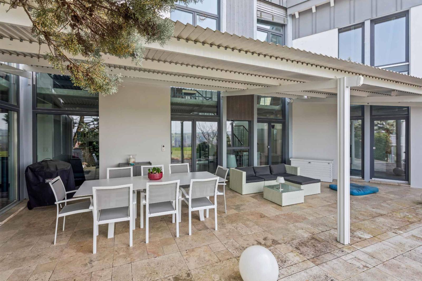 Die Außenbereiche sind ein echtes Highlight des Anwesens. Dazu gehören ein beheizter Swimmingpool von ca. 10 x 4 Metern und eine große Terrasse mit einer bioklimatischen Pergola, die einen idealen Raum bieten, um sonnige Tage in vollen Zügen zu genießen und Familie und Freunde in angenehmer und privater Atmosphäre zu bewirten.