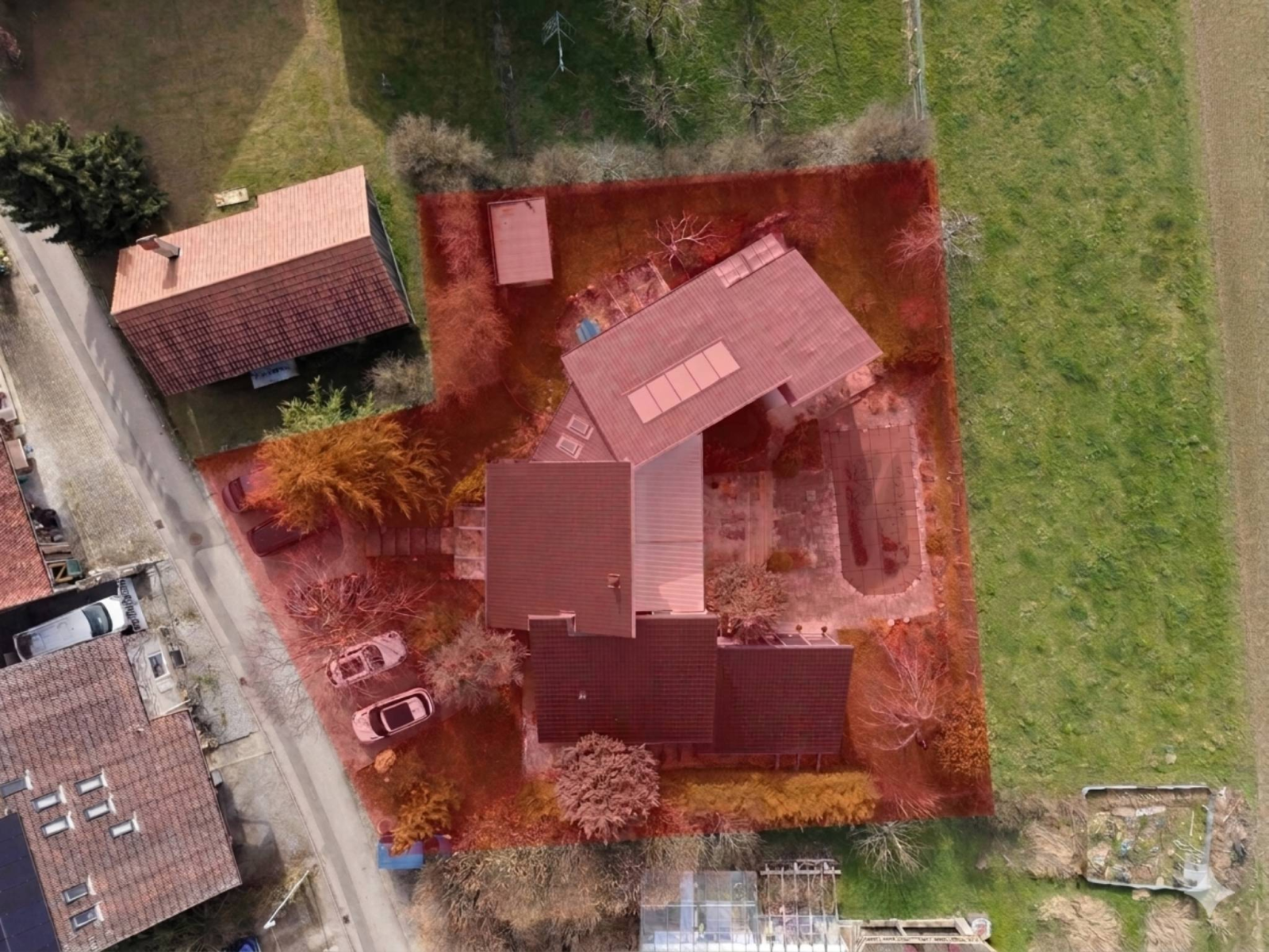 Das Anwesen befindet sich auf einem ca. 1.264 m² großen Grundstück und verfügt über einen wunderschön gestalteten Außenbereich mit Garten, Terrassen und beheiztem Swimmingpool. Es bietet ein ideales Wohnumfeld für eine Familie, die Ruhe und gehobene Annehmlichkeiten sucht.