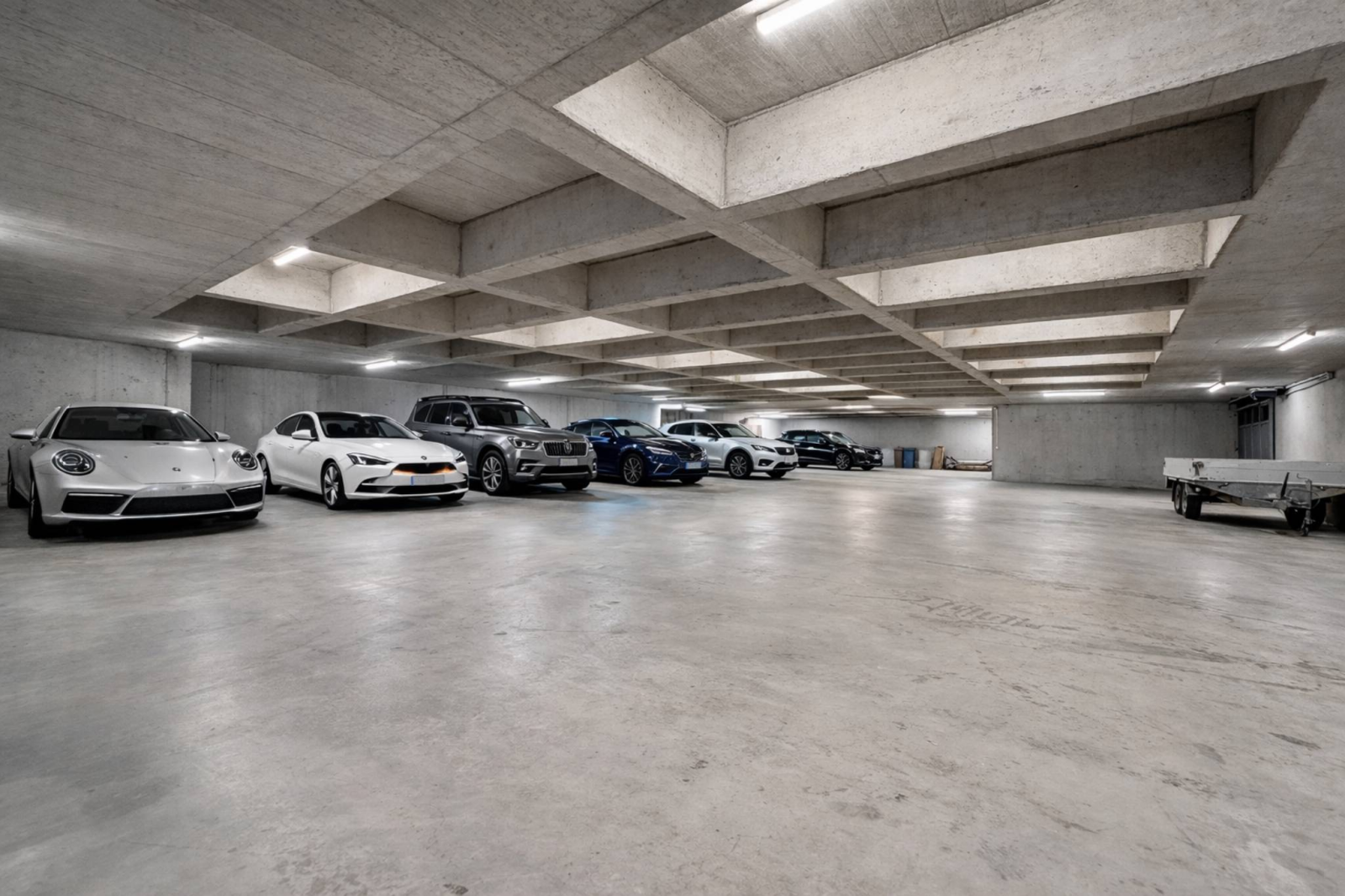 Die unteren Etagen bieten großzügige, flexibel nutzbare Räume, die je nach Bedarf die Einrichtung eines Fitnessraums, Heimkinos oder Freizeitbereichs ermöglichen. Eine Tiefgarage mit Platz für bis zu neun Fahrzeuge sowie mehrere Außenstellplätze runden dieses außergewöhnliche Anwesen ab.