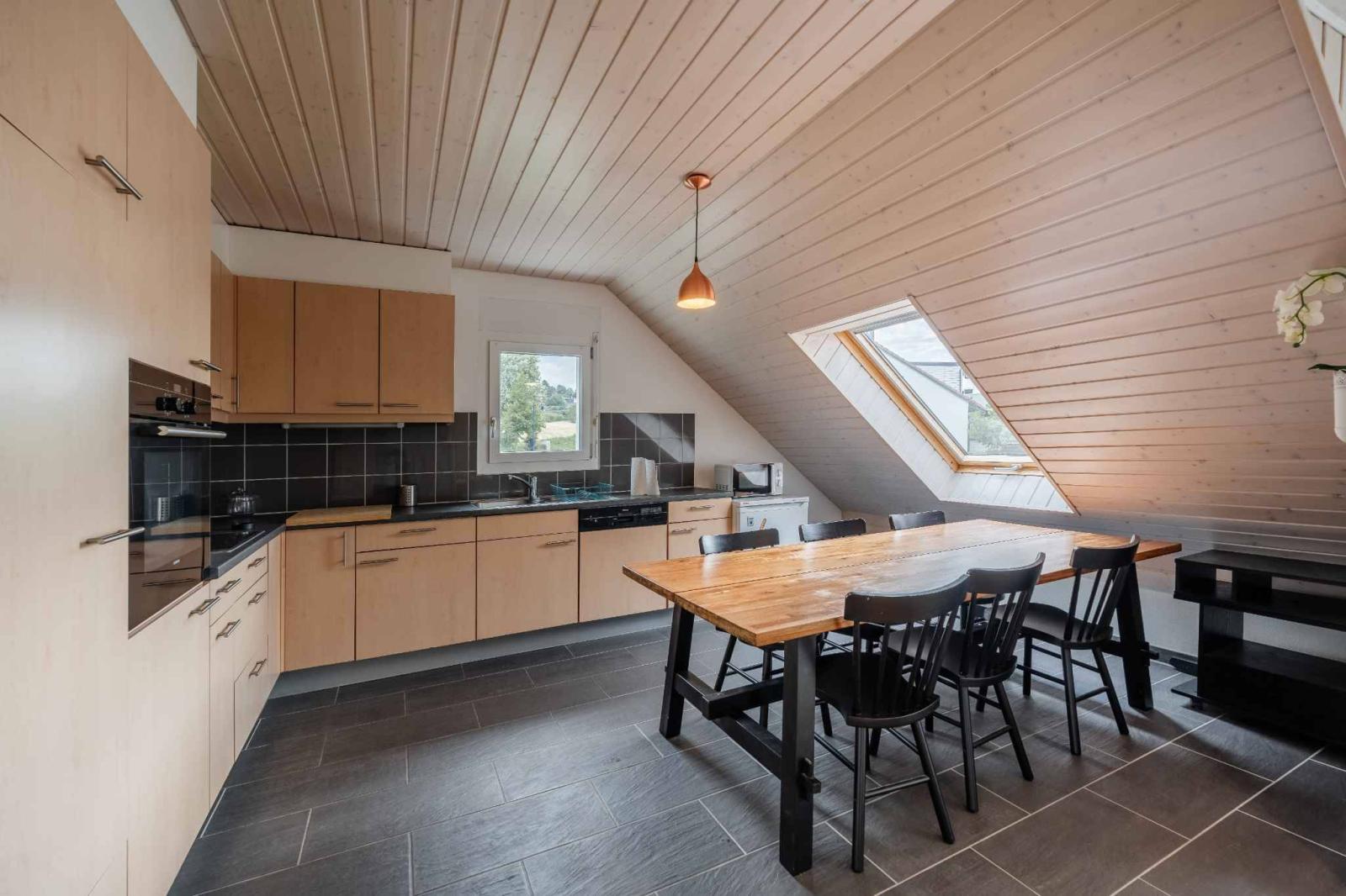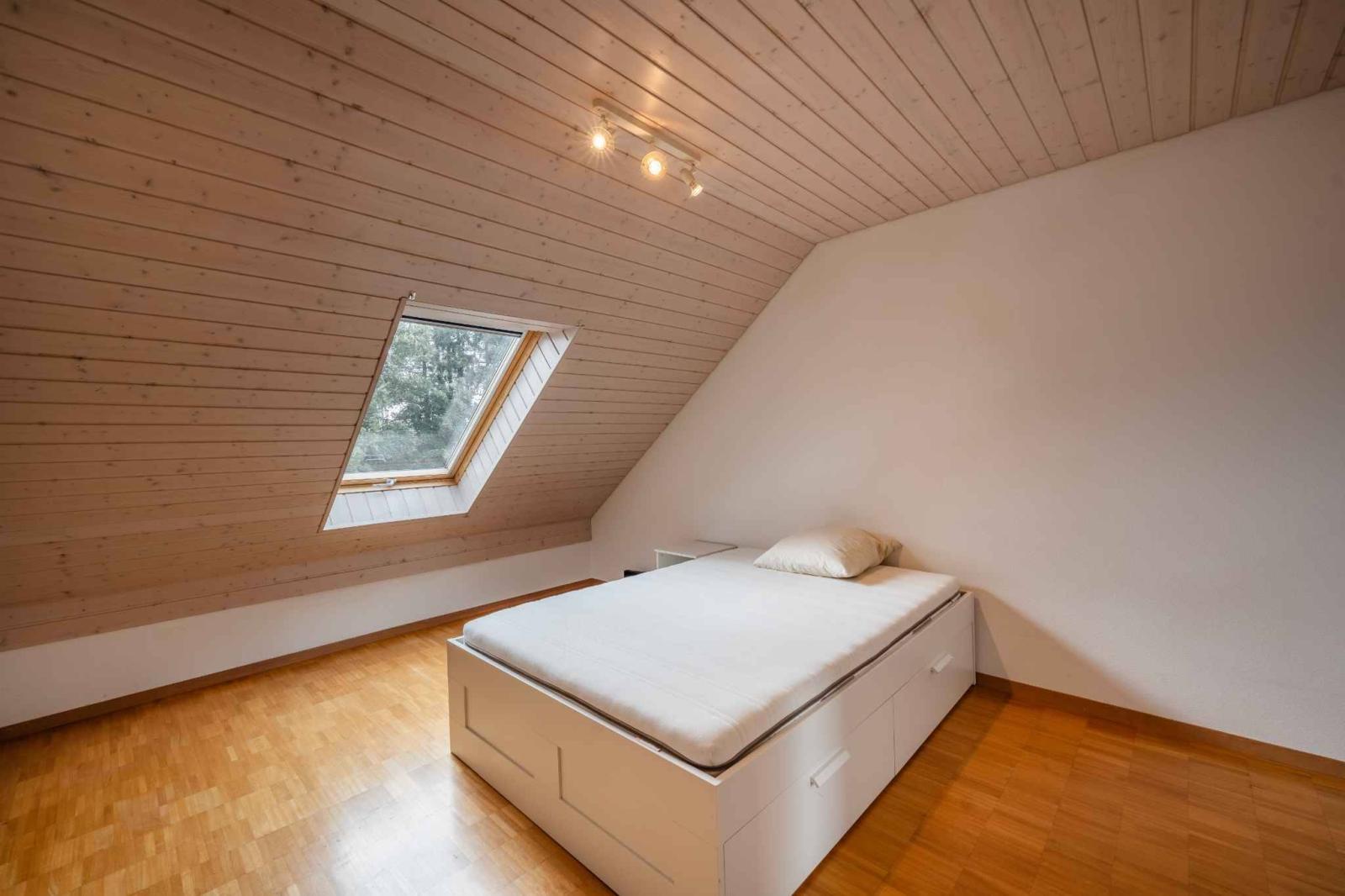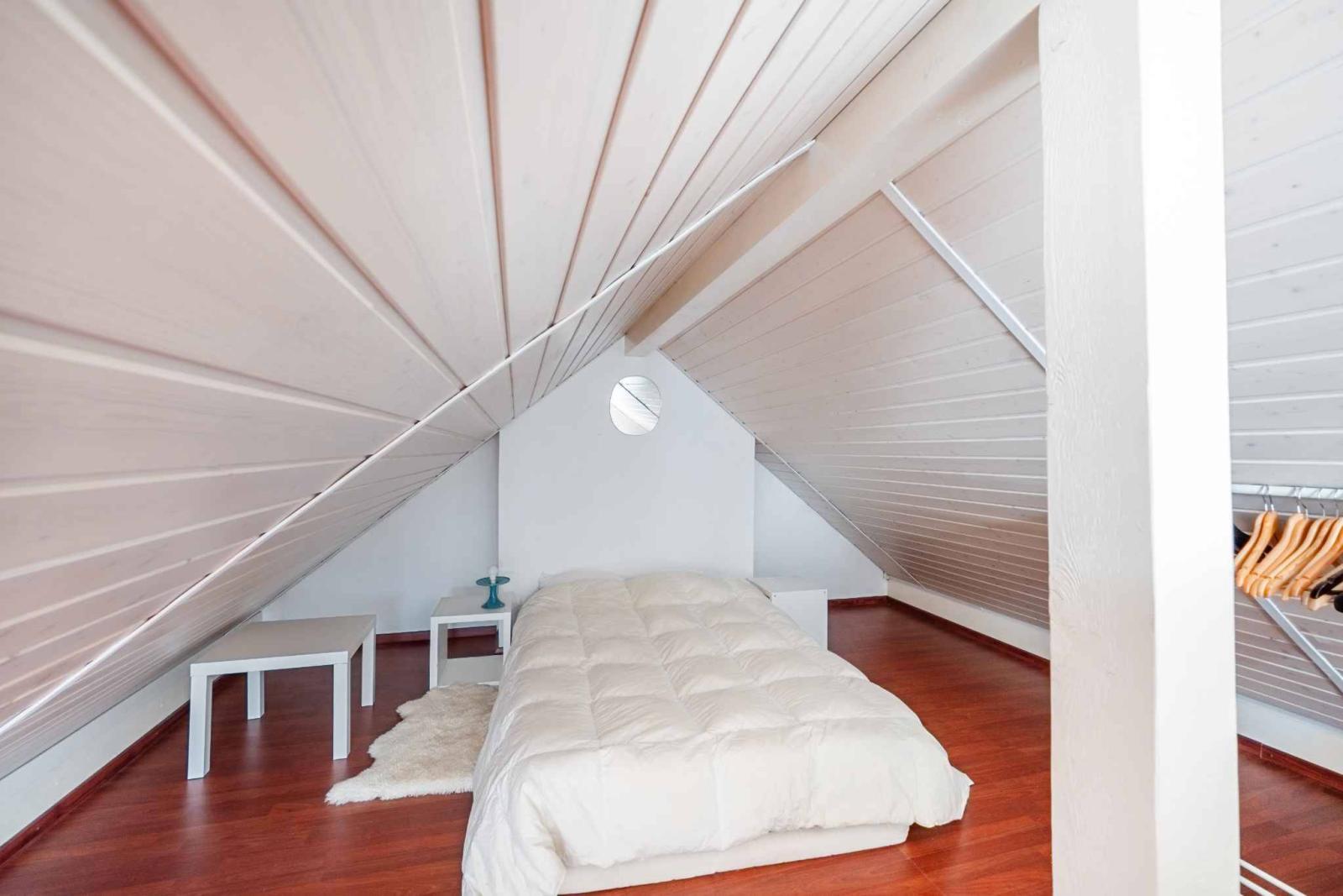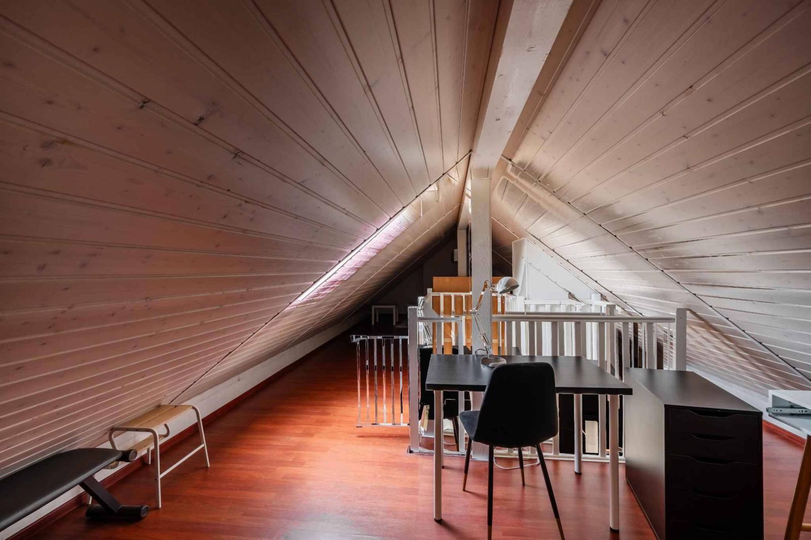 Der Schlafbereich umfasst drei Schlafzimmer und ein Badezimmer mit Badewanne. Im Obergeschoss bietet ein geräumiges Zwischengeschoss zusätzlichen Raum, der je nach Bedarf als Büro, Leseecke oder Entspannungsbereich genutzt werden kann.