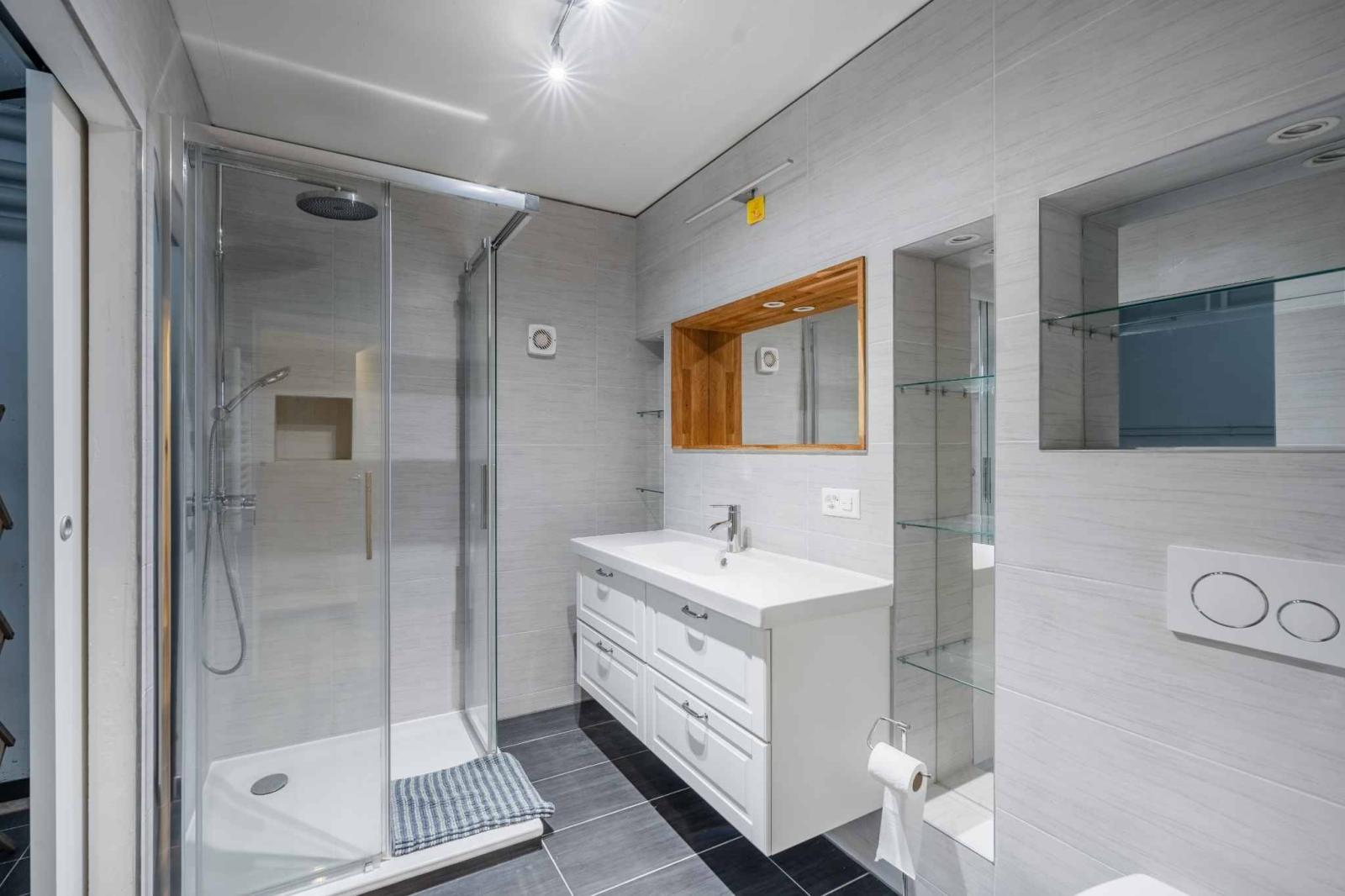 Im Untergeschoss befinden sich ein zweites Badezimmer mit Dusche sowie ein separater Waschraum, was den täglichen Komfort deutlich erhöht.