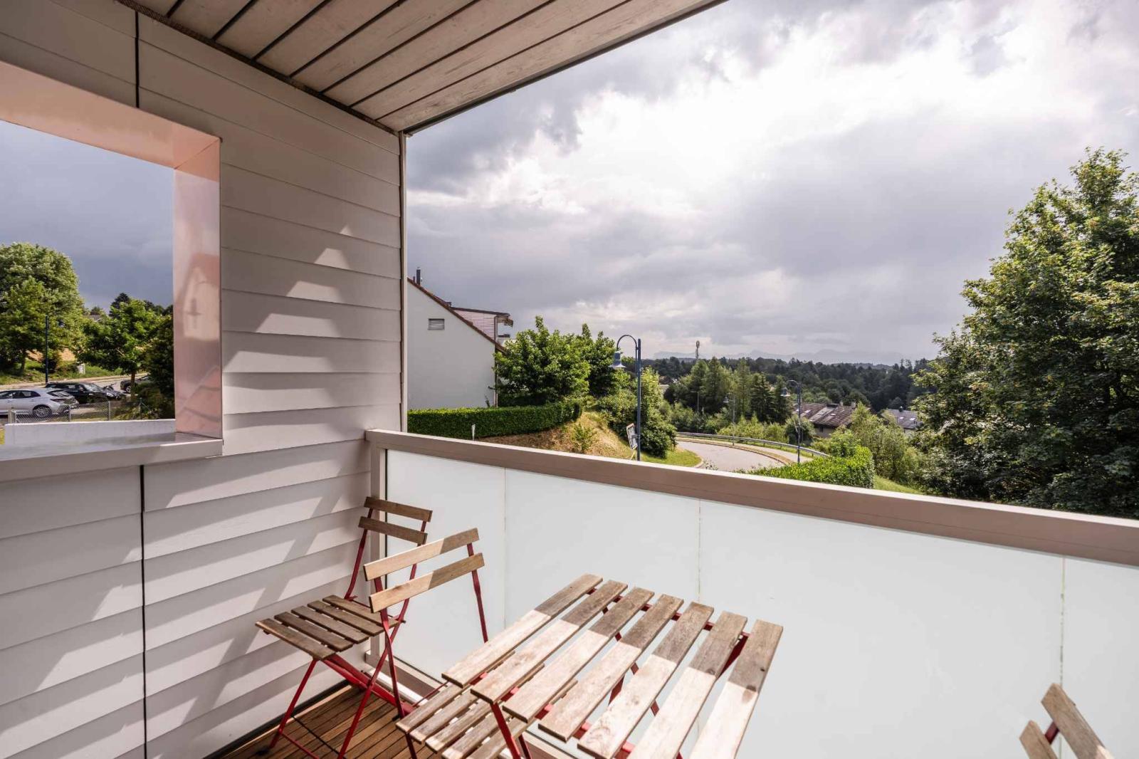 Der Hauptwohnbereich besteht aus einem hellen Wohnzimmer mit Zugang zu einer voll ausgestatteten Küche. Zusammen bilden sie einen einladenden und angenehmen Wohnraum, der durch einen Balkon mit Blick ins Grüne erweitert wird.