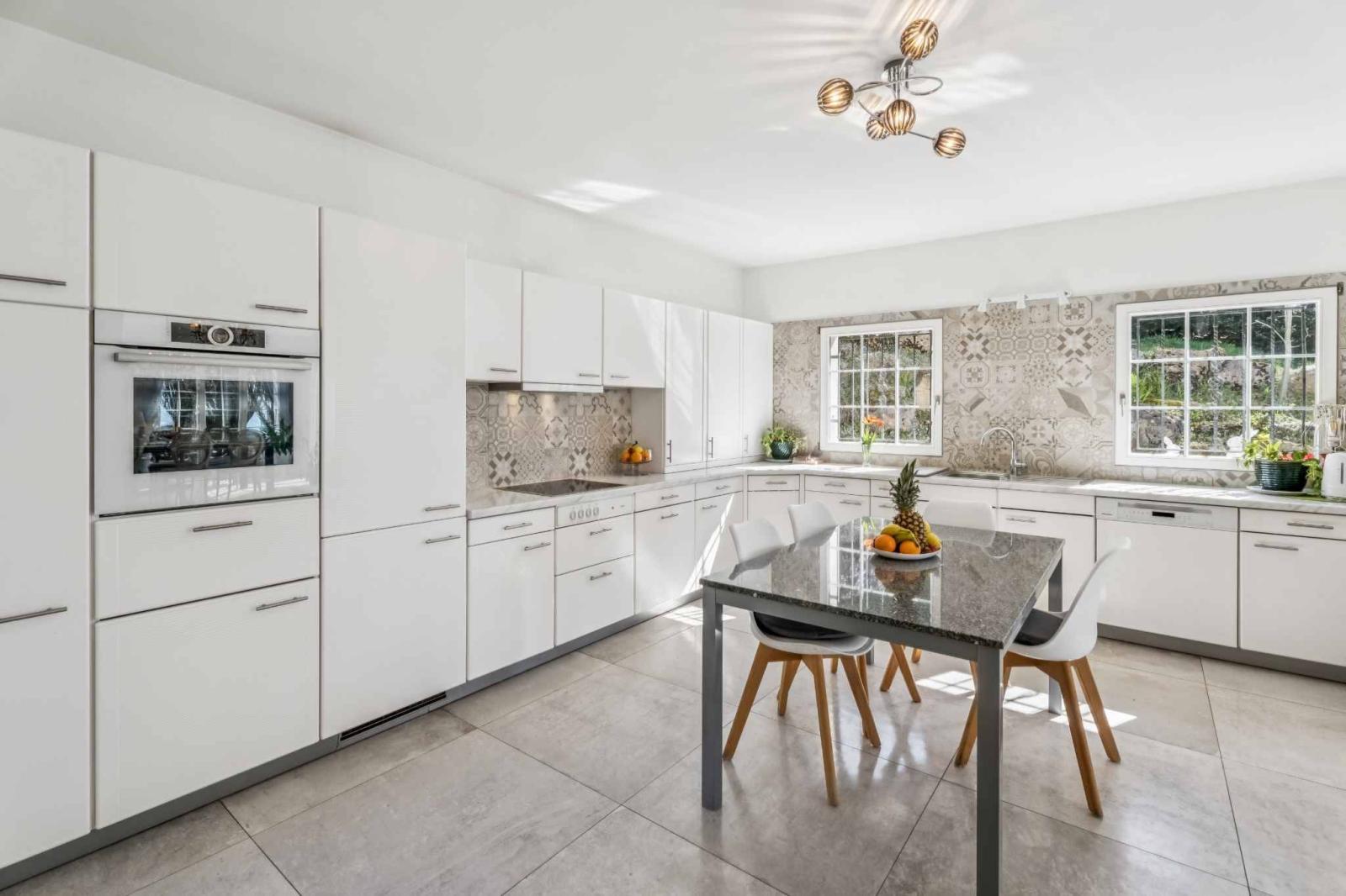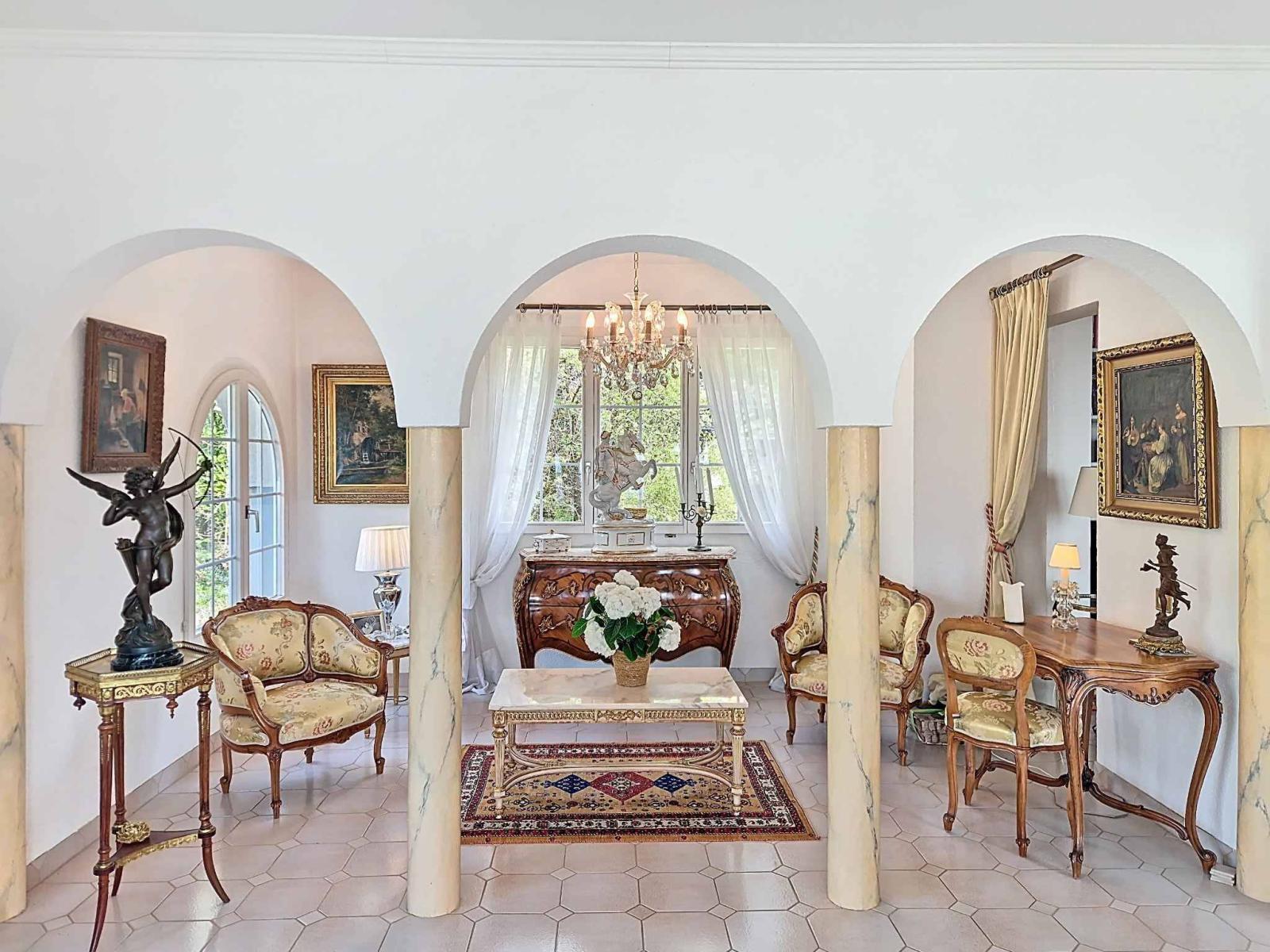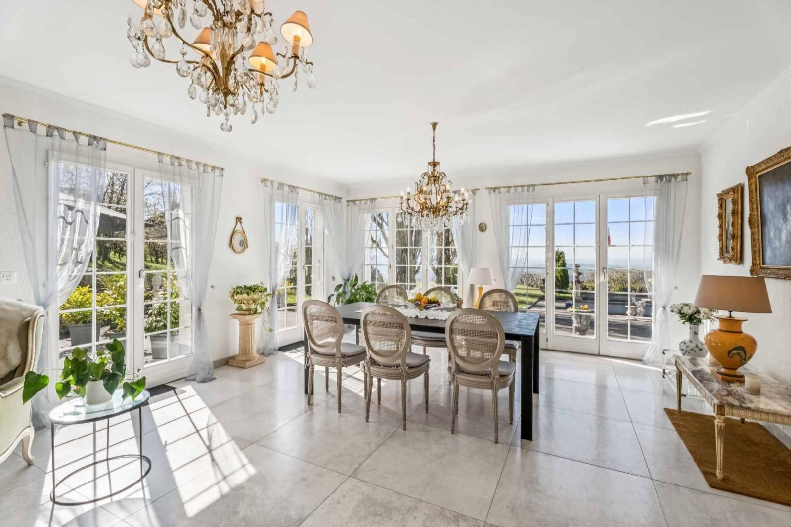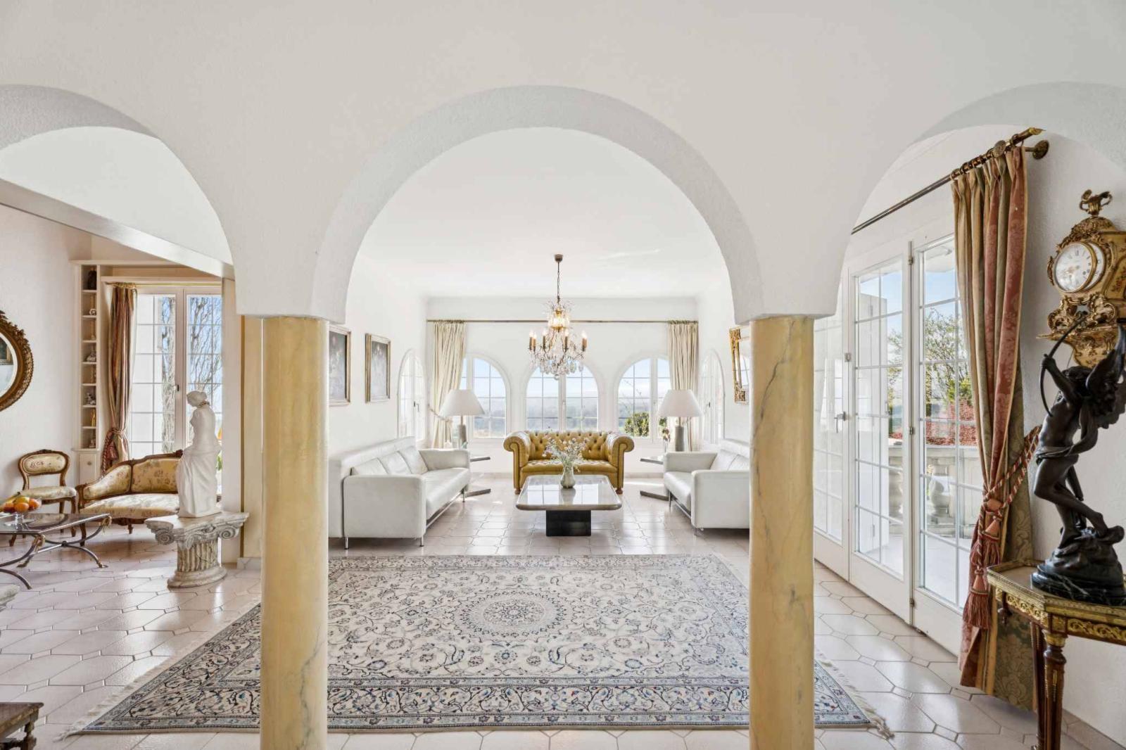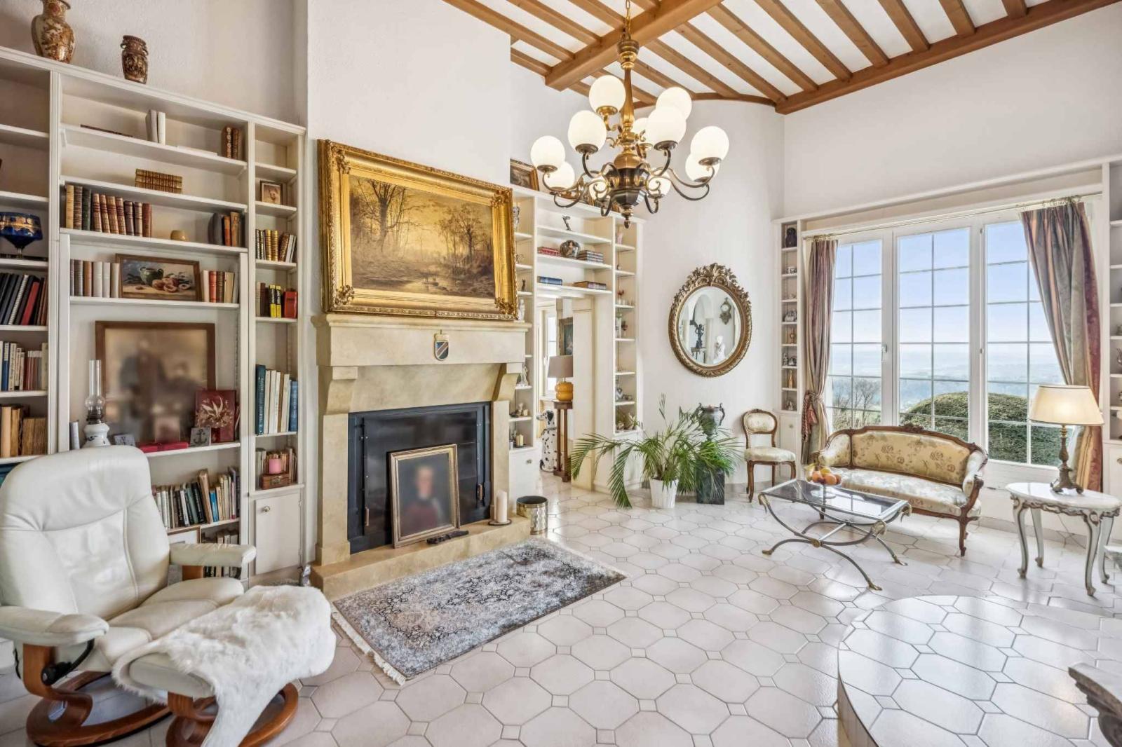 Das Haupthaus, bekannt als „Le Châtelet“, besticht durch seine einzigartige Architektur und Authentizität. Erbaut 1972 und 2007 renoviert, bietet es ca. 2.031 m³ Wohnfläche und ist um einen eleganten zentralen Turm angeordnet, der über eine Wendeltreppe erreichbar ist. Die großzügigen Proportionen und die harmonische Raumaufteilung schaffen eine warme und unverwechselbare Atmosphäre. Der Charme des Anwesens offenbart sich in zahlreichen dekorativen Elementen wie Stucktürrahmen, mehreren Kaminen und einem bemerkenswerten Delfter Ofen – wahre Kennzeichen eines Hauses mit Charakter. Die lichtdurchfluteten Wohnbereiche bieten jeweils einen spektakulären Blick auf den Neuenburgersee, die Alpen, den Jura und das umliegende Plateau und schaffen so einen fließenden Übergang zwischen Innen- und Außenbereich.