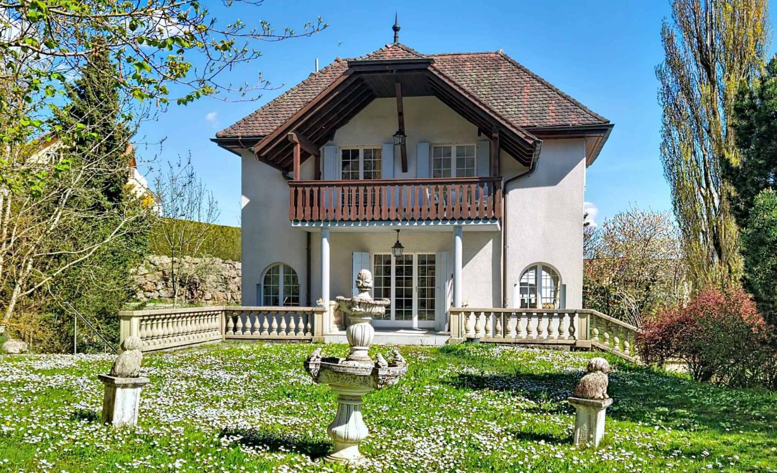 Mit Blick auf die Ebene, den Neuenburgersee und die Alpen genießt dieses außergewöhnliche Anwesen eine privilegierte Lage auf den Höhen von Villars-Burquin. Eingebettet in eine ruhige, grüne Umgebung, profitiert es das ganze Jahr über von bemerkenswertem Sonnenschein und atemberaubenden Panoramablicken auf die umliegende Landschaft. Das seltene Anwesen, erbaut auf mehreren Grundstücken mit einer Gesamtfläche von ca. 4.656 m², bietet ein einzigartiges Wohnumfeld, das Privatsphäre, Weitläufigkeit und Natur harmonisch vereint. Es besteht aus einem charaktervollen Haupthaus, ergänzt durch Garagen und sorgfältig gestaltete Außenbereiche.