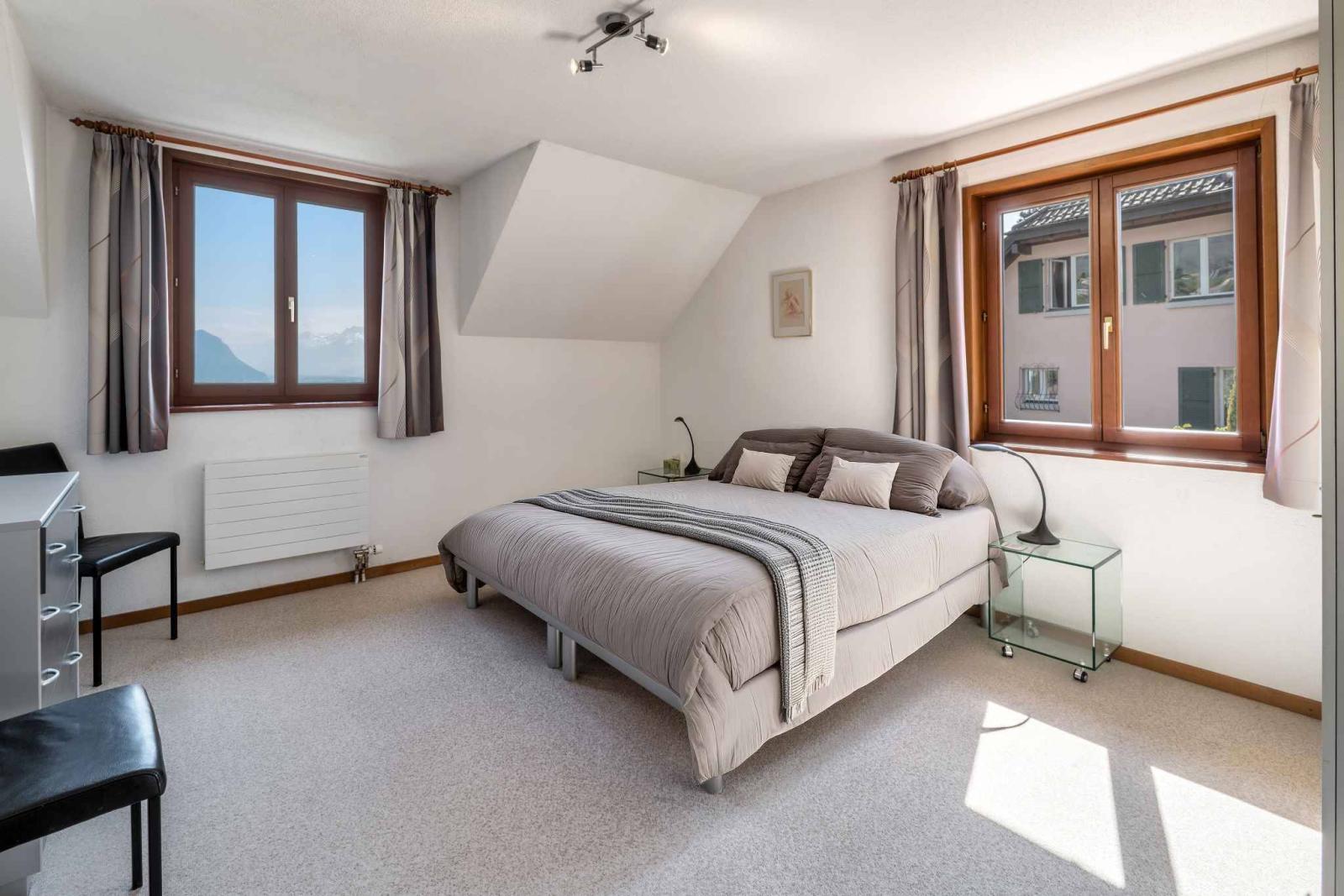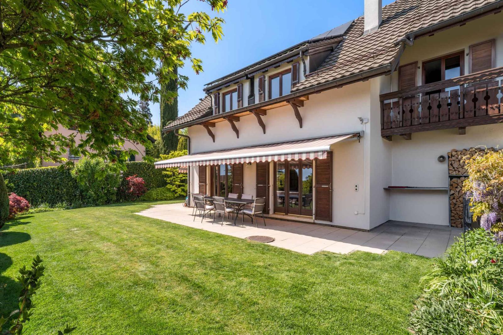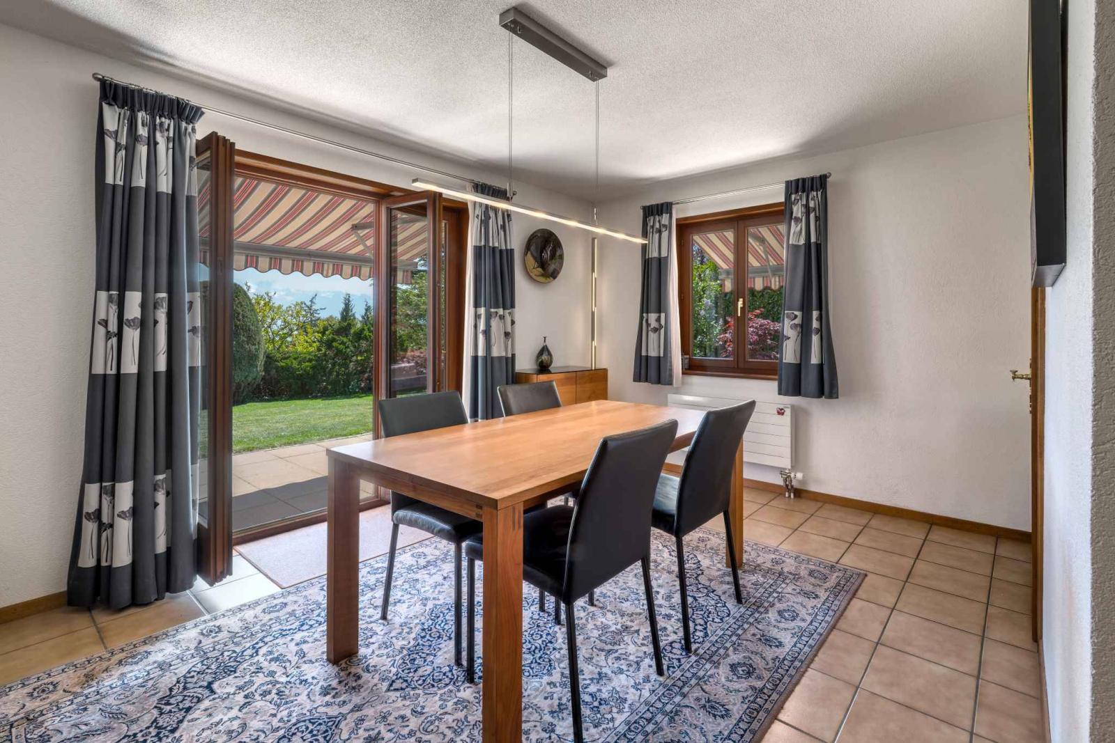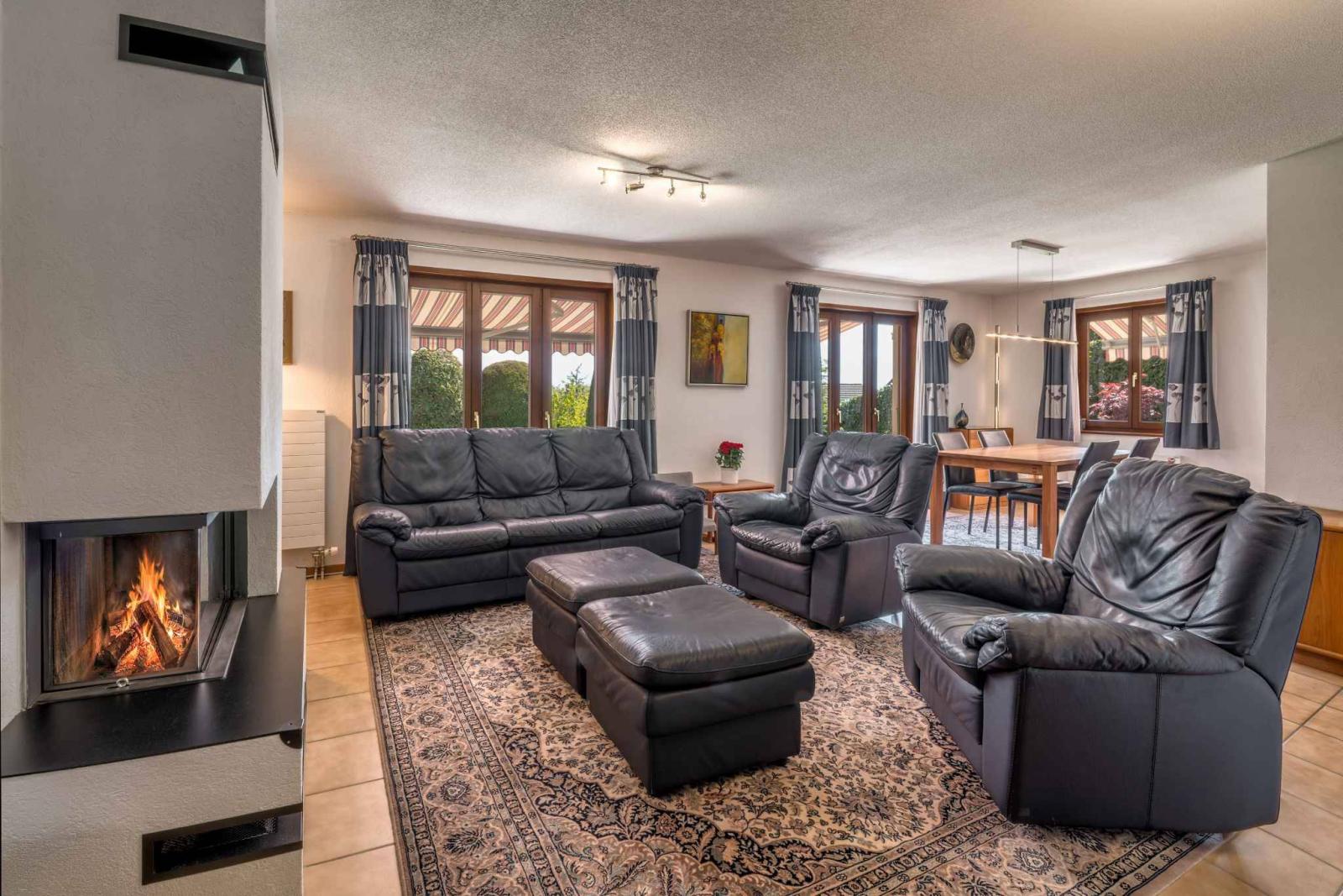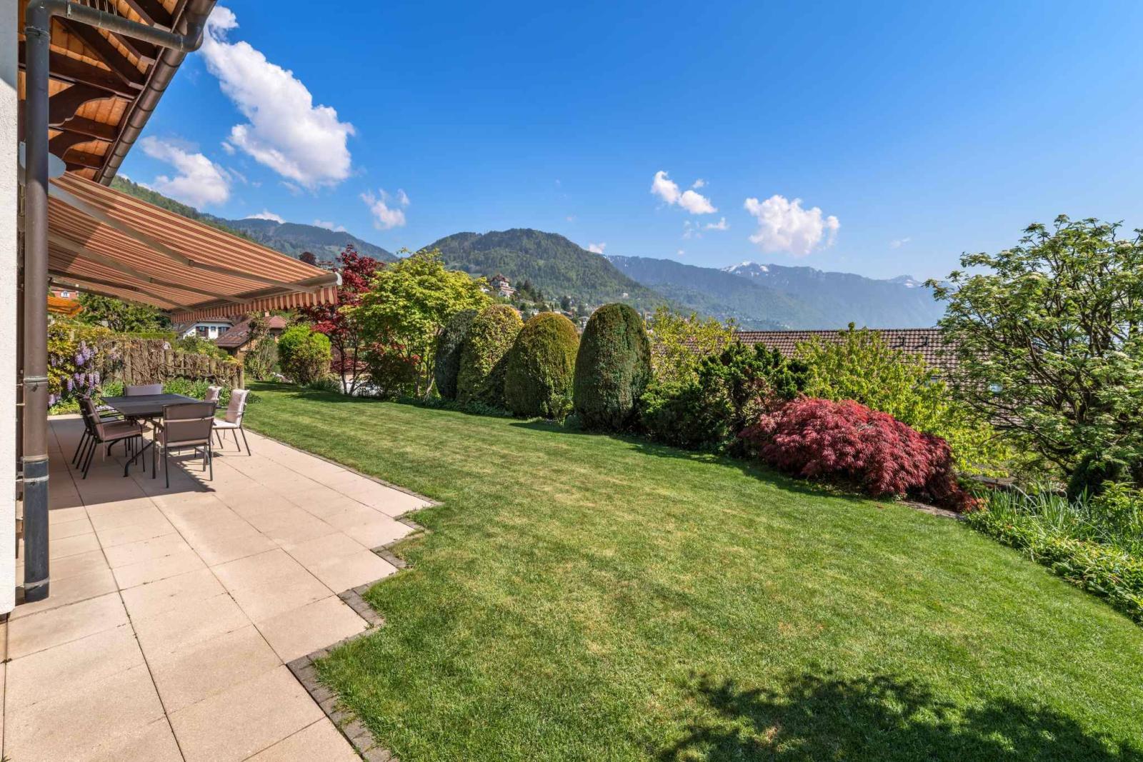 Mit einer Gesamtnutzfläche von ca. 245 m², davon 166 m² Wohnfläche, bietet das Anwesen großzügige Proportionen, eine harmonische Raumaufteilung und optimale natürliche Beleuchtung den ganzen Tag über. Die komfortablen und gut gestalteten Wohnbereiche öffnen sich zum herrlichen Garten, während das Obergeschoss einen atemberaubenden, unverbauten Blick auf See und Berge bietet.