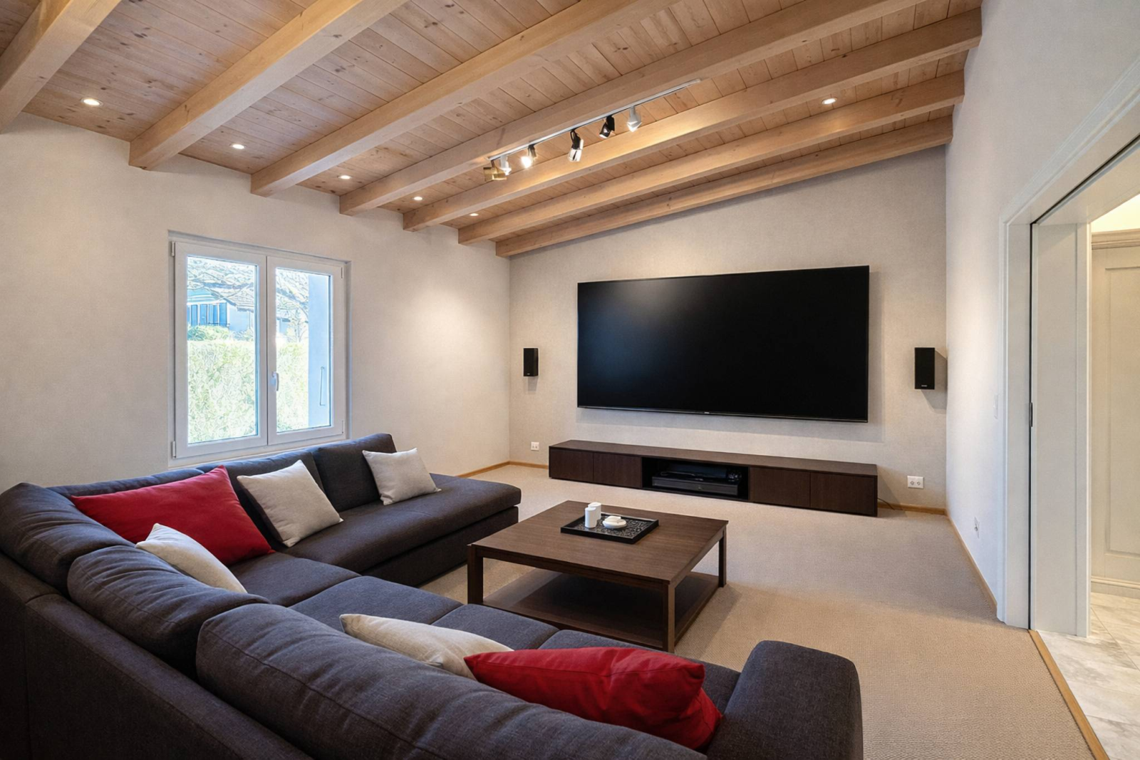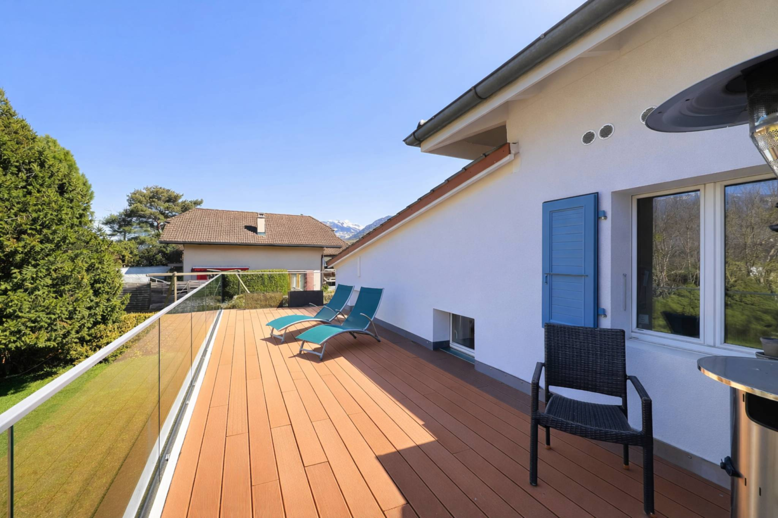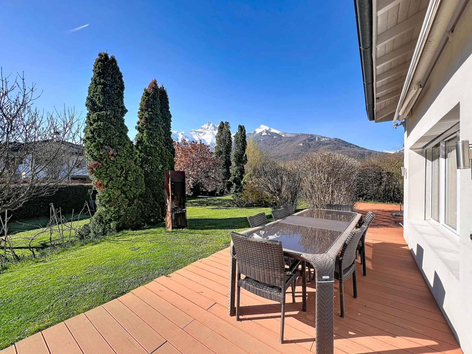 Im Obergeschoss befinden sich außerdem zwei Schlafzimmer, ein schönes Badezimmer, ein großes Wohnzimmer und eine separate Küche, die sich beide zu einer geschlossenen und beheizten Veranda öffnen und einen unverbauten Blick auf die Dents du Midi bieten.