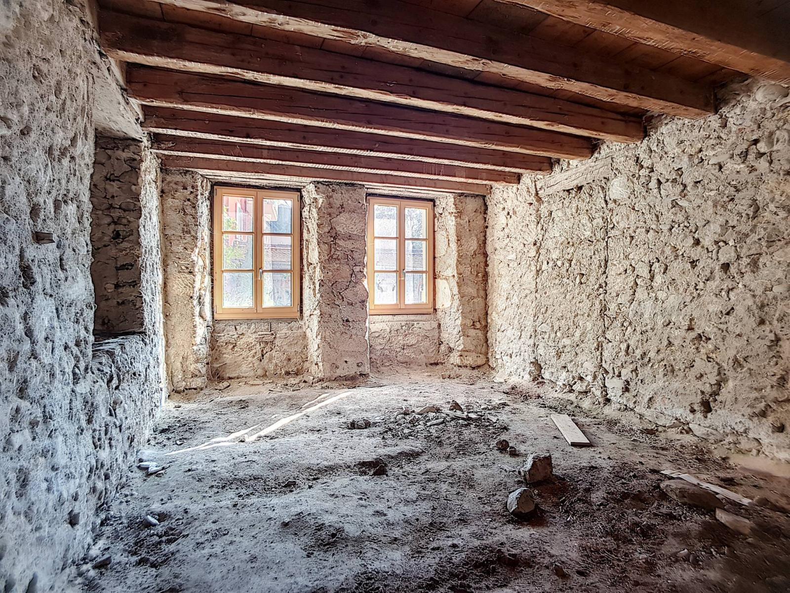 Der Innenraum befindet sich im Rohzustand und erfordert eine vollständige Fertigstellung.